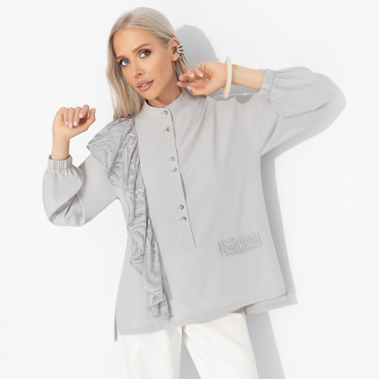 Блуза от CHARUTTI всем своим видом желает вам продуктивной недели. Пусть дни будут свободными, как крой этой блузы и наполнены нежностью кружева. Пусть выходные будут удлиненными, как фасон изделия и в каждом дне будет место маленькой, как пуговица блузы, радости. Блуза свободного кроя. Воротник-стойка. Манжеты рукавов оформлены скрытой резинкой. Акцентное тонкое кружево с двух сторон изделия – по передней стороне и по спинке. Имитация кармана с одной стороны блузы.