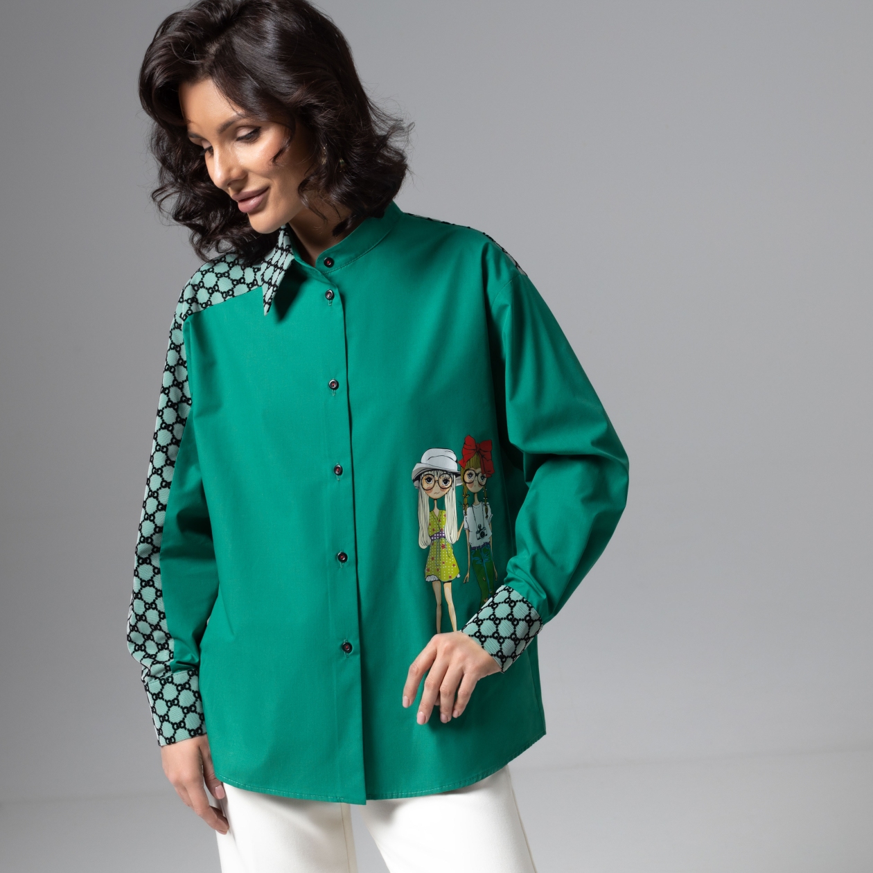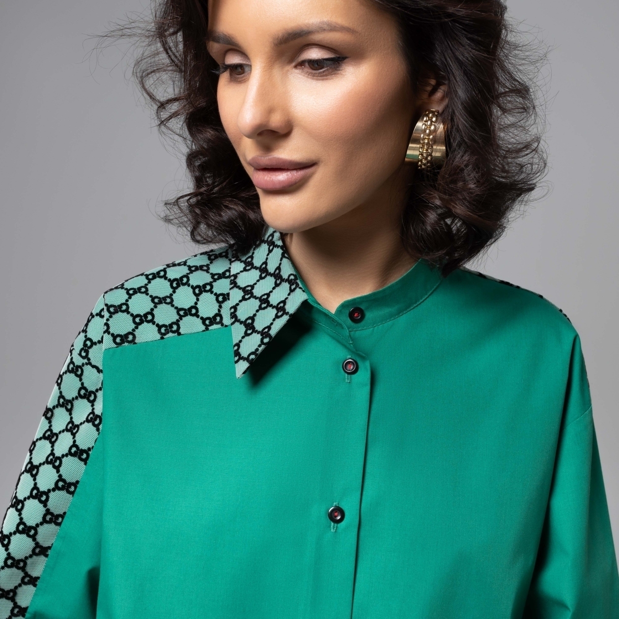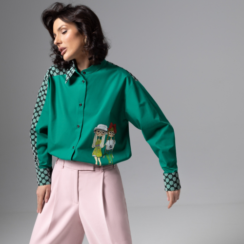 Быть уникальной в рубашке CHARUTTI из коллекции PREMIUM. Дорогой изумрудный цвет и детали... Никуда без деталей. Рубашка классического кроя из комбинации разных видов материла, материал декора – сетка с бархатистым нанесением узора. Высокое качество печати принта на ткани. Контрастная фурнитура. Пуговицы пришиты контрастными красными нитками. Ворот асимметричный – комбинация воротника-стойки и классического.
