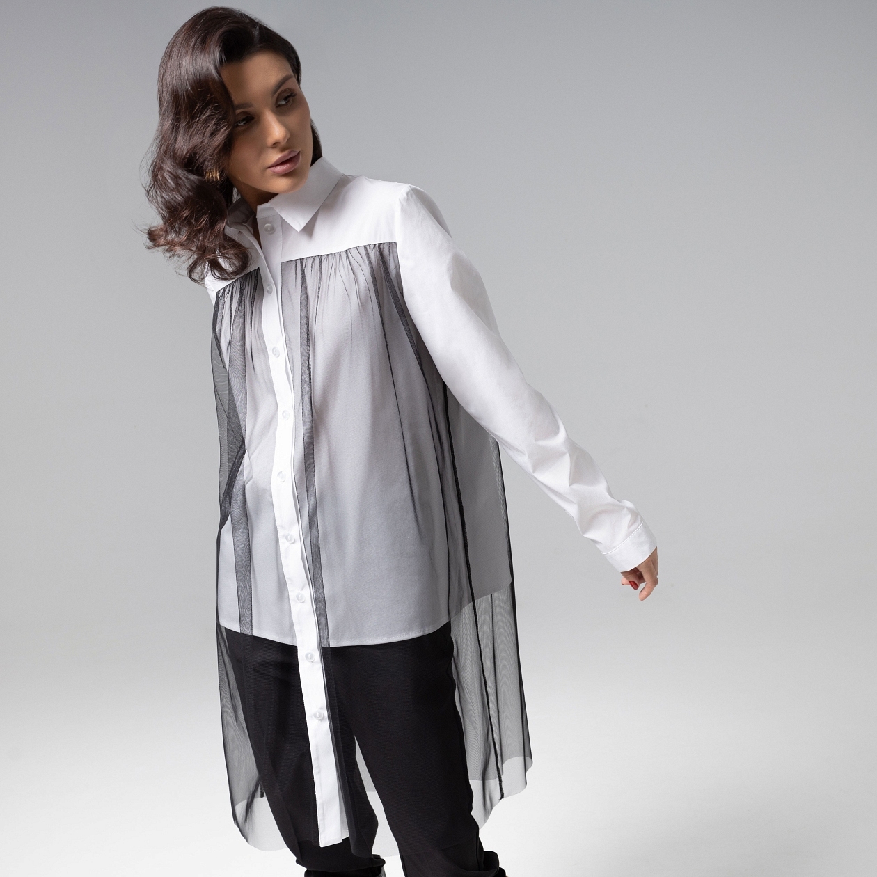 Больше, чем просто классическая белая рубашка. Основной слой из премиального хлопка мягко формирует силуэт, сохраняя идеальную форму, а воздушный сетчатый слой, ниспадающий до колена, добавляет лёгкую графичность и объём. Безукоризненный пошив и продуманные детали подчёркивают статусность вещи. Это не просто рубашка – это инвестиция в безусловную эстетику, где каждая линия работает на ваш безупречный образ. Рубашка классического силуэта с верхним удлиненным слоем из сетчатой ткани. Сетка прошита с двух сторон изделия.