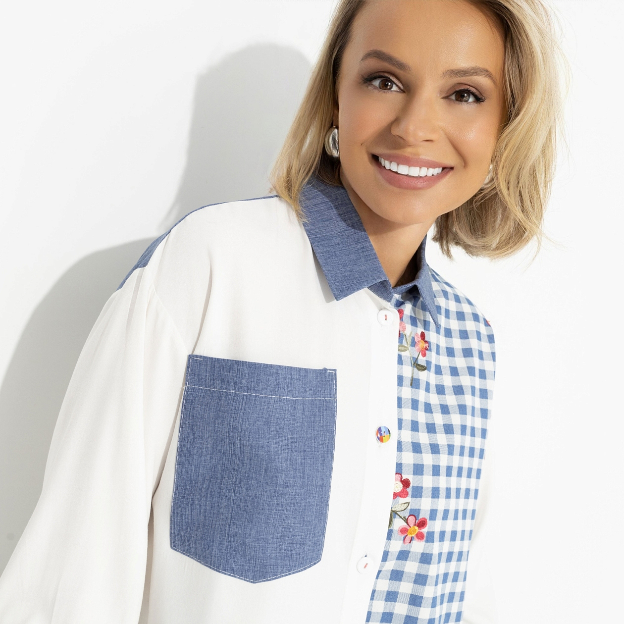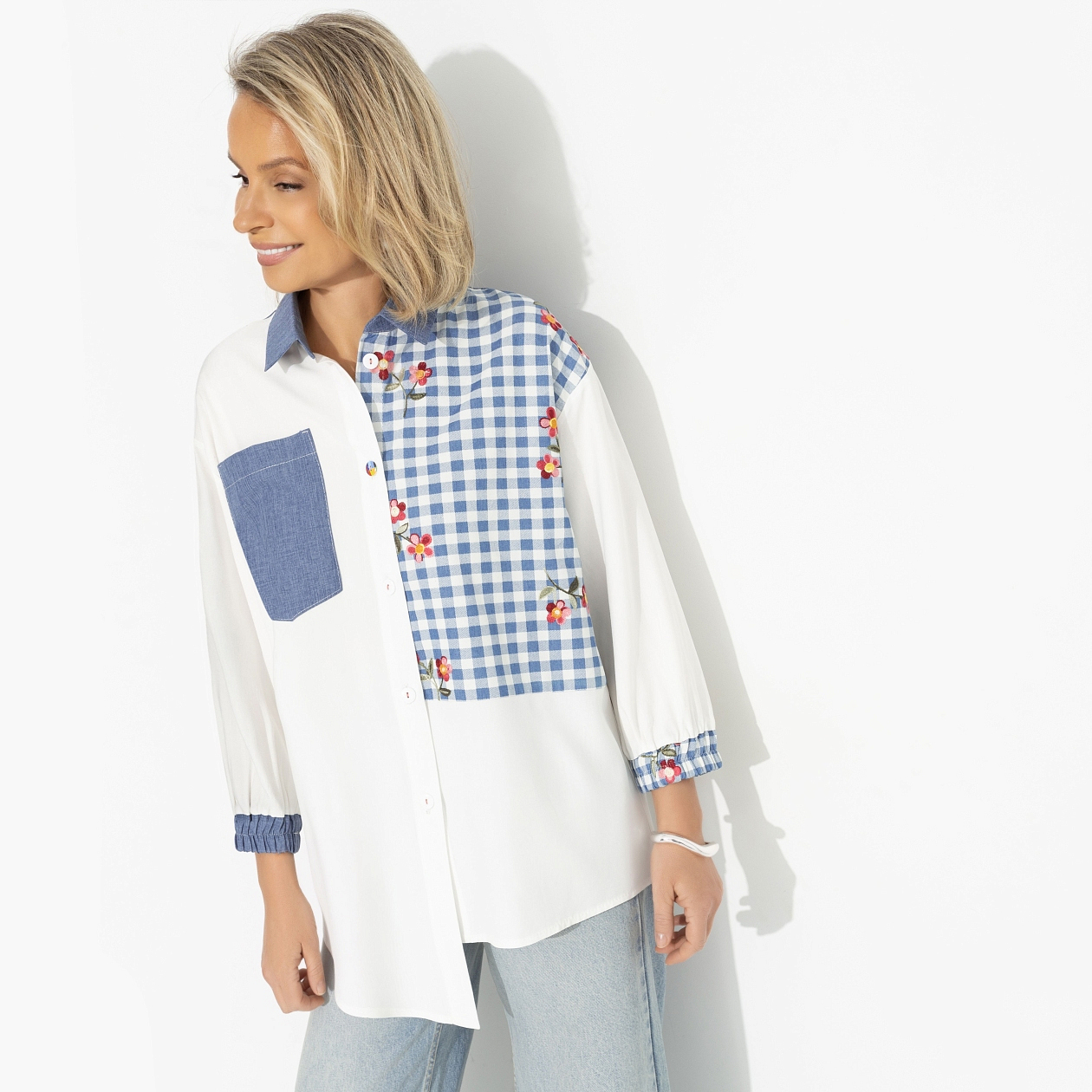 Та самая дочка маминой подруги. Улыбка сияет, вежливость на максимум, одета с иголочки. Поддерживай образ всеобщей любимицы в рубашке CHARUTTI. Рубашка свободного кроя с ассиметричным низом. Рукав укороченный, оформлен широкой скрытой резинкой. Изделия дополнено вставками из акцентного материла. Изделие хорошо смотрится в заправленном виде и навыпуск.