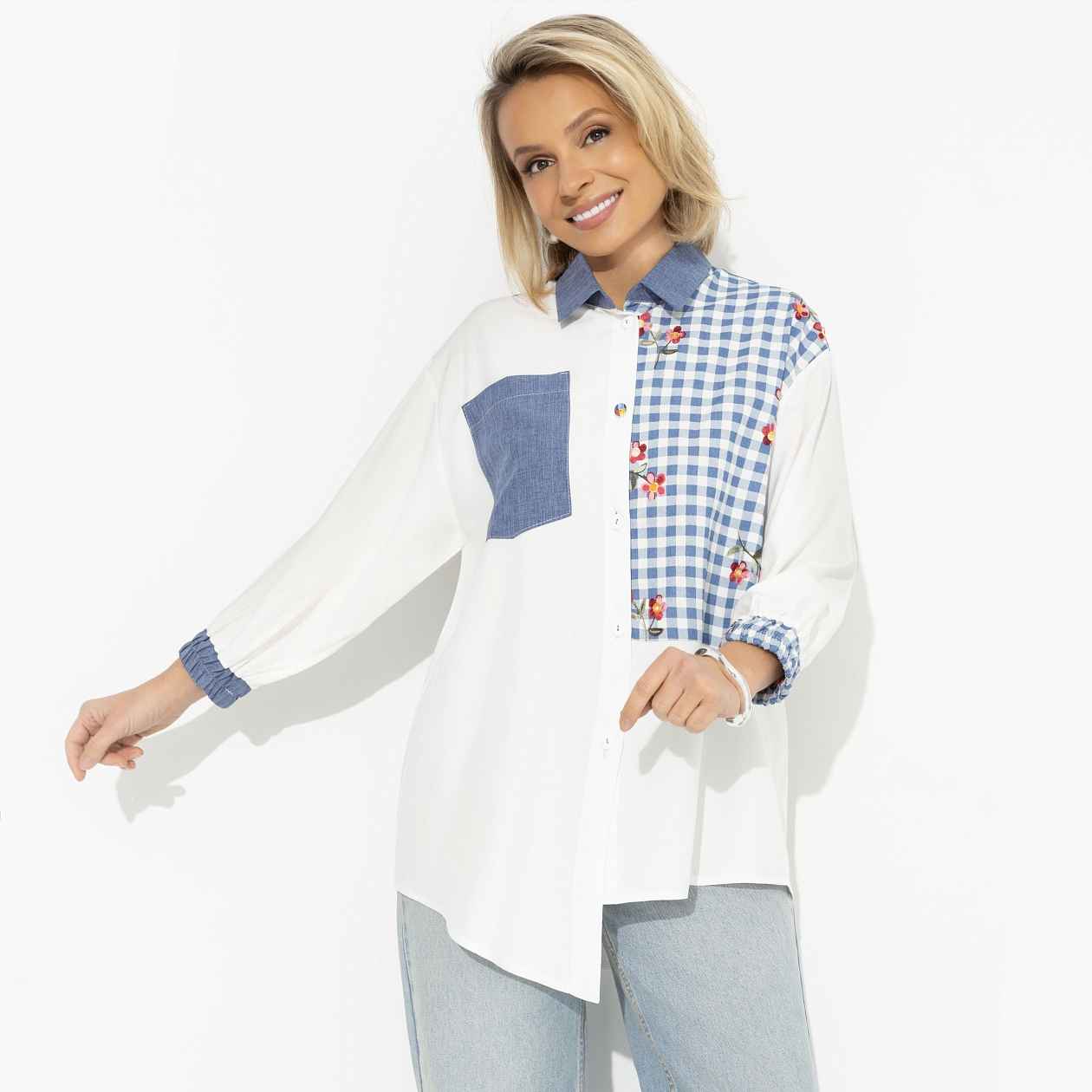 Рубашка комбинированная «Жемчужина образа (white)» — это воплощение элегантности и комфорта, идеально подходящее для женщин, стремящихся к совершенству в своём стиле. Воплощая образ «дочки маминой подруги», эта рубашка сочетает в себе классическую белизну и современные акценты. Свободный крой и асимметричный низ добавляют динамики и делают её подходящей как для повседневного, так и для делового гардероба. Укороченный рукав с широкой скрытой резинкой создаёт изысканный и завершённый вид. Эта рубашка белая женская станет жемчужиной вашего образа, добавляя нотку роскоши и утончённости в каждый ваш день.