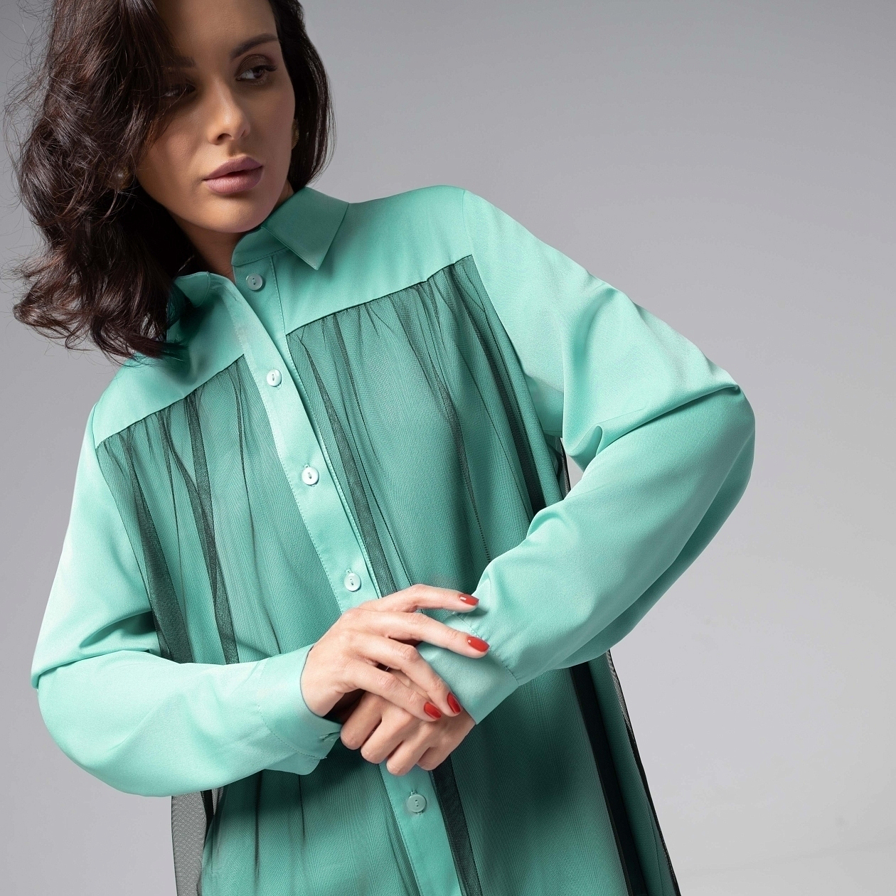 Классическая рубашка? Да ну, забудьте. Эта рубашка не просто одежда – она ваш PR-менеджер. Бирюза, лёгкость сетки и строгий крой слились в идеальное трио. В этой рубашке легко поверить: обложка журналов ждёт именно вас. Акцентная деталь из тонкой сетки придает образу лёгкость и утонченность, сохраняя при этом благородную сдержанность кроя. Рубашка удлиненная.