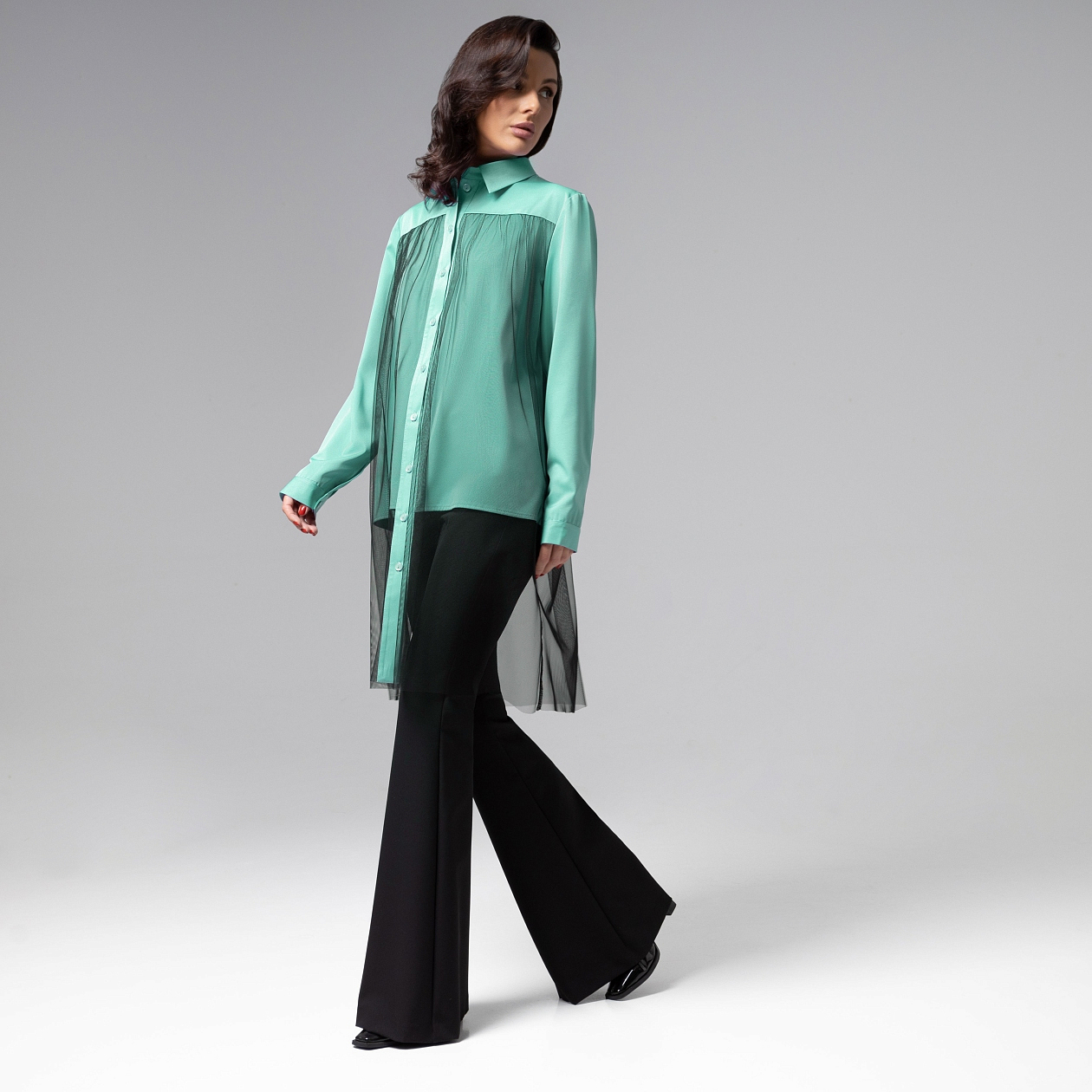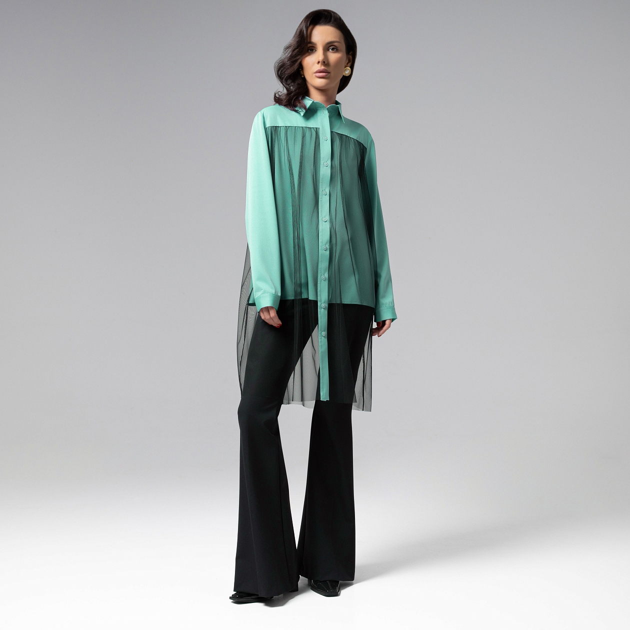 Классическая рубашка? Да ну, забудьте. Эта рубашка не просто одежда – она ваш PR-менеджер. Бирюза, лёгкость сетки и строгий крой слились в идеальное трио. В этой рубашке легко поверить: обложка журналов ждёт именно вас. Акцентная деталь из тонкой сетки придает образу лёгкость и утонченность, сохраняя при этом благородную сдержанность кроя. Рубашка удлиненная.