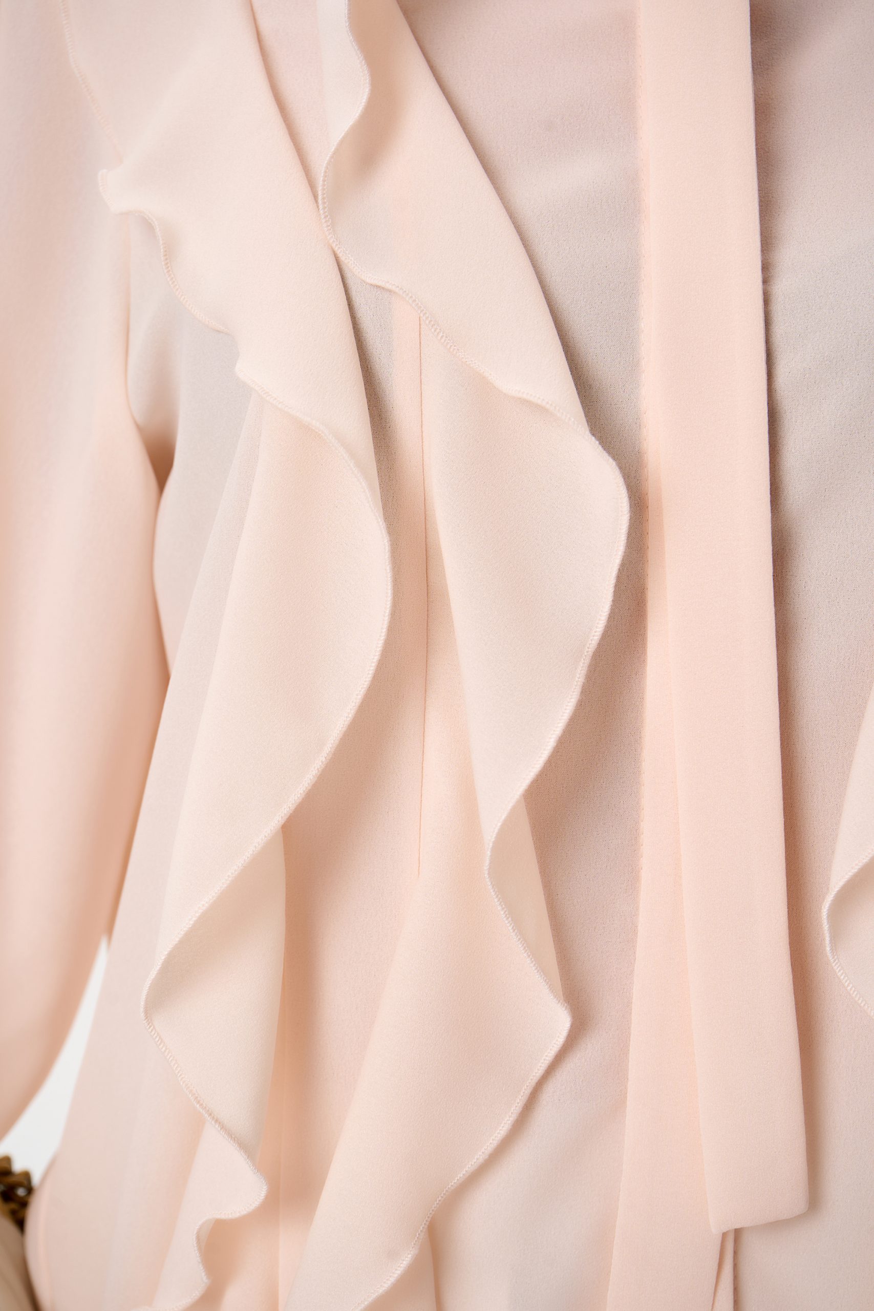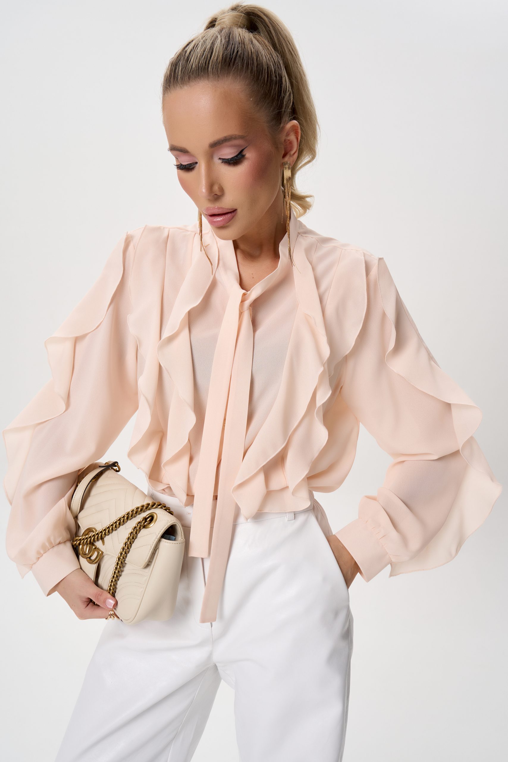 Элегантная блузка с архитектурными воланами — современное прочтение женственности и лёгкости. Модель сочетает выразительный дизайн и комфортную посадку, создавая утончённый силуэт, который одинаково уместен как в деловом гардеробе, так и в вечерних образах. Воздушная фактура ткани мягко движется при каждом шаге, добавляя образу динамику и изысканность.