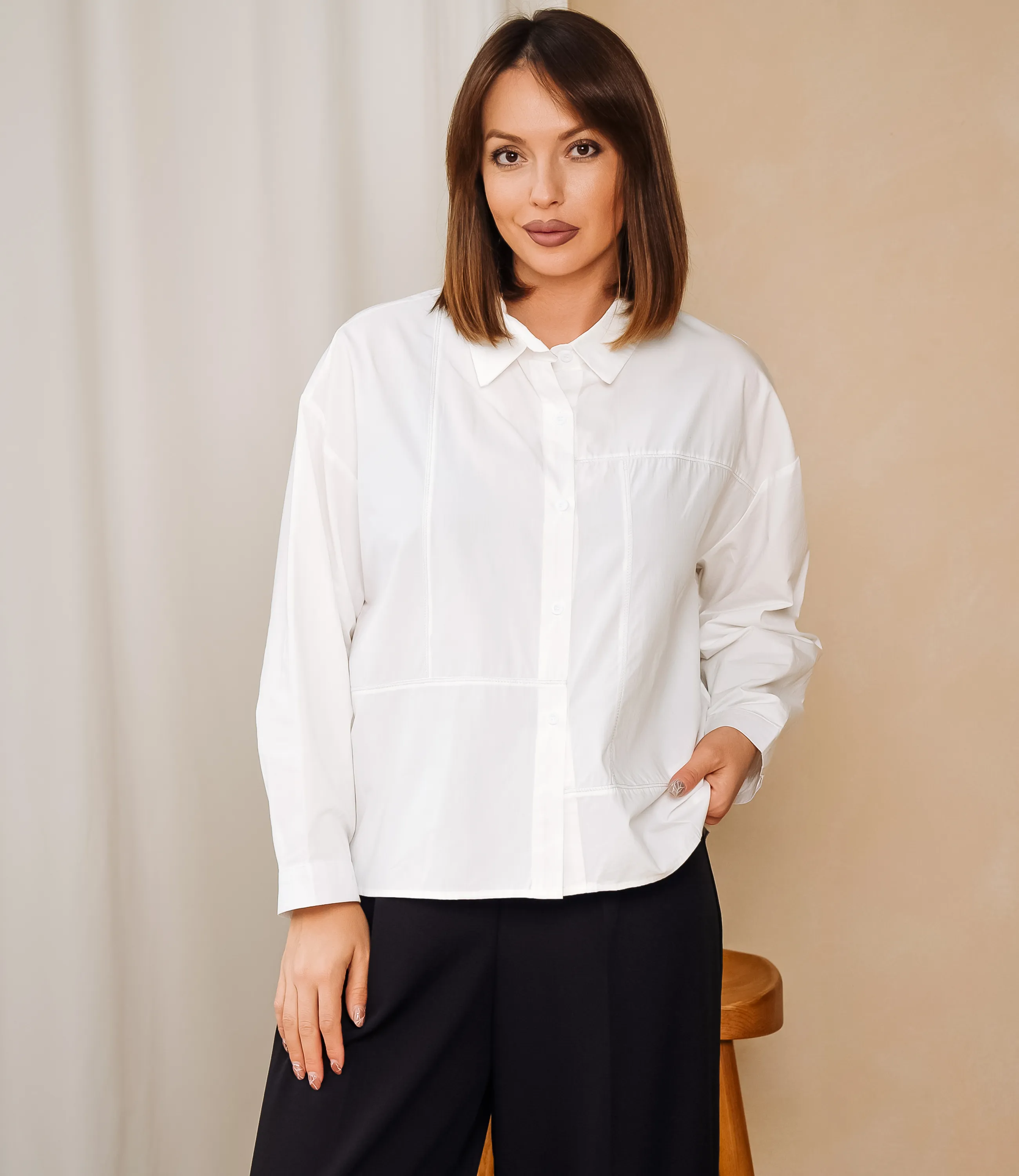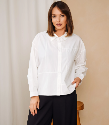 Рубашка — это часть гардероба, которая подчёркивает женственность и стиль каждой женщины. Свободный рубашечный покрой с прямым силуэтом и слегка заниженной линией плеч, выполнена из плотной гладкой ткани средней плотности, имеет классический отложной воротник и центральную застежку на ряд функциональных пуговиц, передняя часть оформлена декоративными накладными строчками, образующими геометрические панели и создающими эффект секций, рукава длинные с аккуратными манжетами, низ изделия прямой с аккуратной подгибкой, швы внешние выделены контрастной прострочкой, карманов нет, посадка свободная, обеспечивает комфорт и легкую драпировку, модель выглядит минималистично с элементом графичности, подходит для повседневного и офисного образа. Для пошива использована ткань 95% хлопок, 5% спандекс. Такая комбинация обеспечивает натуральную дышащую основу и приятную фактуру за счёт хлопка, а спандекс придаёт необходимую эластичность и хорошее восстановление формы. Рубашка сохраняет аккуратный вид и форму после многократных стирок, что снижает долю возвратов и важно для розничных продаж. Цвет и фактура соответствуют фотографии на сайте. На странице представлена таблица размеров, с помощью которой вы сможете грамотно сформировать ассортимент по размерам и цветам. Производитель гарантирует аккуратную отделку и надёжную фурнитуру. Предложенные оптовые условия позволяют получить привлекательную маржинальность для магазинов. Рекомендуем включить эту рубашку в ваш ассортимент — она станет востребованным предложением для клиенток, ищущих универсальную и стильную вещь.