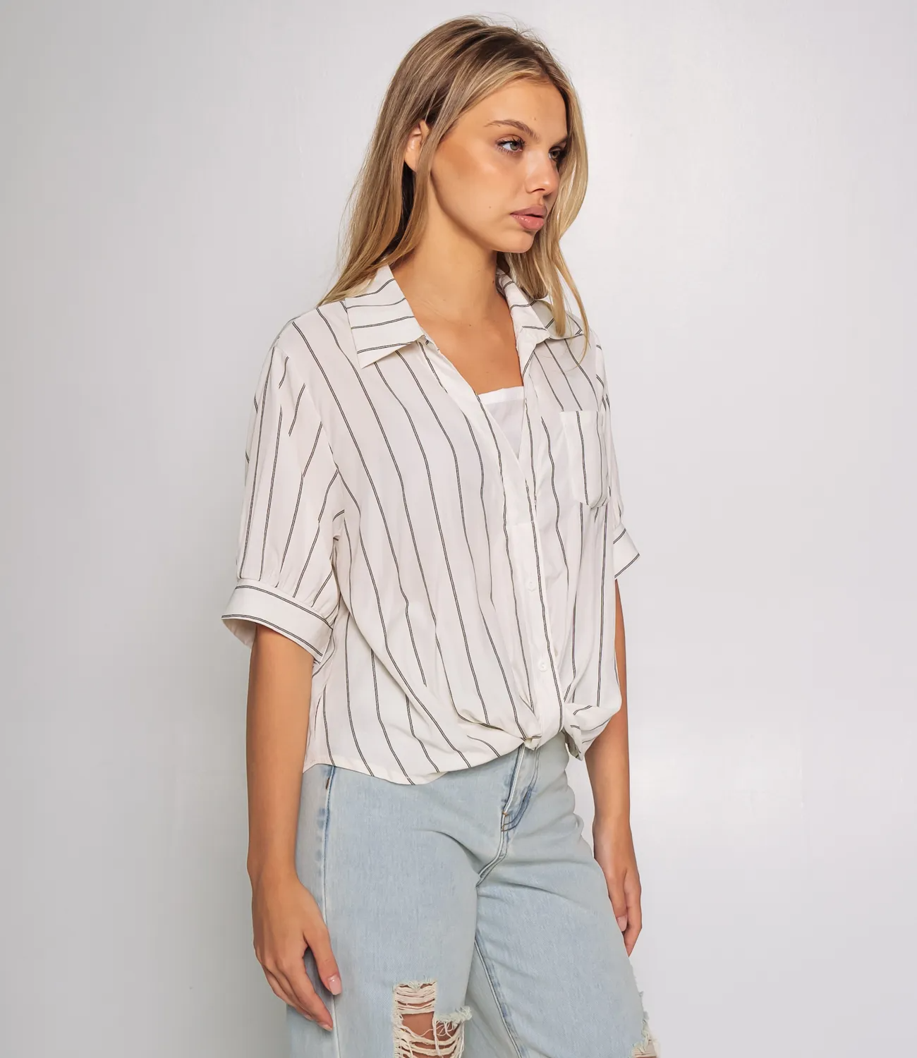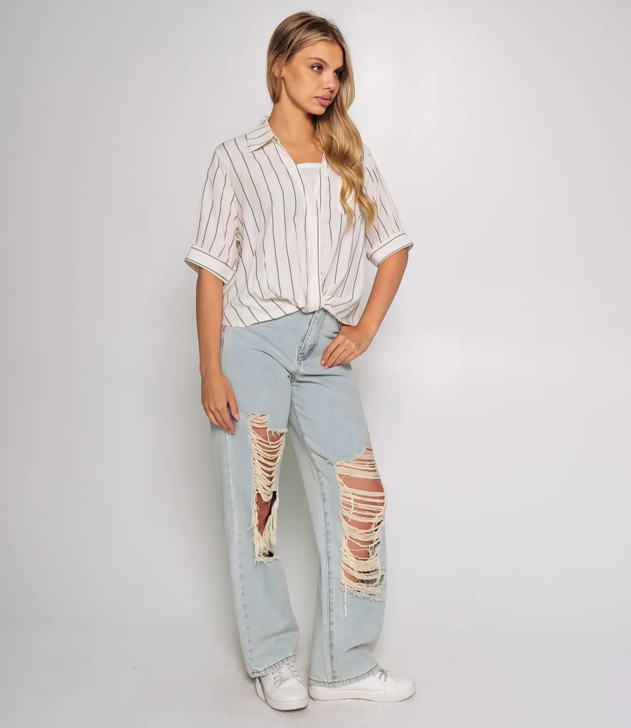 Рубашка — это ключевой элемент гардероба, который способен подчеркнуть уникальность и стиль каждой женщины. Эта модель станет настоящим хитом среди ваших покупателей, благодаря своему современному дизайну и высокому качеству. Изготовленная на 100% из легкой ткани с вертикальным узором в виде тонких полосок, рубашка дарит комфорт и позволяет коже дышать в любое время года. Свободный крой и короткие рукава, заканчивающиеся широкими манжетами, делают рубашку идеальной для создания непринужденного и стильного образа. Классический воротник и застежка на пуговицы придают изделию аккуратность и элегантность. Накладной карман на груди добавляет детали и функциональности, завершая этот привлекательный образ. Необычный нюанс — рубашка застегнута не полностью, что создает расслабленный и модный вид. Нижняя часть модели аккуратно присборена или может быть заправлена, добавляя динамики и интересного эффекта в вашем наряде. Эта рубашка станет отличным выбором для повседневной носки, идеально сочетаясь как с джинсами, так и с брюками или юбками. Она привлечет внимание тех, кто ценит сочетание стиля и комфорта. Мы предоставили на сайте таблицу размеров, чтобы ваши клиенты могли легко выбрать идеальный размер и не сомневаться в своем выборе. Предложенная нами цена является доступной для оптовых закупок, что делает эту рубашку замечательным дополнением вашего ассортимента. Не упустите возможность предложить своим покупателям стильную рубашку, которая подчеркнет их индивидуальность и поможет создать множество образов! Рост модели 168 см., 89-63-90.