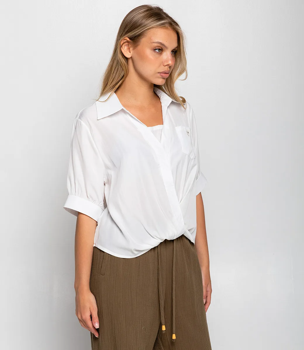 Рубашка из легкой ткани будет идеальным дополнением к летнему гардеробу любой женщины, подчеркивая её индивидуальность и стиль. Эта модель станет настоящим хитом в вашем магазине, привлекая внимание покупательниц своим современным дизайном и практичностью. Рубашка прекрасно подходит как для повседневных выходов, так и для более торжественных случаев, создавая элегантный и завершенный образ. Изготовленная на 100% из полиэстера, рубашка обеспечивает отличное сочетание легкости и прочности. Ткань дышит, сохраняет форму и легко стирается, что делает её идеальной для активного использования в летний период. Укороченные рукава средней ширины с отворотами добавляют нотку изящества, а классический воротник и застежка на пуговицы по всей длине придают изделию строгость и стиль. Спереди расположенный накладной карман и декоративный элемент являются интересными акцентами, которые привлекают взгляд. Фасон свободный с легким занижением в талии и узлом в нижней части создает непринужденность и позволяет отлично сочетать рубашку с различными низами — от шорт до юбок. Обратите внимание на цвета и текстуру, которые тщательно выбраны и полностью соответствуют фотографиям в каталоге. Для удобства ваших клиентов мы предоставили таблицу размеров на сайте, чтобы каждая покупательница могла легко найти идеальный вариант для себя. Предложенная нами цена делает эту рубашку доступной для оптовых закупок, что предоставляет отличную возможность для пополнения вашего ассортимента. Не упустите шанс предложить своим клиенткам стильное и универсальное решение для летнего сезона! Рост модели 168 см., 89-63-90