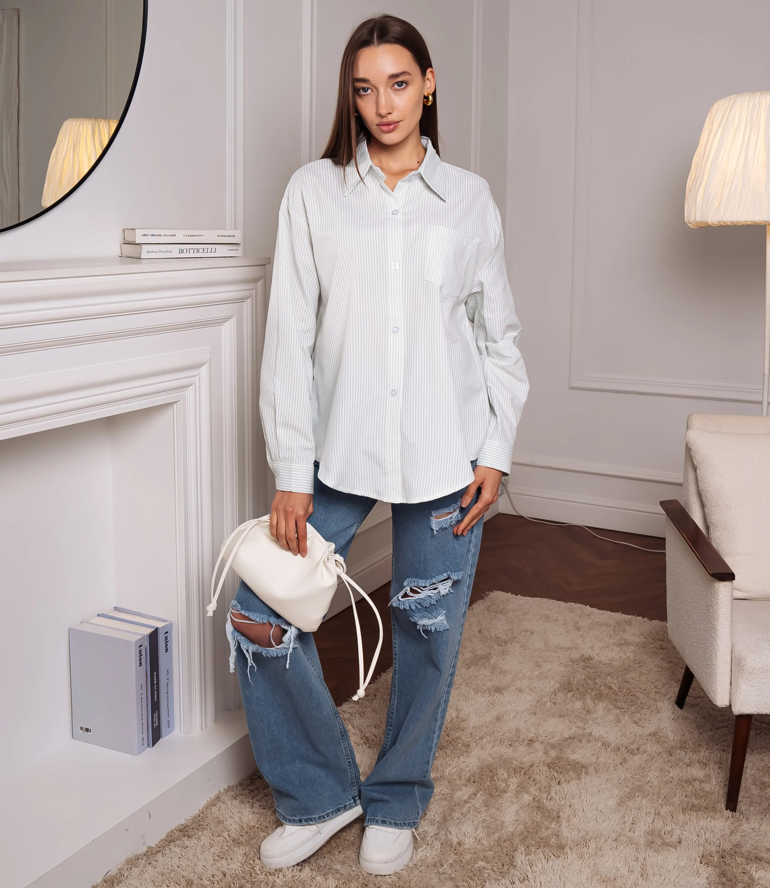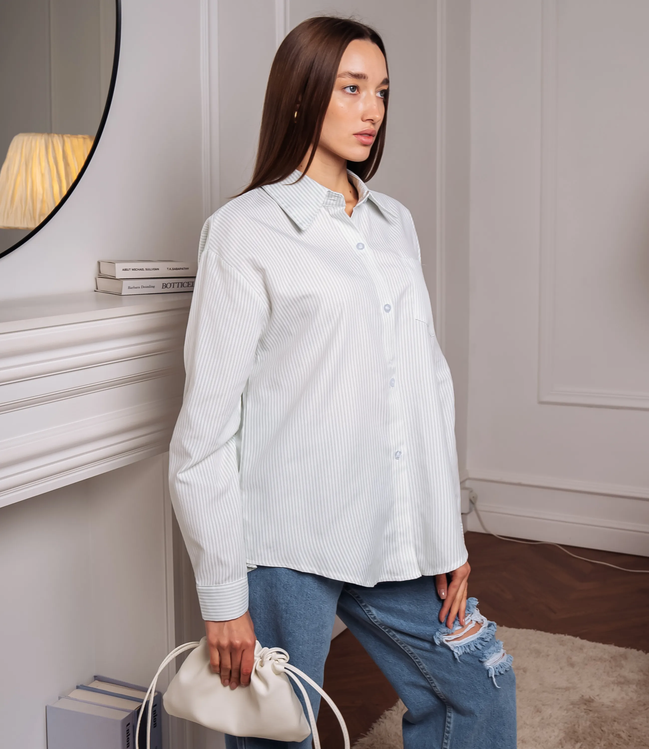 Рубашка - это часть гардероба, которая подчеркивает уникальность каждой женщины. Рубашка выполнена из лёгкой ткани в тонкую вертикальную полоску, свободного прямого кроя с чуть расширенным силуэтом снизу; длина спускает чуть ниже бёдер. Воротник классический с аккуратными лацканами, планка с пуговицами скрытая частично, с ровными строчками по линии застёжки. Плечи слегка опущены, рукава длинные, с прямым объёмом, заканчиваются широкими манжетами на пуговицу с продольной полоской по периметру манжета. Лиф ровный, без нагрудных вытачек, с едва заметной нагрудной петлёй или карманной складкой с левой стороны. Для пошива выбрана ткань из 80% полиэстера и 20% хлопок, которая выделяется безупречным качеством. Даже после многократных стирок рубашка не утратит первоначальной привлекательности. Вы обязательно будете носить ее с радостью. Обратите внимание на глубокий цвет. Он соответствует фотографии на сайте. Чтобы вы не сомневались в размере, мы предоставили на странице таблицу. Воспользовавшись ею, вы сможете самостоятельно сделать мерки и удостовериться. Установленная нами цена является невысокой. Не откажите себе в удовольствии быть элегантной! Рост модели 168, 85-63-92.