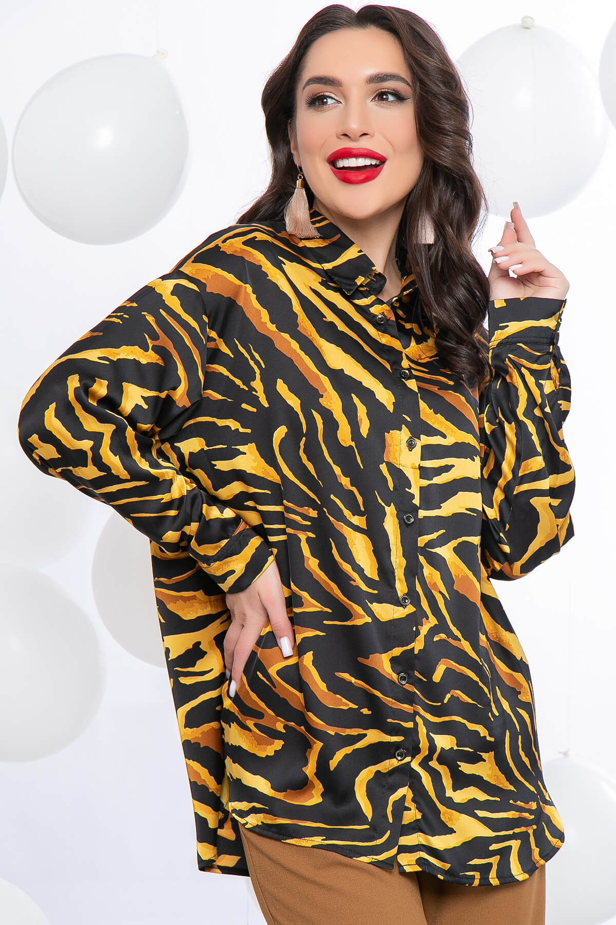 Рубашка с модным анималистическим оттенком будет отлично смотреться как отдельный элемент гардероба, так и в качестве дополнения к топам. Рукав длинный, втачной со спущенным плечевым швом, на манжете. Такая модель позволит скорректировать фигуру, так как по переду и спинке удлинена.
