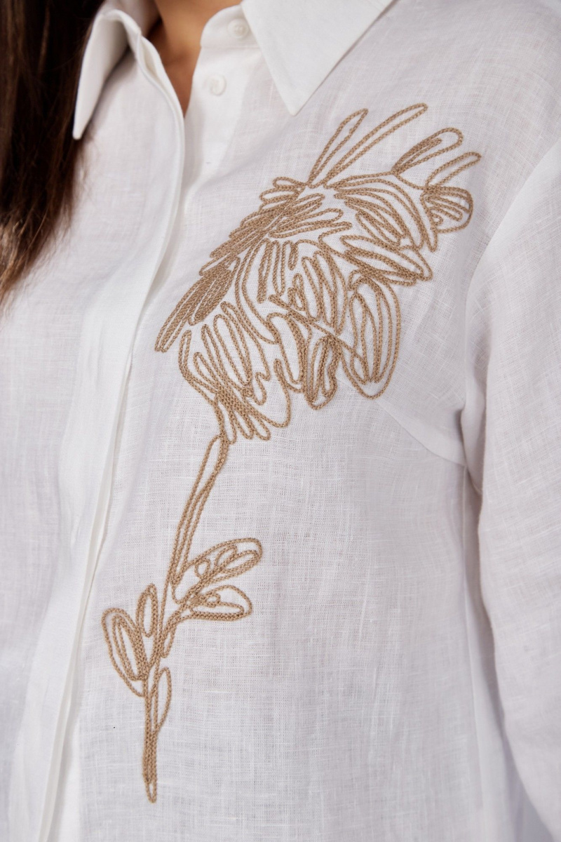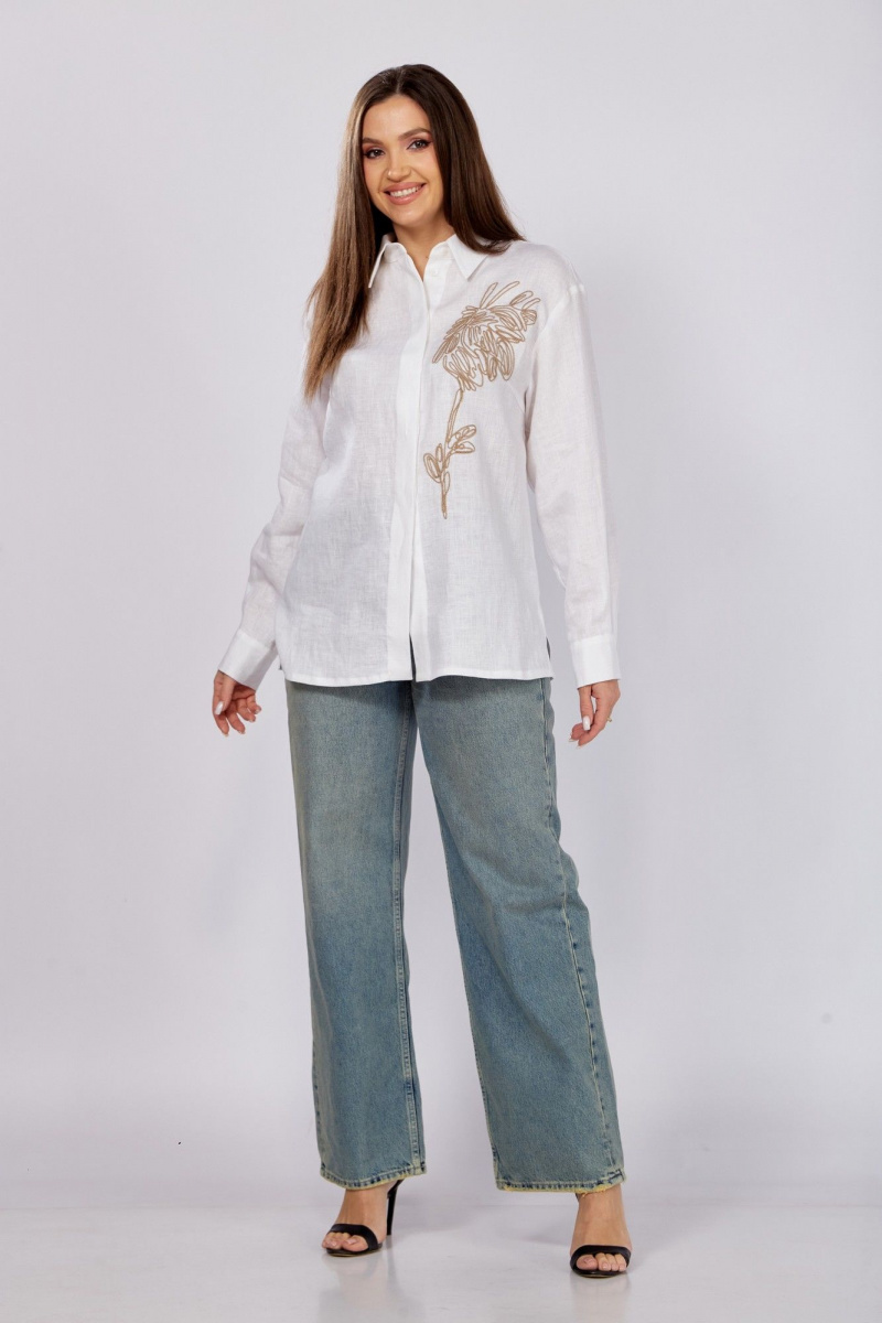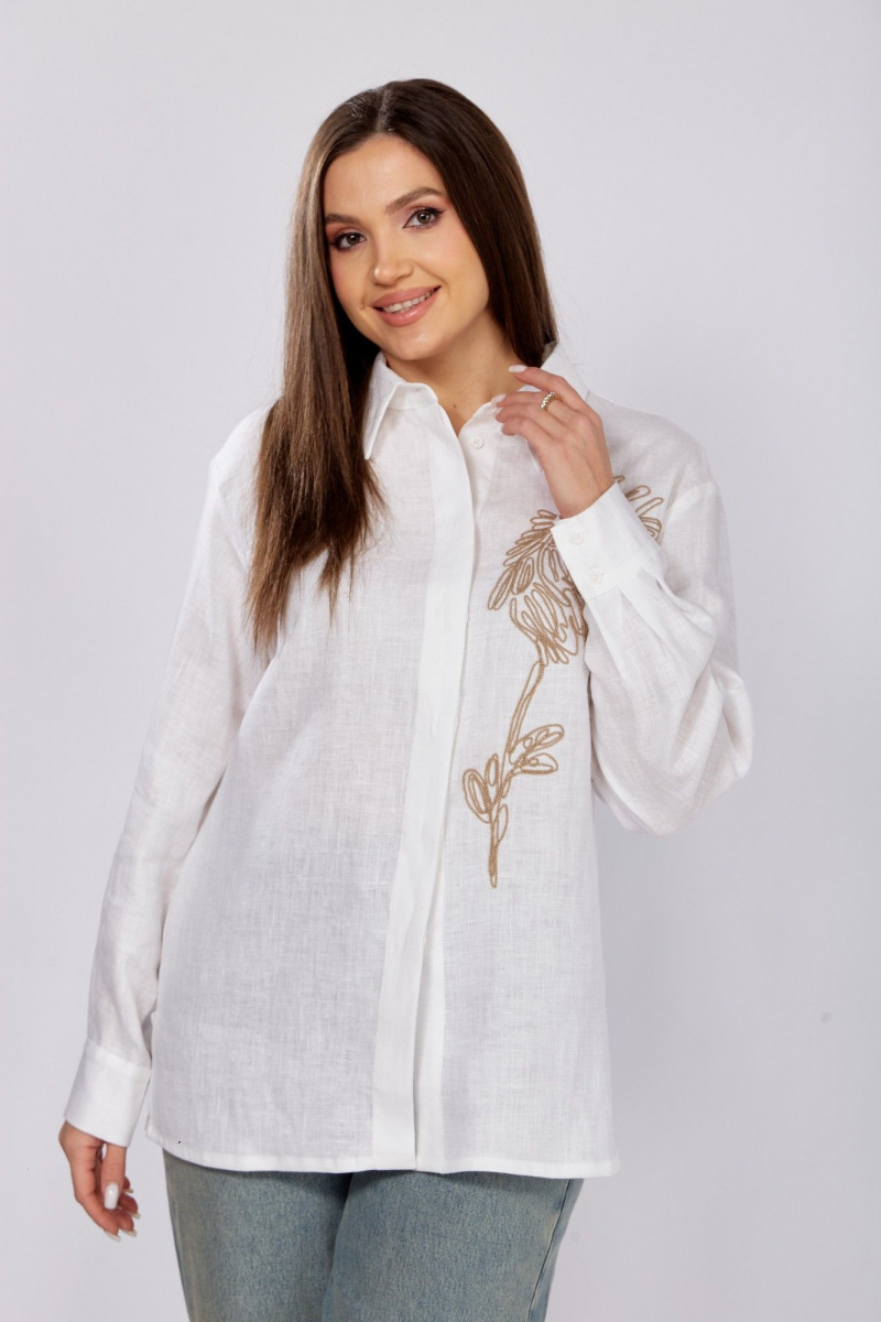 Блузка прямого силуэта.Спинка цельная, с декоративными защипами в области горловины.По переду нагрудные вытачки и декоративная вышивка шнуром .Застёжка потайная на петли и пуговицы.В боковых швах разрезы. Рукав втачной на манжете.Воротник с отрезной стойкой.