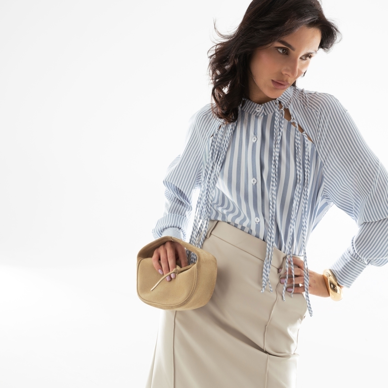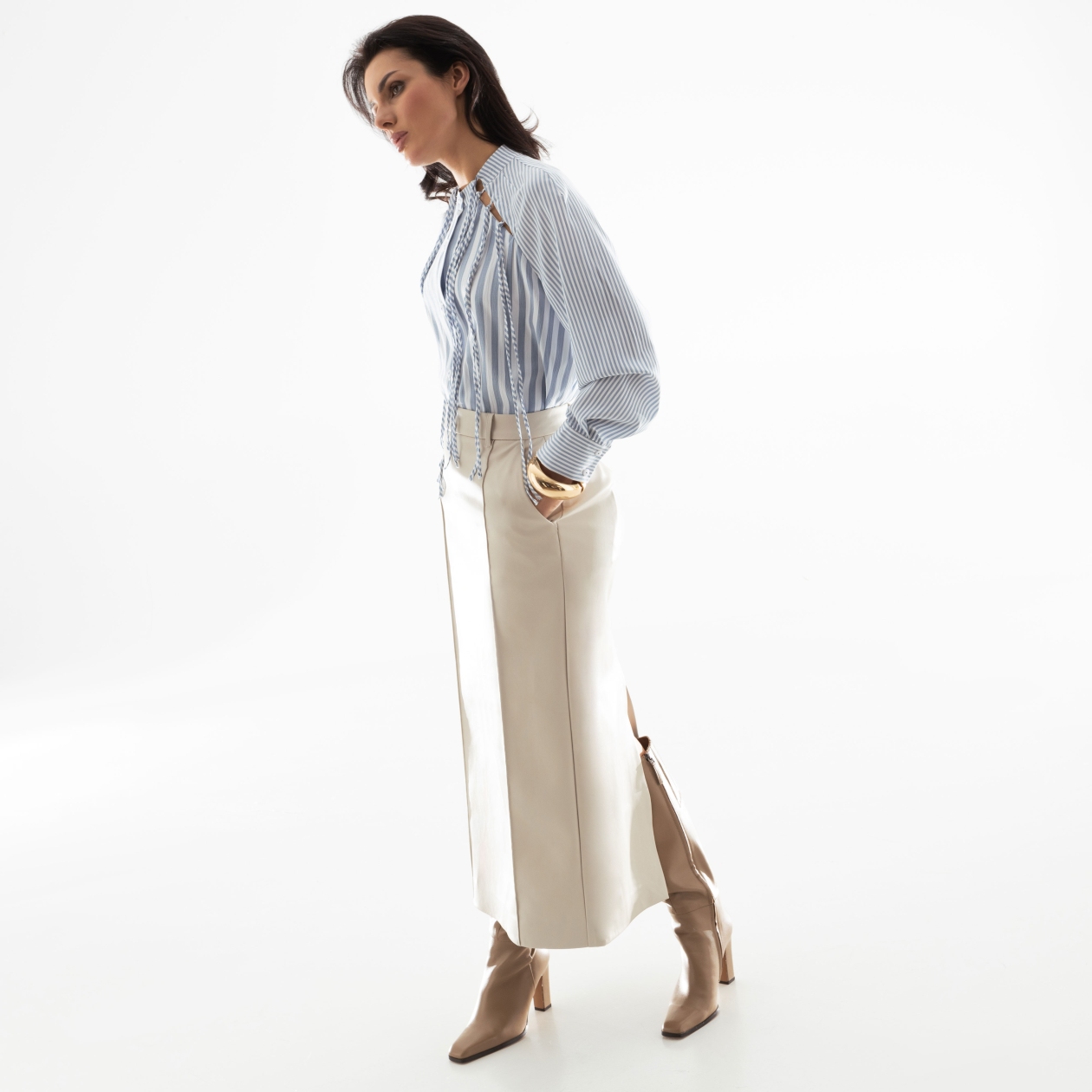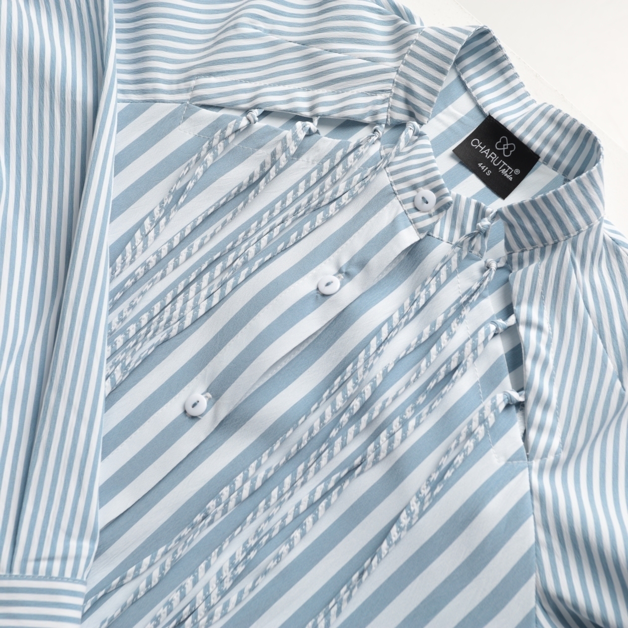 Разрезы под линией ключиц, декор ручной работы, ассиметричный крой – всё это делает рубашку произведением высокого швейного искусства. В тонкую трендовую полоску.