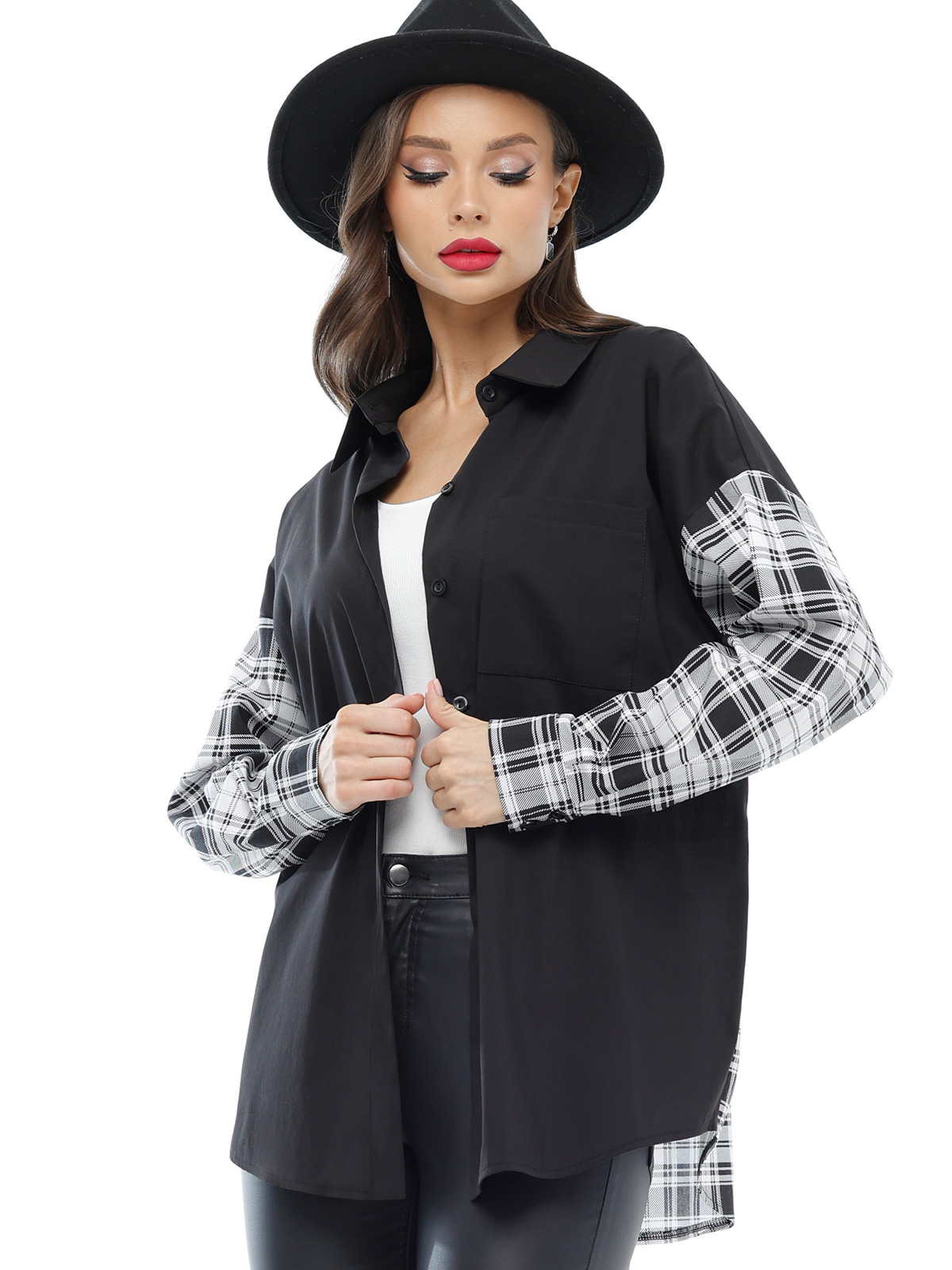 Комбин6ированная рубашка — отличный выбор для осени. Она стильная, удобная и функциональная. Удлинённая модель оверсайз подойдёт для любого образа. Классическая осенняя рубашка сшита из натурального хлопка. Закруглившийся низ добавляет лёгкости и динамики, а отложной воротник подчёркивает элегантность дизайна. Карманы добавляют стиля и функциональности. Чёрная рубашка с клетчатыми рукавами — прекрасный вариант для тех, кто ищет практичное решение на каждый день. Рубашка идеально сидит на любой фигуре, позволяя выразить свою индивидуальность без ущерба для комфорта. Лёгкая хлопковая ткань приятно ощущается на теле и хорошо пропускает воздух, что важно для повседневной одежды. Длинные свободные рукава обеспечивают свободу движений, делая эту одежду удобной для активного дня.