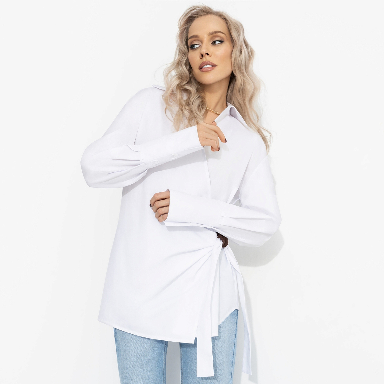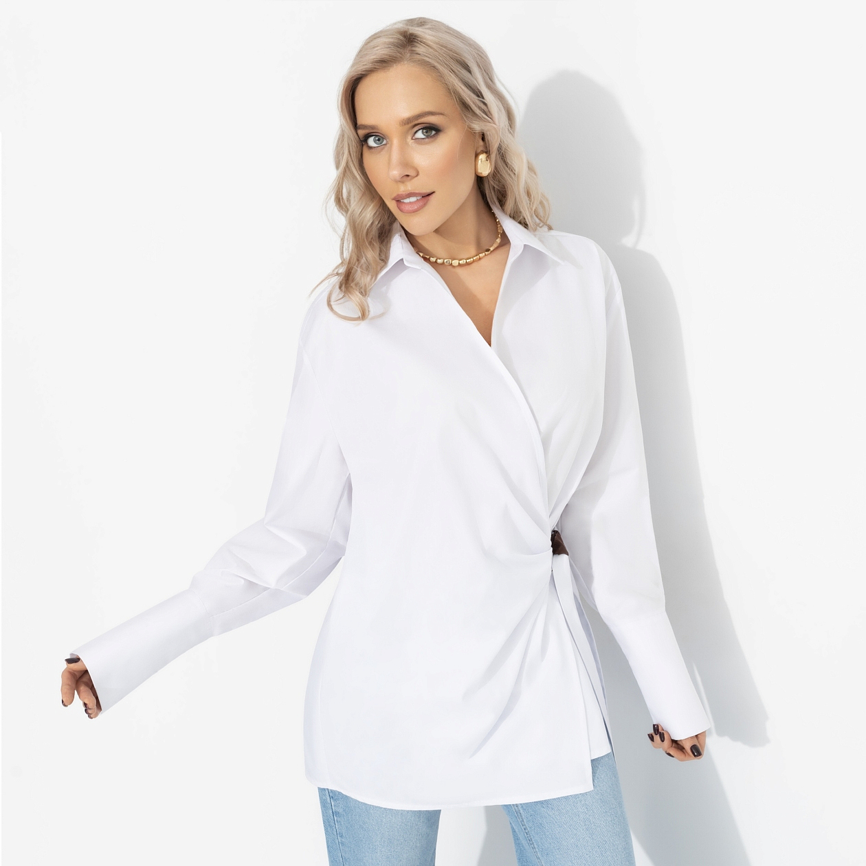 Тот случай, когда вы приходите в обычной белой рубашке а уходите с репутацией самой стильной дамы вечера. Натуральный хлопок дышит, мягко касается кожи, поплин держит четкую форму, а асимметричная драпировка с узлом делает образ свежим и дизайнерским – спокойствие, этот модный раунд вы уже выиграли. Рубашка прямого удлиненного кроя с запахом и завязкой на боковой узел корректирует линию талии и маскирует зону живота. Спущенное плечо и длинный рукав с широкими манжетами создают расслабленный силуэт. Классно сочетать с джинсами, леггинсами и кожаными брюками.