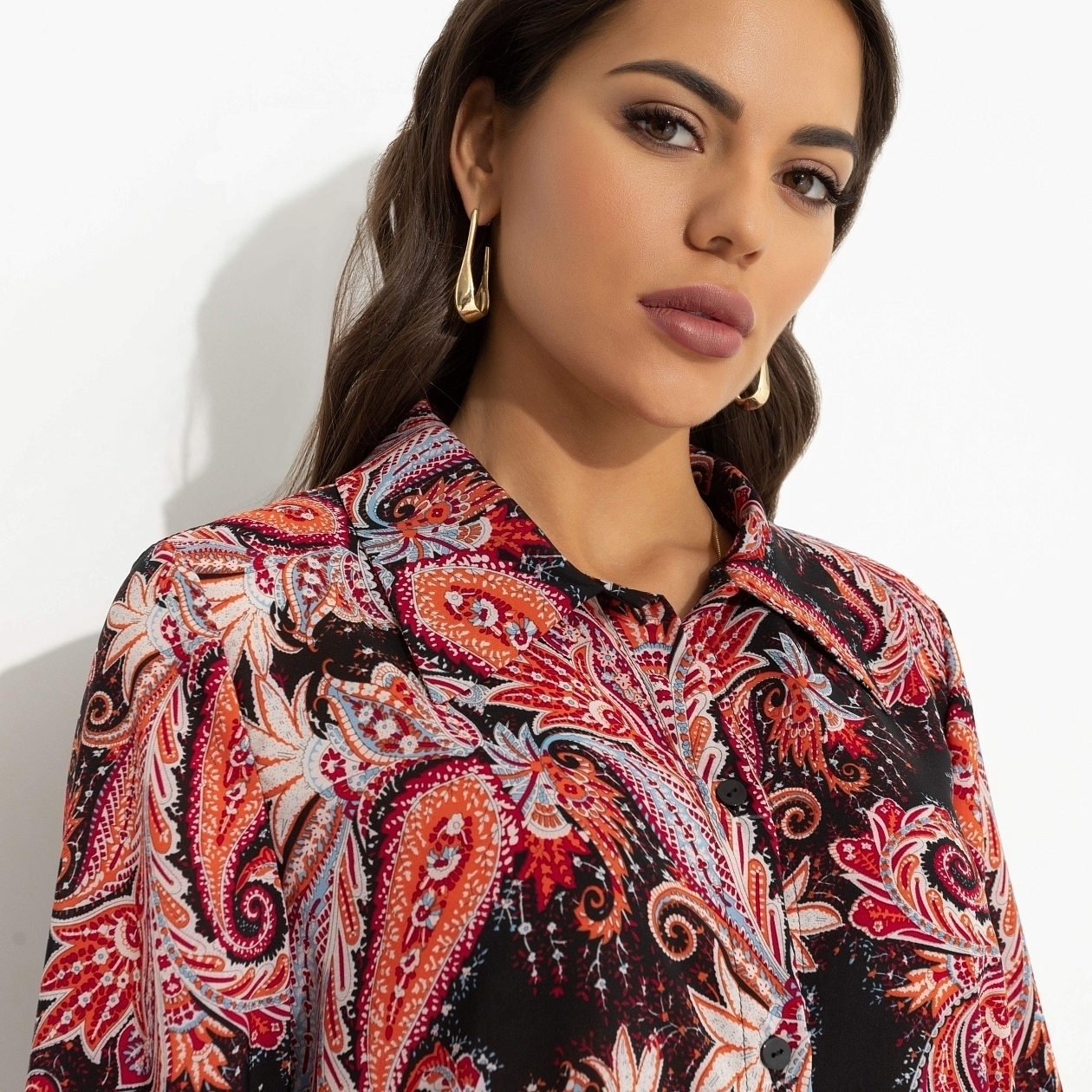 В офис CHARUTTI заходила таинственная незнакомка. Увидев рубашку с узорами, она прикоснулась к ней, ненадолго закрыла глаза, а потом, приоткрыв, прошептала «Это бестселлер…». К незнакомке выстроилась очередь из сотрудниц за столь же точными личными предсказаниями. Рубашка прямого силуэта. Застегивается на пуговицы. Хорошо смотрится в заправленном виде и навыпуск.