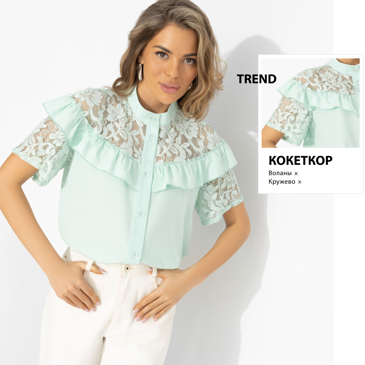Надела – и как будто выдохнула. Отпустила все сложные решения. Рубашка от дизайнеров ЧАРУТТИ именно такая. Мятный оттенок освежает цвет лица, кружево добавляет настроения, а свободная форма не давит и ни к чему не обязывает. В этой рубашке легко быть собой – спокойной, уверенной, красивой. Лёгкая плательная ткань «ниагара» мягко движется и приятно ощущается на теле. Кружевные вставки делают образ интересным и воздушным, не перегружая. Рубашка хорошо смотрится навыпуск и заправленной, дружит с белыми брюками, денимом и юбками.