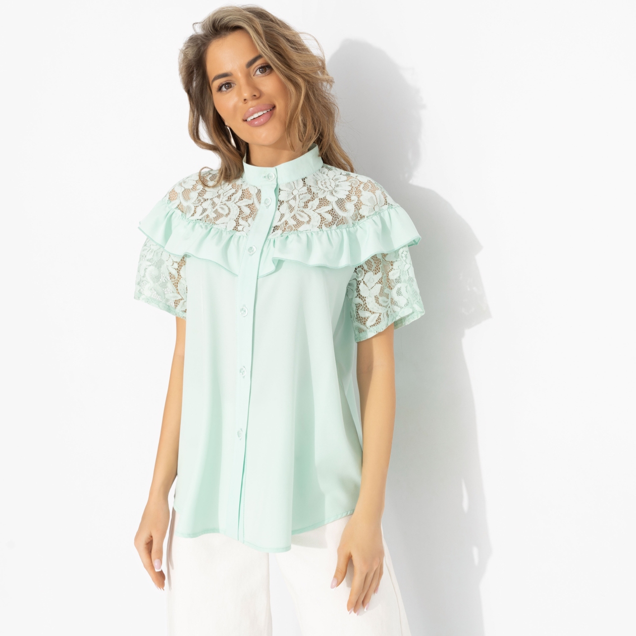 Надела – и как будто выдохнула. Отпустила все сложные решения. Рубашка от дизайнеров ЧАРУТТИ именно такая. Мятный оттенок освежает цвет лица, кружево добавляет настроения, а свободная форма не давит и ни к чему не обязывает. В этой рубашке легко быть собой – спокойной, уверенной, красивой. Лёгкая плательная ткань «ниагара» мягко движется и приятно ощущается на теле. Кружевные вставки делают образ интересным и воздушным, не перегружая. Рубашка хорошо смотрится навыпуск и заправленной, дружит с белыми брюками, денимом и юбками.