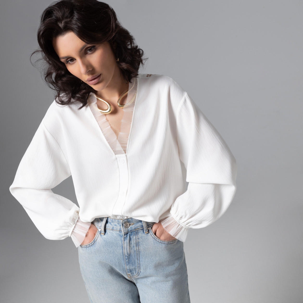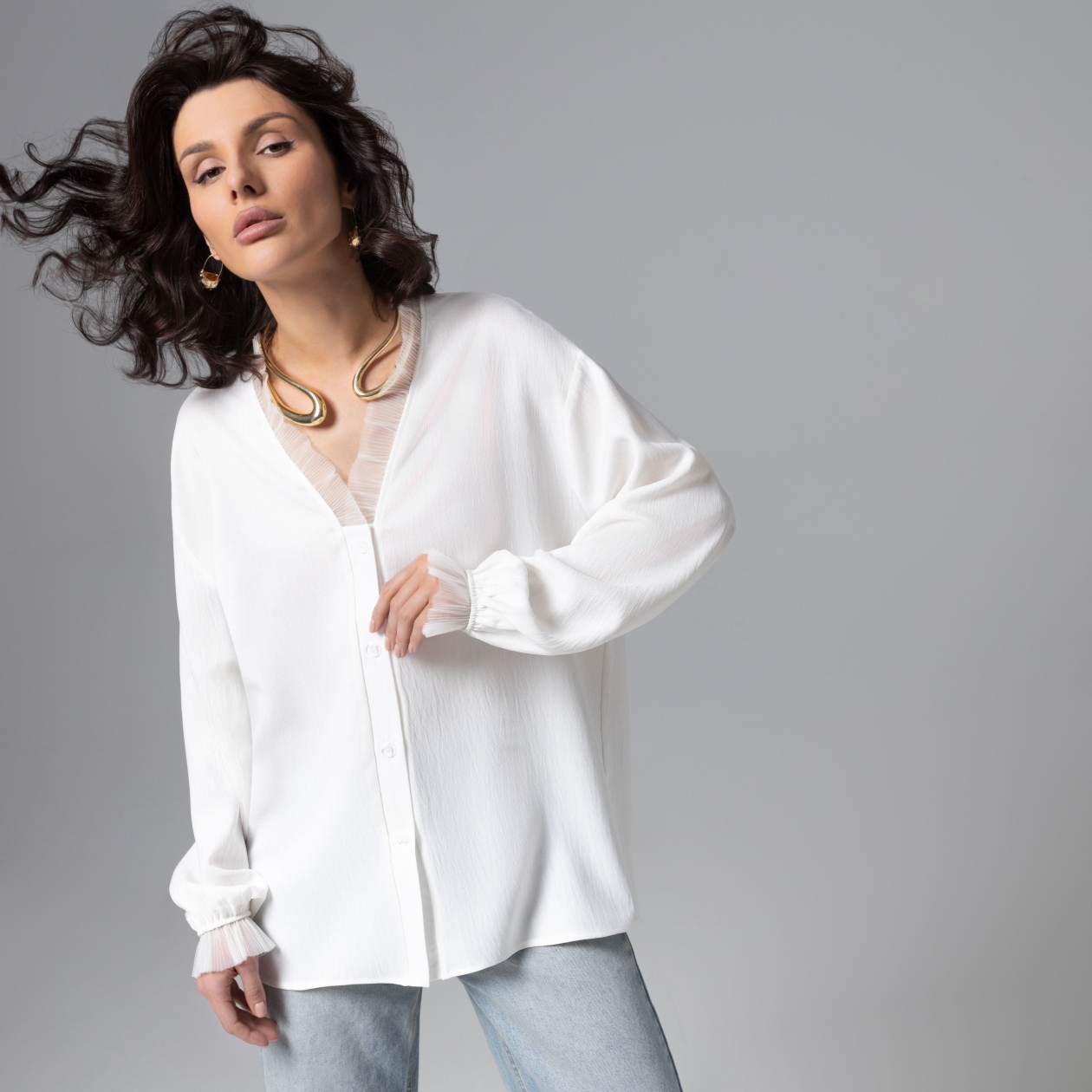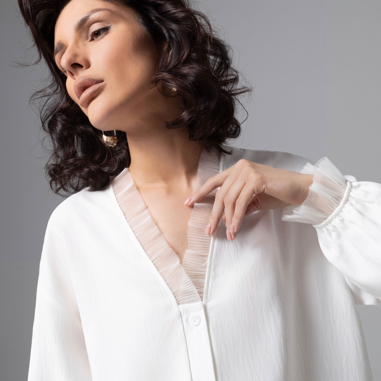 Самодостаточная и стилеобразующая рубашка из премиальной коллекции CHARUTTI. Скажите решительное «Да!» базовому изделию в безупречной интерпритации от CHARUTTI. Рубашка свободного кроя, удлиненная. Изделие застегивается на пуговицы. Акцентный прозрачный декор из крупного шитья по спинке изделия. Акцентный декор из сетки-гофре на манжетах и по вырезу. Высокий контроль качества пошива.