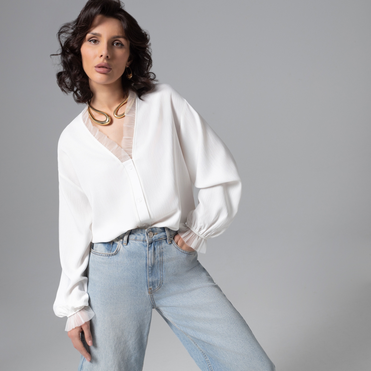 Самодостаточная и стилеобразующая рубашка из премиальной коллекции CHARUTTI. Скажите решительное «Да!» базовому изделию в безупречной интерпритации от CHARUTTI. Рубашка свободного кроя, удлиненная. Изделие застегивается на пуговицы. Акцентный прозрачный декор из крупного шитья по спинке изделия. Акцентный декор из сетки-гофре на манжетах и по вырезу. Высокий контроль качества пошива.