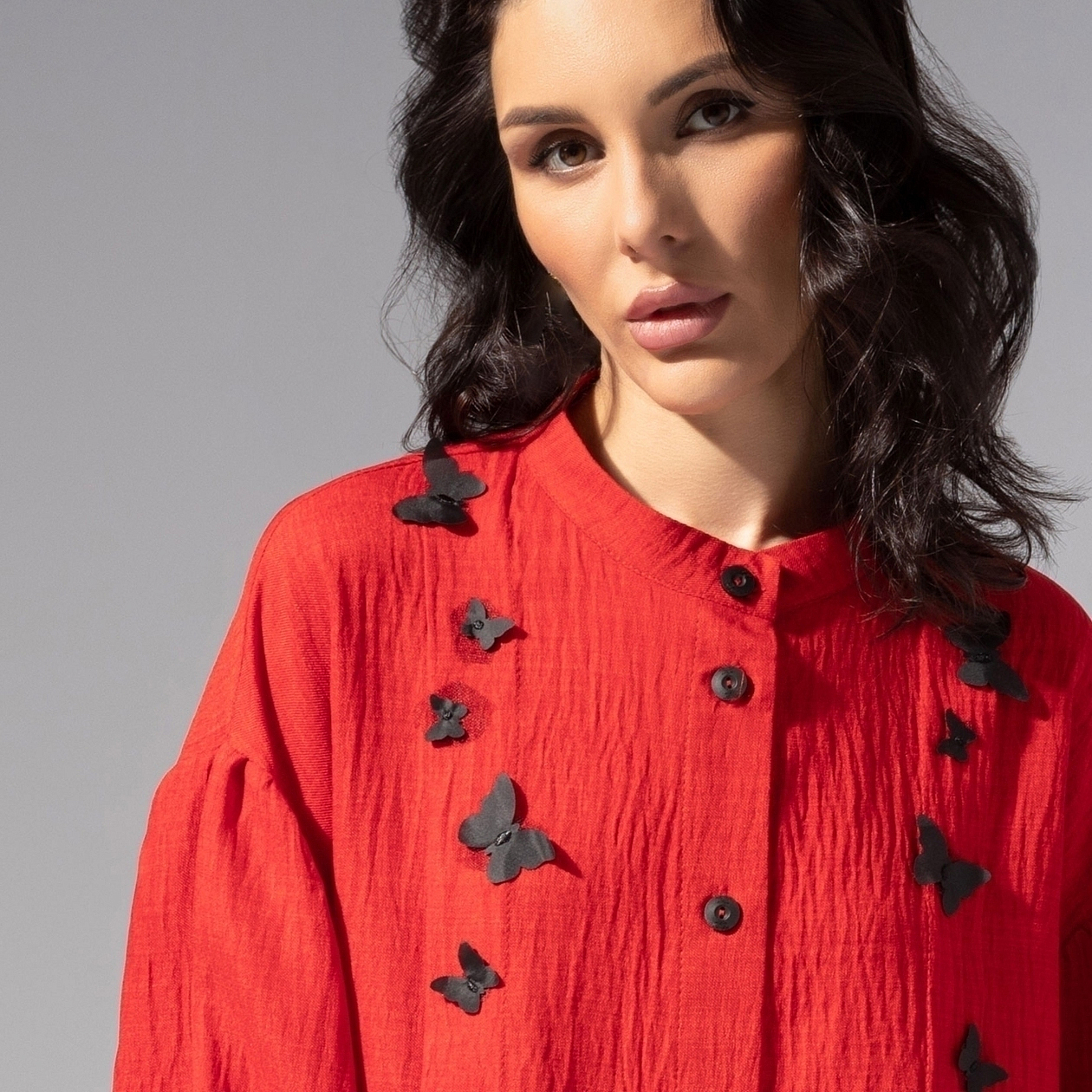 Осторожно – эффект притяжения! Красный оттенок, вдохновлённый коллекциями Paris Fashion Week, превращает рубашку ЧАРУТТИ в арт-объект. Свобода силуэта, мягкий блеск ткани – идеальный баланс между драмой и стилем. Модель выполнена из лёгкой рубашечной ткани «лерис» с декоративной вставкой из сетки на манжетах. Свободный силуэт. Деликатная фактурная ткань устойчива к деформации и выцветанию. Модель дополнена объемным декором.