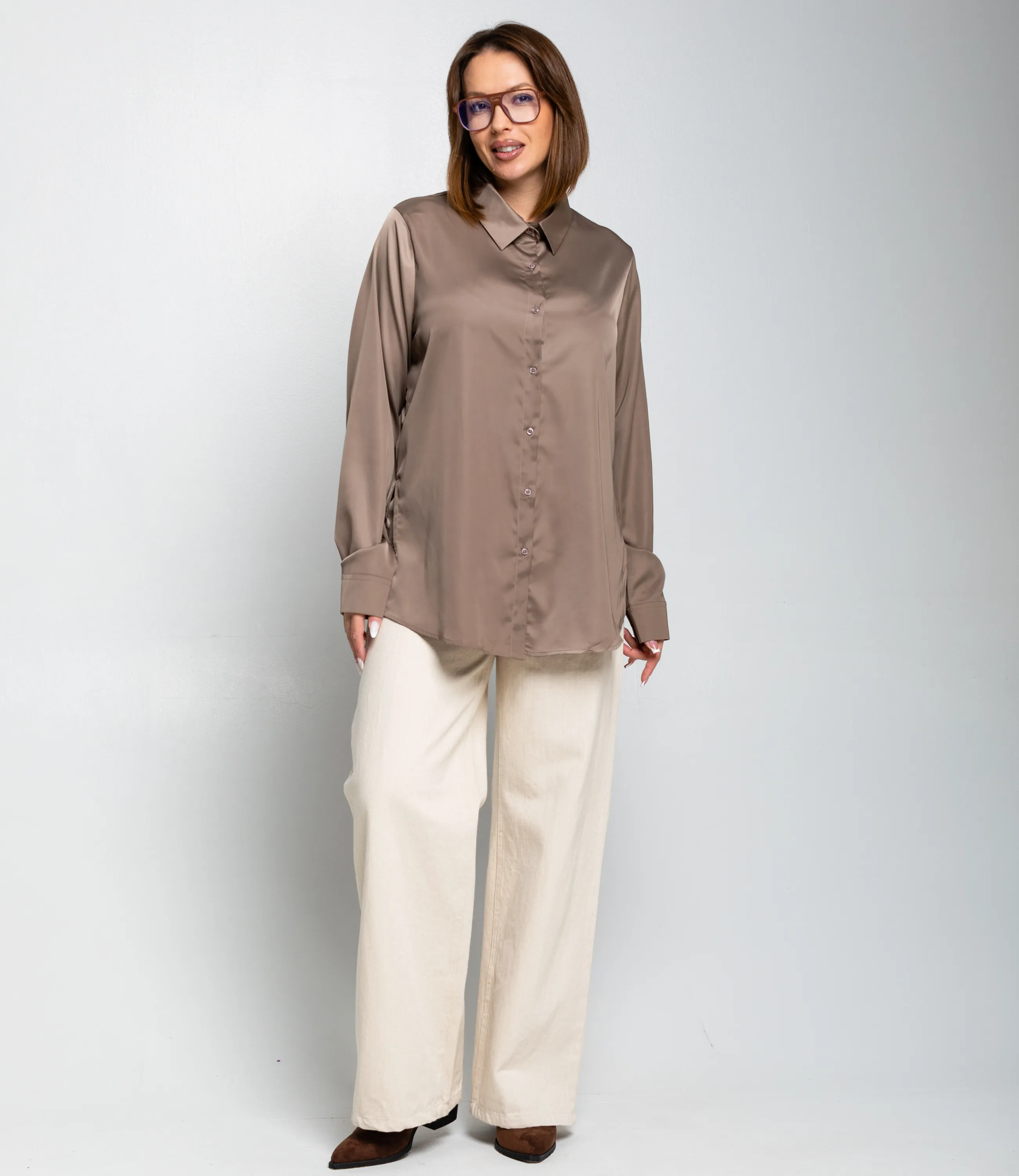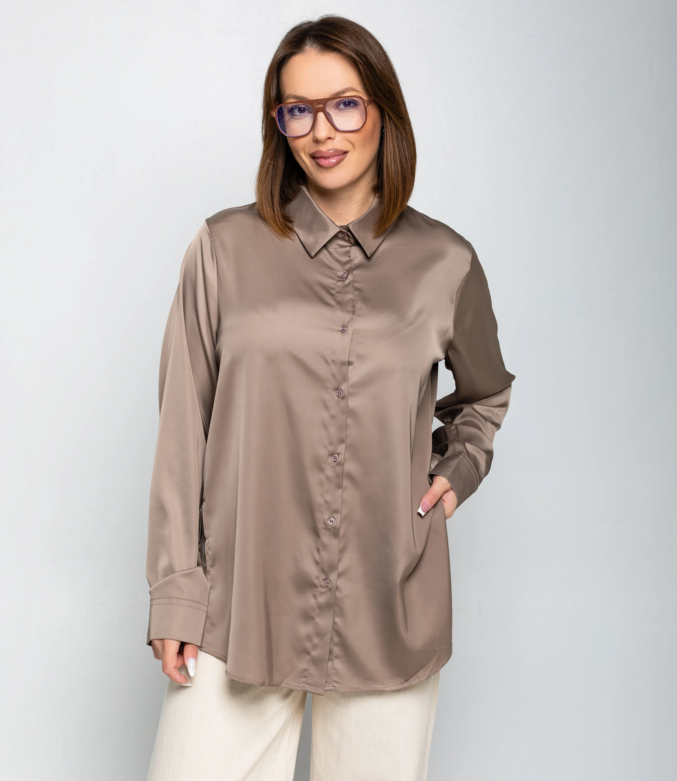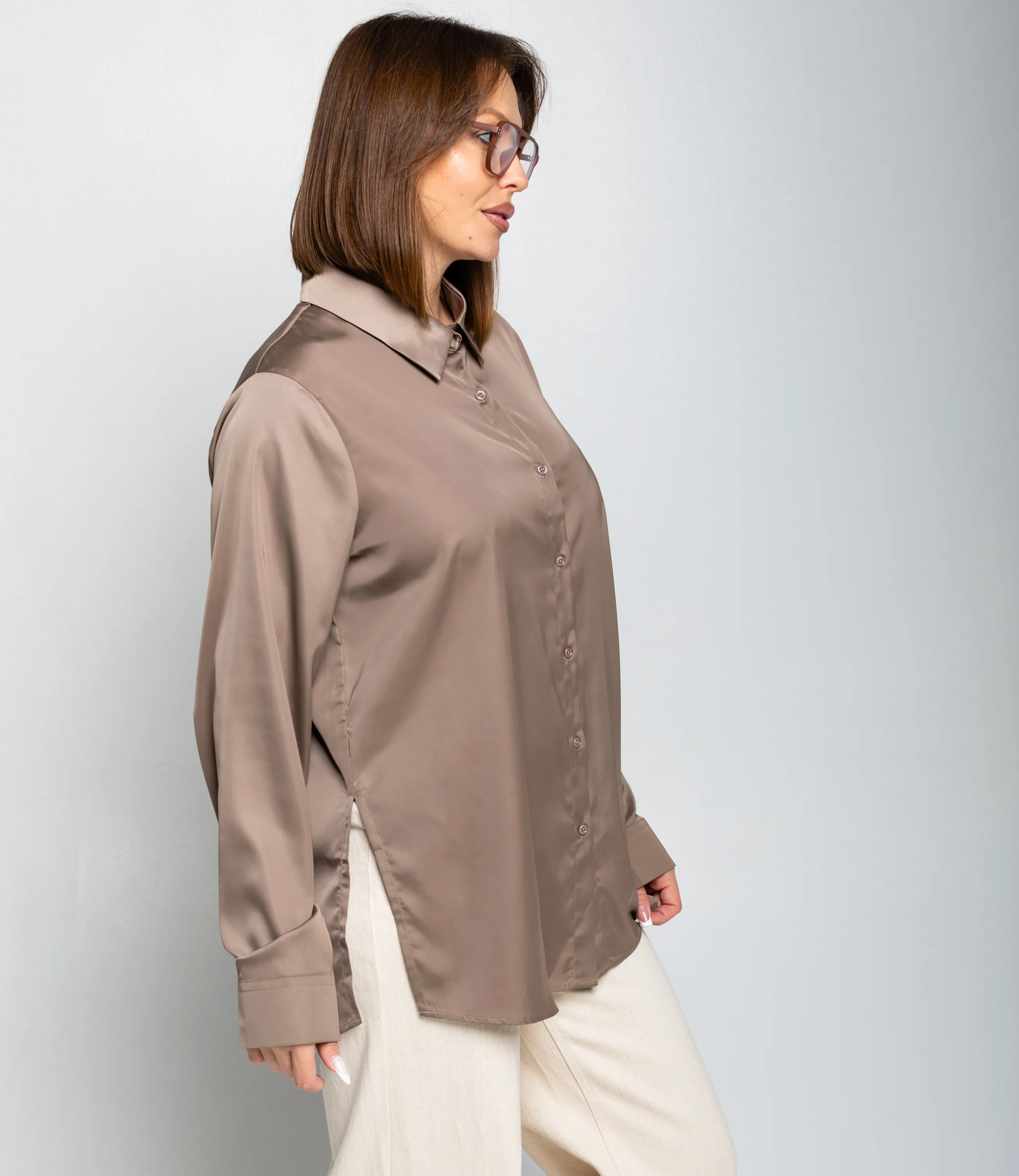 Рубашка — это часть гардероба, которая подчёркивает привлекательность и индивидуальность любой женщины. Рубашка прямого свободного кроя, слегка удлинённая, с классическим отложным воротником и центральной планкой на пуговицах; втачные длинные рукава с прямоугольными манжетами на пуговицу, округлённый нижний край с удлинением по спинке и боковыми разрезами для удобства движения, отсутствие нагрудных карманов подчёркивает минималистичную линию; лёгкий гладкий материал средней плотности с мягкой драпировкой и небольшим блеском, аккуратно обработанные швы и скрытая строчка на планке, прочные закрепки в зонах нагрузки, посадка с запасом в области плеч и груди для расслабленного, но аккуратного силуэта, универсальная базовая модель для деловых и повседневных образов. Для пошива использована ткань: 95% полиэстер, 5% спандекс. Мы предлагаем выгодные оптовые условия, гибкую ценовую политику и надёжные поставки для магазинов. Установленная цена адекватна и позволит вам формировать привлекательную наценку и обеспечивать высокую оборотность. Предложите своим покупательницам рубашку, сочетающую комфорт, качество и повседневную элегантность.