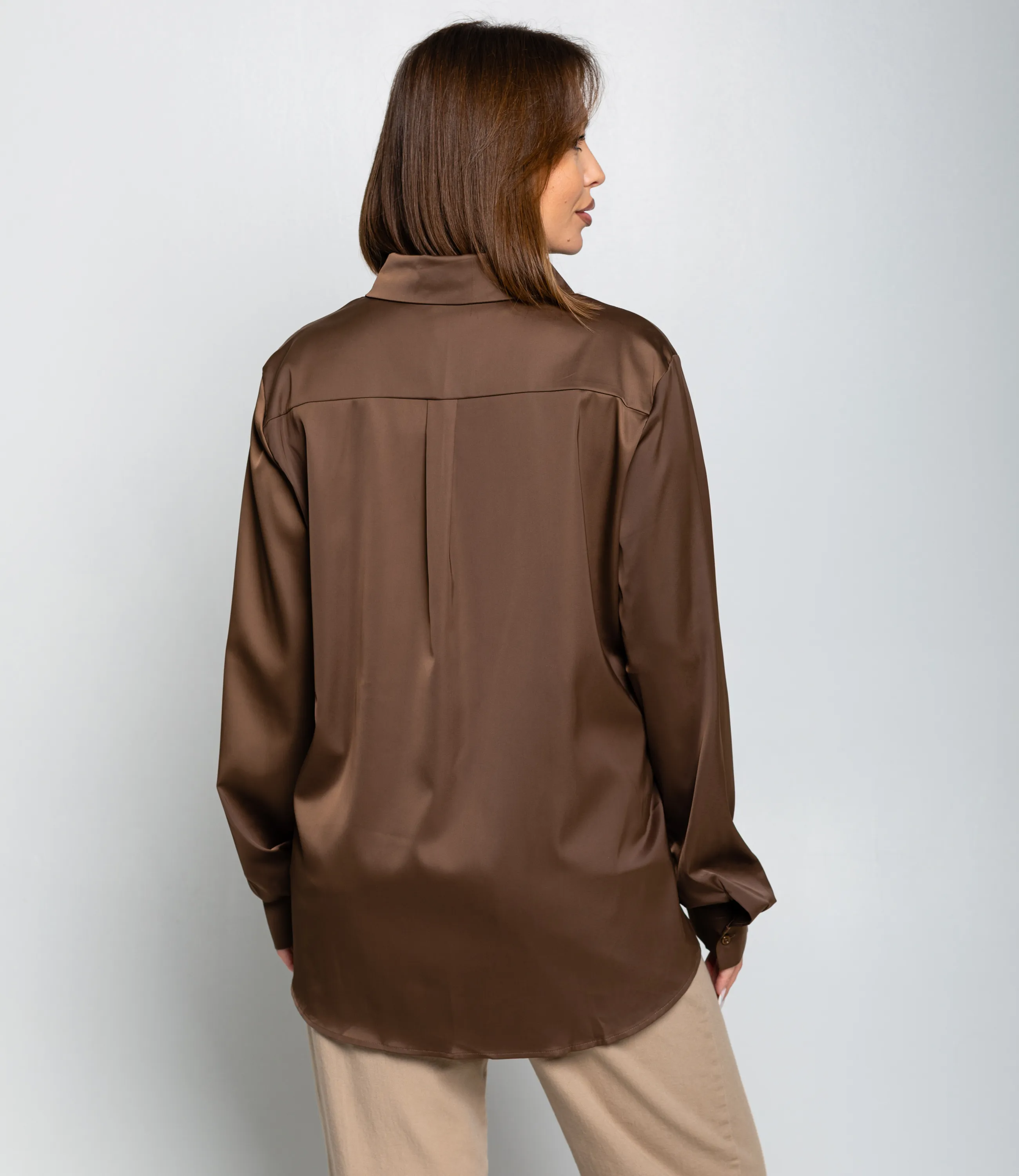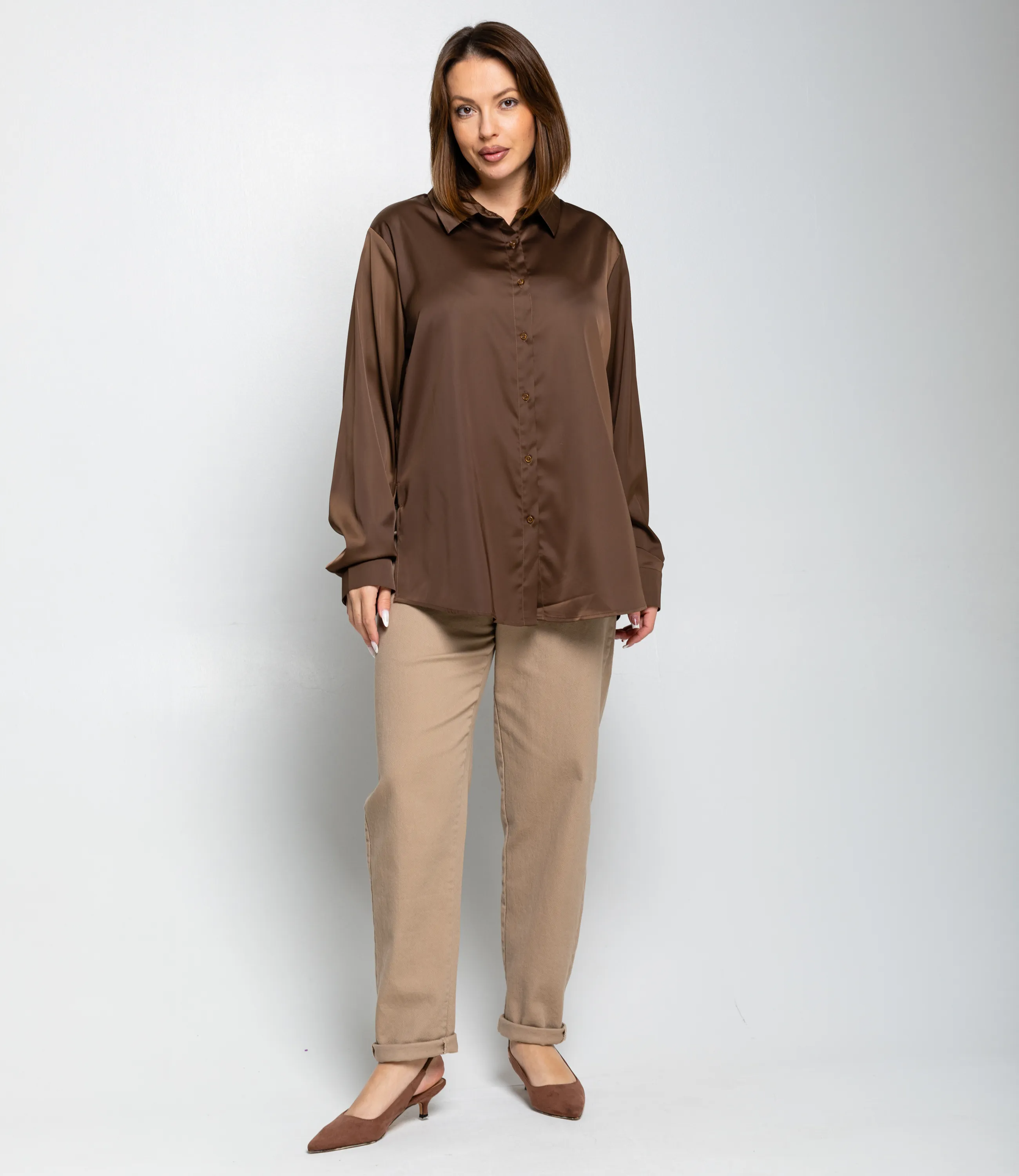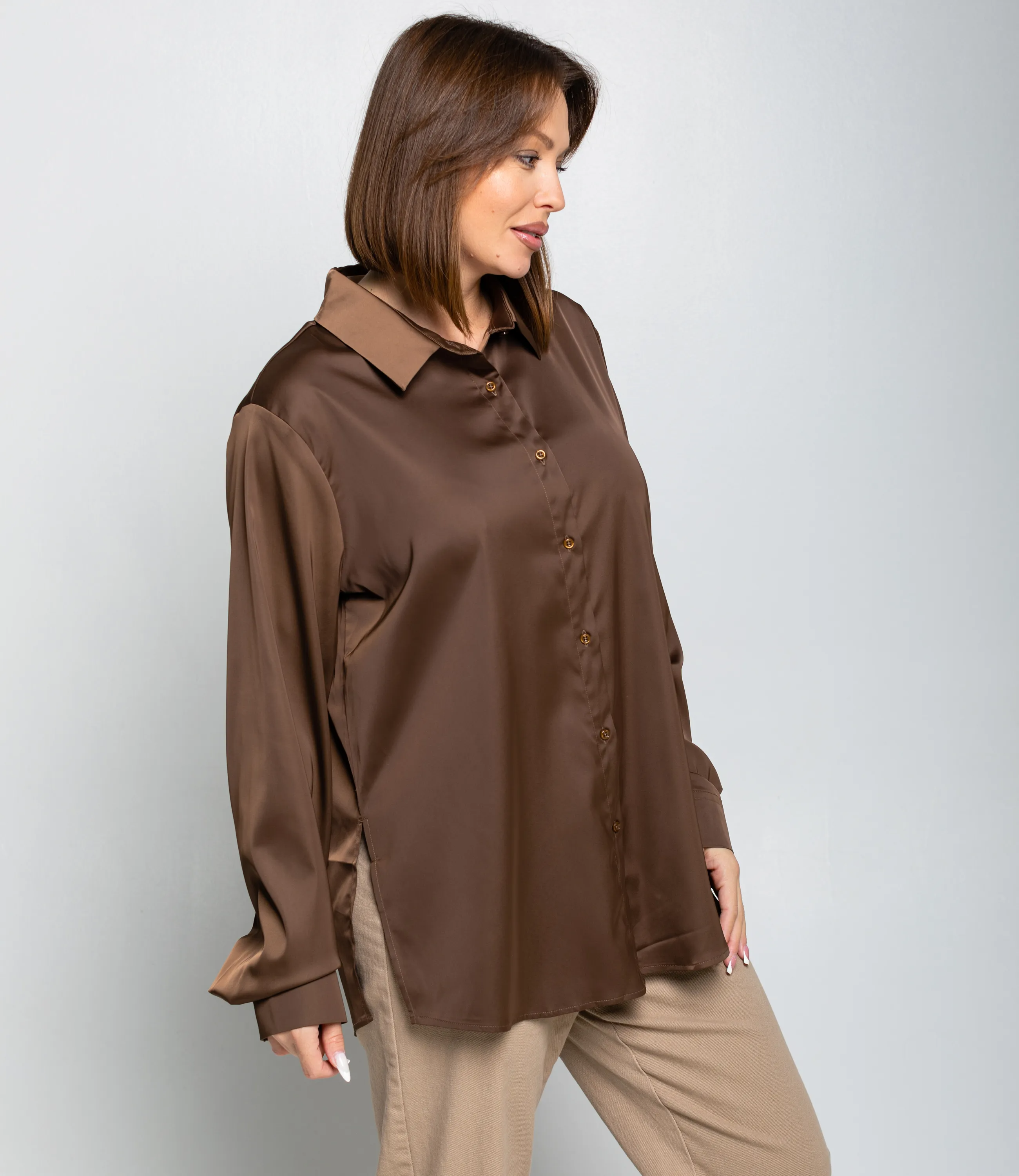 Рубашка — это часть гардероба, которая подчёркивает привлекательность и индивидуальность любой женщины. Рубашка прямого свободного кроя, слегка удлинённая, с классическим отложным воротником и центральной планкой на пуговицах; втачные длинные рукава с прямоугольными манжетами на пуговицу, округлённый нижний край с удлинением по спинке и боковыми разрезами для удобства движения, отсутствие нагрудных карманов подчёркивает минималистичную линию; лёгкий гладкий материал средней плотности с мягкой драпировкой и небольшим блеском, аккуратно обработанные швы и скрытая строчка на планке, прочные закрепки в зонах нагрузки, посадка с запасом в области плеч и груди для расслабленного, но аккуратного силуэта, универсальная базовая модель для деловых и повседневных образов. Для пошива использована ткань: 95% полиэстер, 5% спандекс. Мы предлагаем выгодные оптовые условия, гибкую ценовую политику и надёжные поставки для магазинов. Установленная цена адекватна и позволит вам формировать привлекательную наценку и обеспечивать высокую оборотность. Предложите своим покупательницам рубашку, сочетающую комфорт, качество и повседневную элегантность.