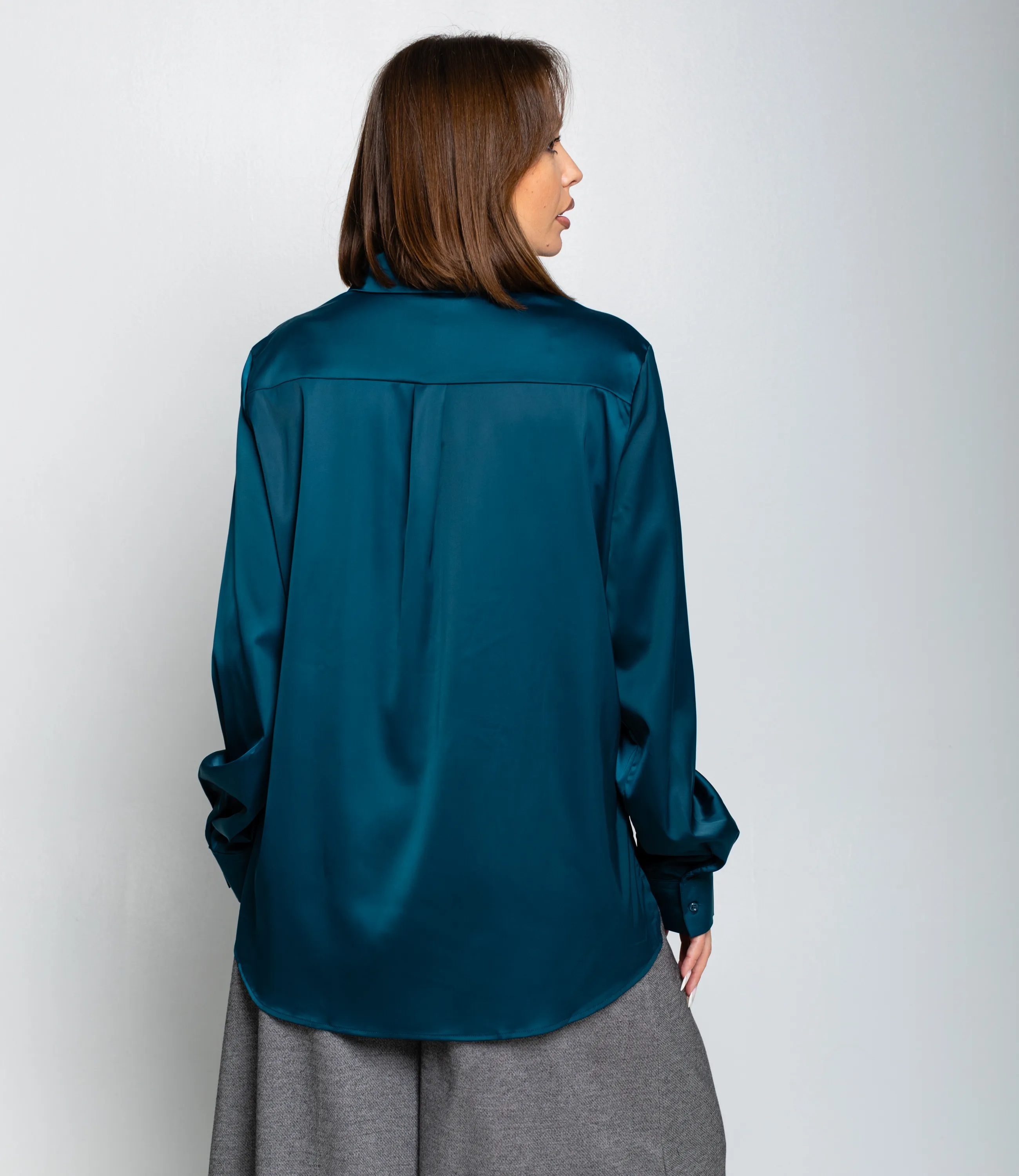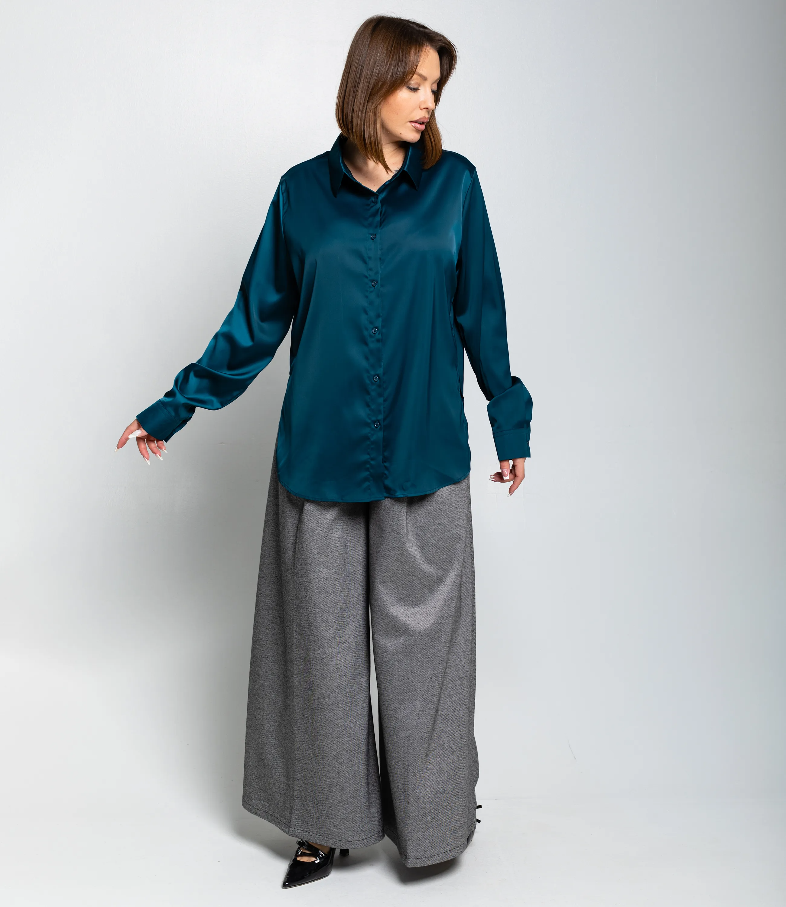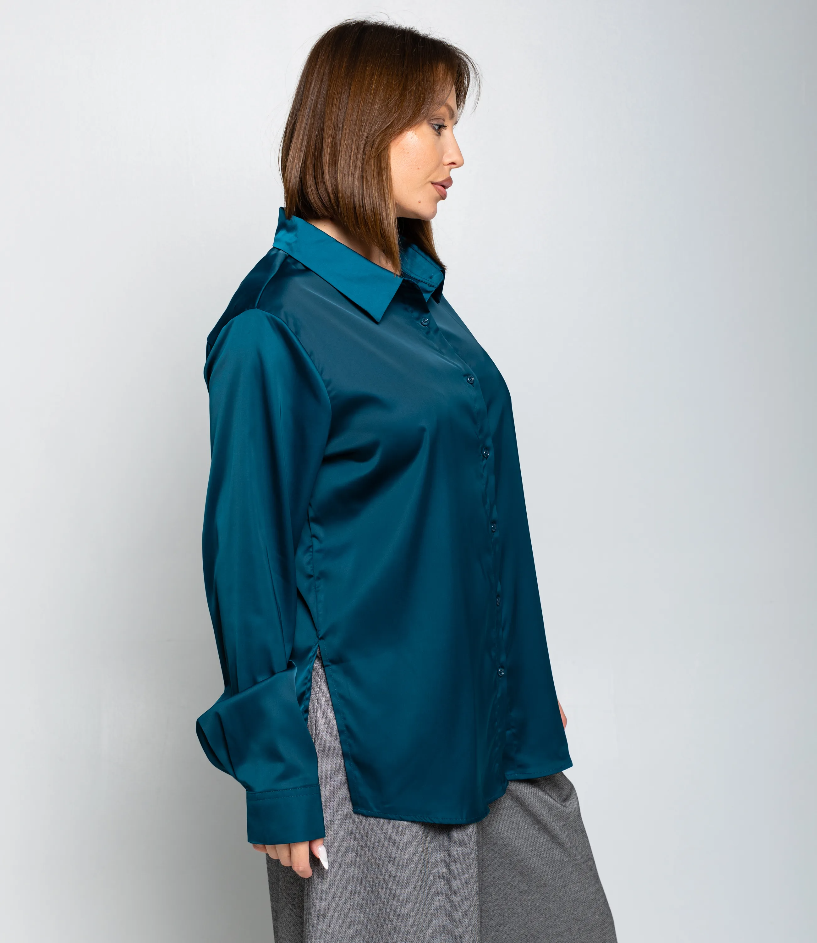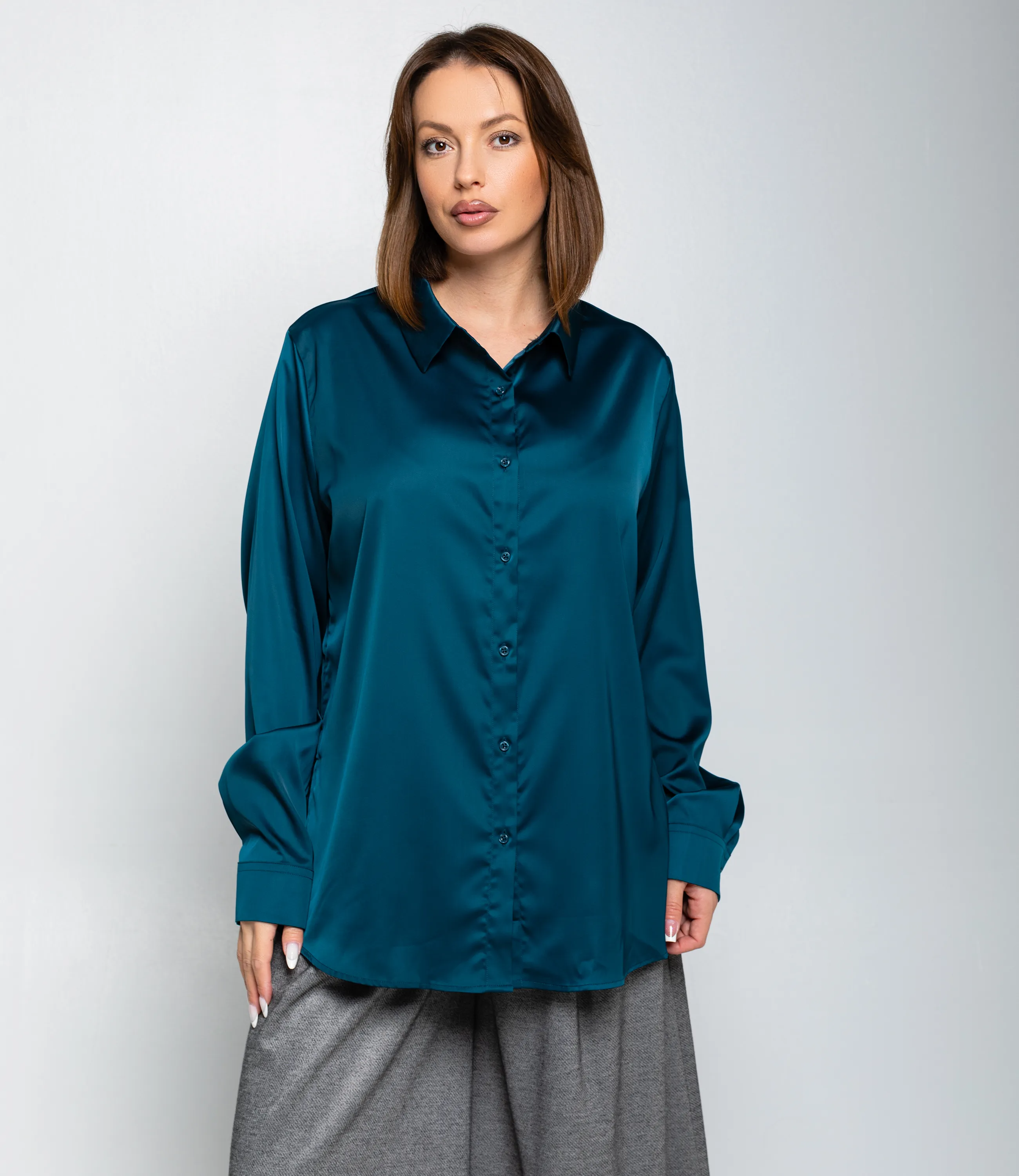 Рубашка — это часть гардероба, которая подчёркивает привлекательность и индивидуальность любой женщины. Рубашка прямого свободного кроя, слегка удлинённая, с классическим отложным воротником и центральной планкой на пуговицах; втачные длинные рукава с прямоугольными манжетами на пуговицу, округлённый нижний край с удлинением по спинке и боковыми разрезами для удобства движения, отсутствие нагрудных карманов подчёркивает минималистичную линию; лёгкий гладкий материал средней плотности с мягкой драпировкой и небольшим блеском, аккуратно обработанные швы и скрытая строчка на планке, прочные закрепки в зонах нагрузки, посадка с запасом в области плеч и груди для расслабленного, но аккуратного силуэта, универсальная базовая модель для деловых и повседневных образов. Для пошива использована ткань: 95% полиэстер, 5% спандекс. Мы предлагаем выгодные оптовые условия, гибкую ценовую политику и надёжные поставки для магазинов. Установленная цена адекватна и позволит вам формировать привлекательную наценку и обеспечивать высокую оборотность. Предложите своим покупательницам рубашку, сочетающую комфорт, качество и повседневную элегантность.