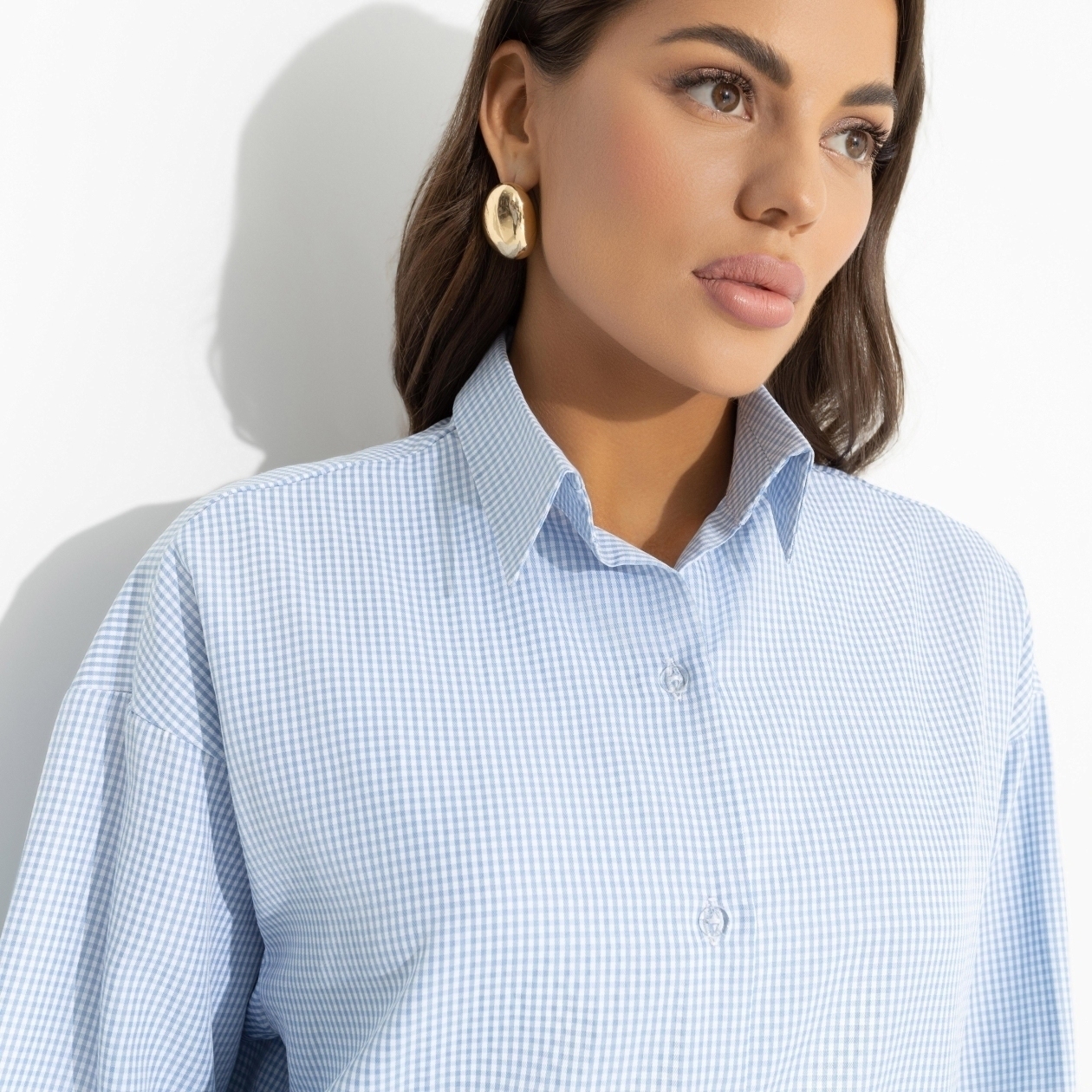 Если в вашем гардеробе нет голубой рубашки оверсайз, можно считать, вы упускаете сотни образов. Буквально фундаментальный столп стиля. Классический принт в мелкую клетку – ключевой штрих модного лука. Рубашка свободного кроя. Удлиненная. Слегка асимметричный крой – задняя часть изделия чуть длиннее передней. Застегивается на пуговицы. Хорошо смотрится в заправленном виде и навыпуск.