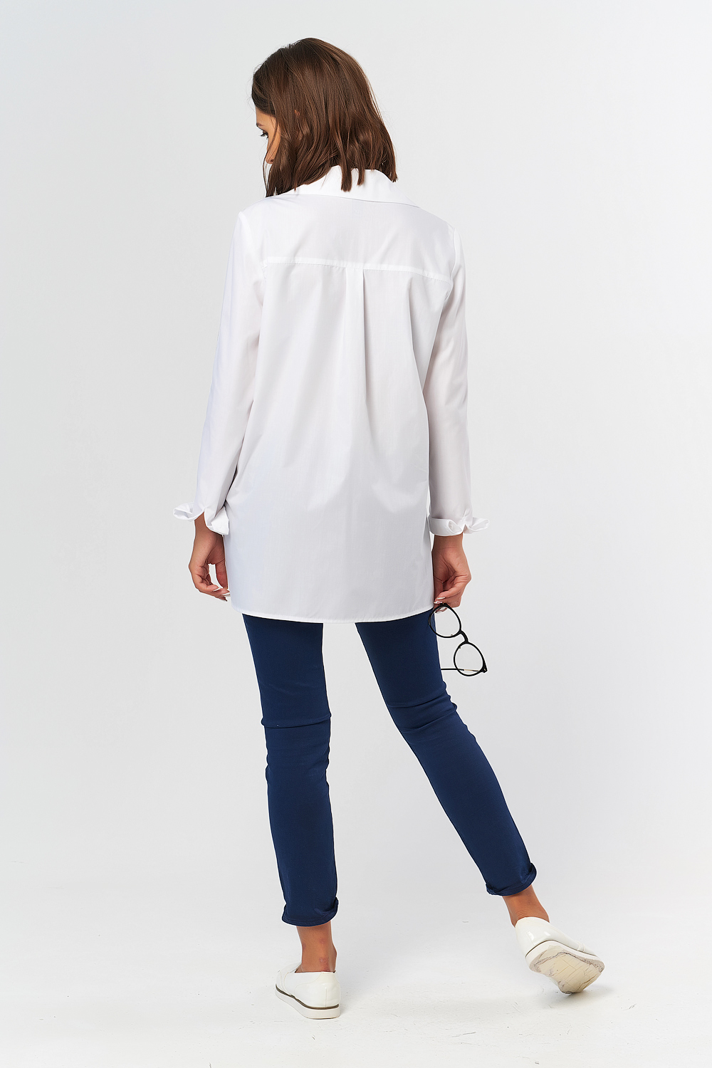 • Особенности: Рубашка прямого силуэта из сорочечной ткани. Детали: отложной воротник на стойке, по плечевым швам и середине рукава настрочена декоративная тесьма, длинные втачные рукава с манжетой, разрезы в боковых швах, разная длина переда и спинки, накладной карман по передй, кокетка по спинке. Застежка на петли-пуговицы по планке переда.