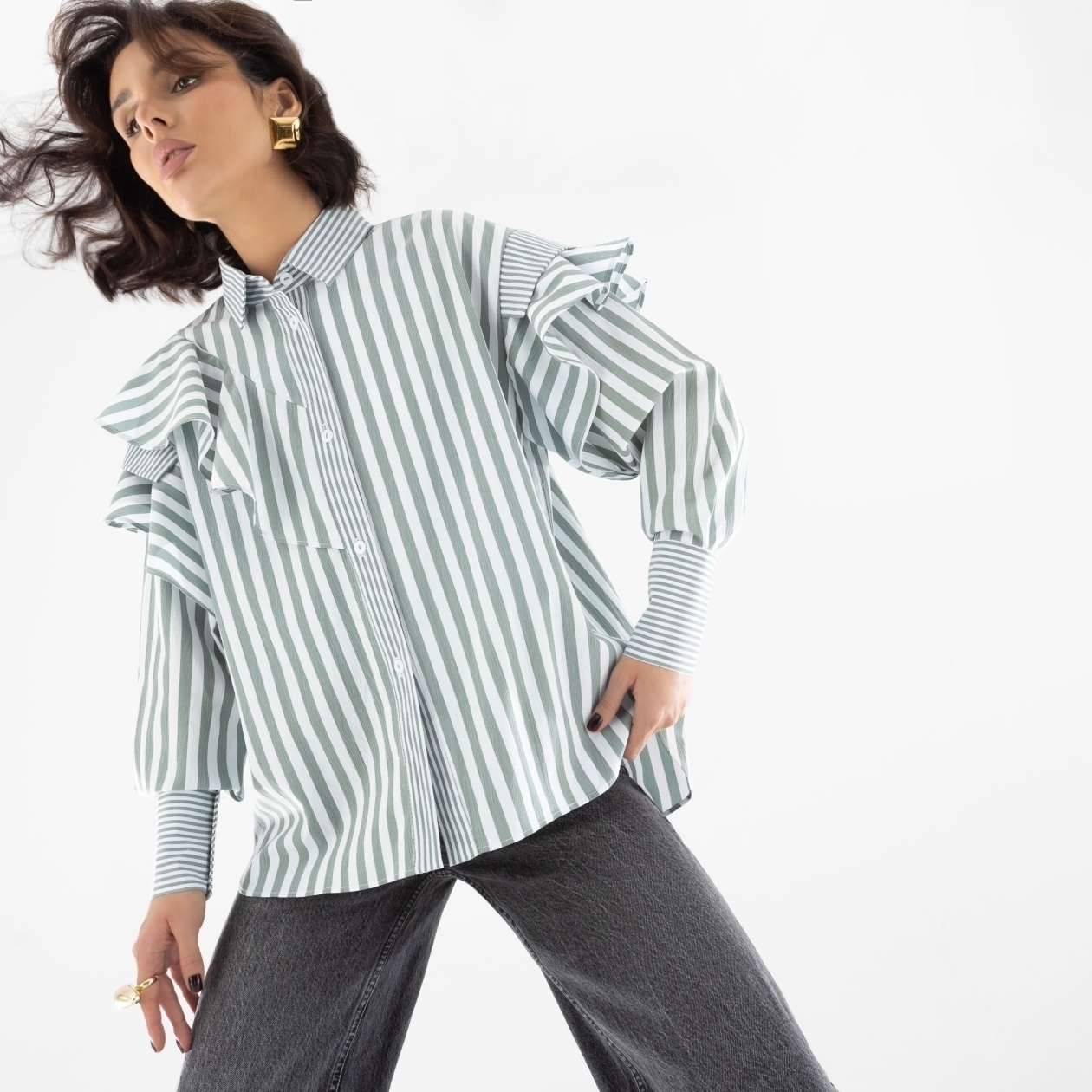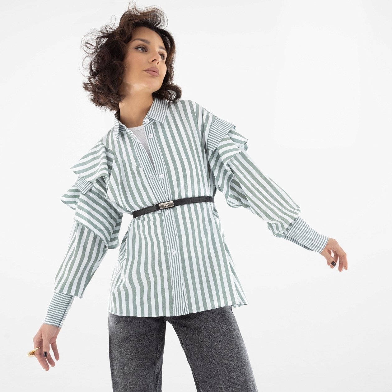 Взяв за основу классическую рубашку в полоску, дизайнеры CHARUTTI вывели её за пределы офисного стиля за счет объемного декора. Рюши делают образ слегка игривым, что не мешает стилизовать рубашку в casual луках. Рубашка свободного кроя. Объемный асимметричный декор с двух сторон изделия. Застегивается на пуговицы.