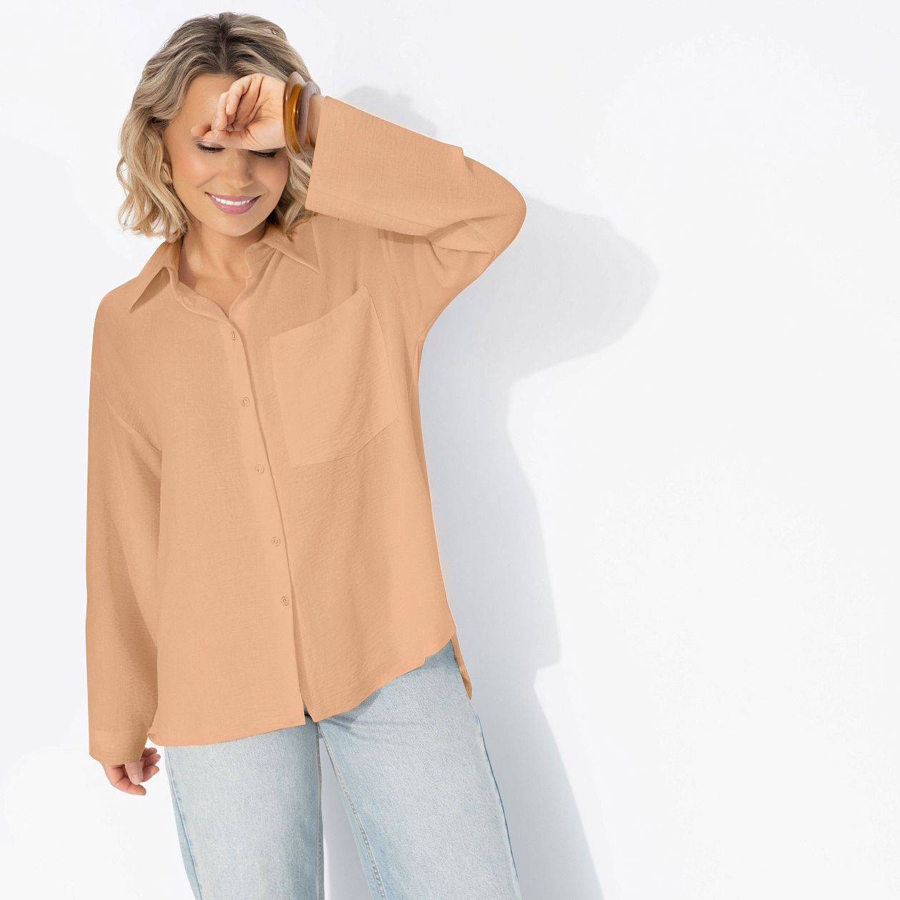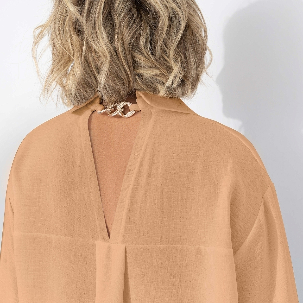 Основа безупречного гардероба от ЧАРУТТИ. Рубашка, которую можно накинуть поверх купальника на пляже, сочетать с прямыми брюками для офиса или носить с джинсами на прогулке. Теплый оттенок сливается с любым образом, как финальный аккорд в идеальной мелодии стиля. Рубашка свободного кроя. Хорошо смотрится на любом типе фигуры. Накладной карман по передней части изделия. Есть треугольный вырез по верхней части спинки изделия. Дополнен металлическим аксессуаром в виде цепи. Рубашка хорошо смотрится в заправленном виде и навыпуск.