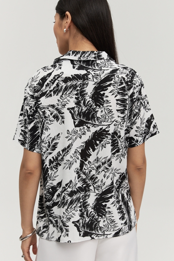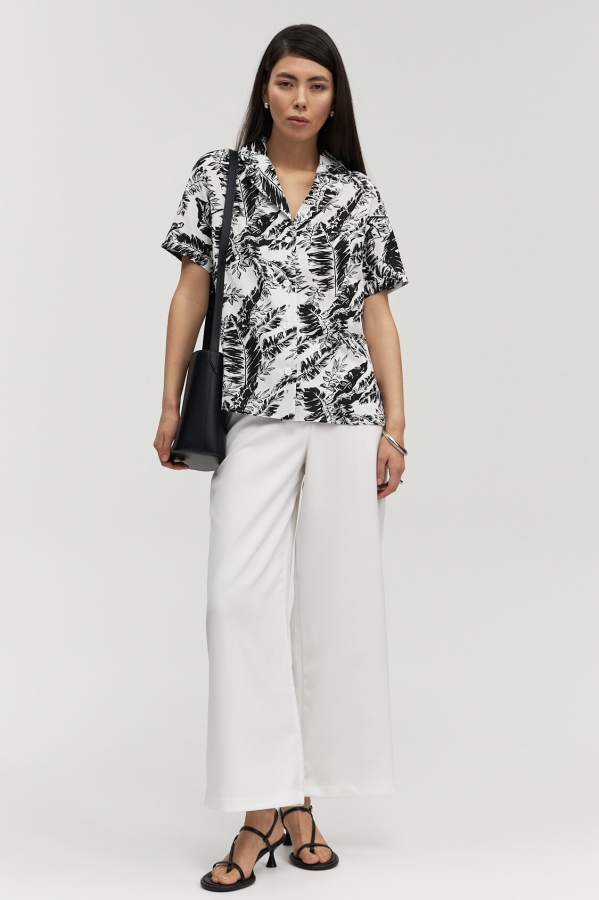 Комфортная блуза- рубашка из вискозного полотна с авторским принтом. Модель свободного силуэта с английским воротником. Рукав короткий. В боковых швах разрезы. Застежка на петли и пуговицы.