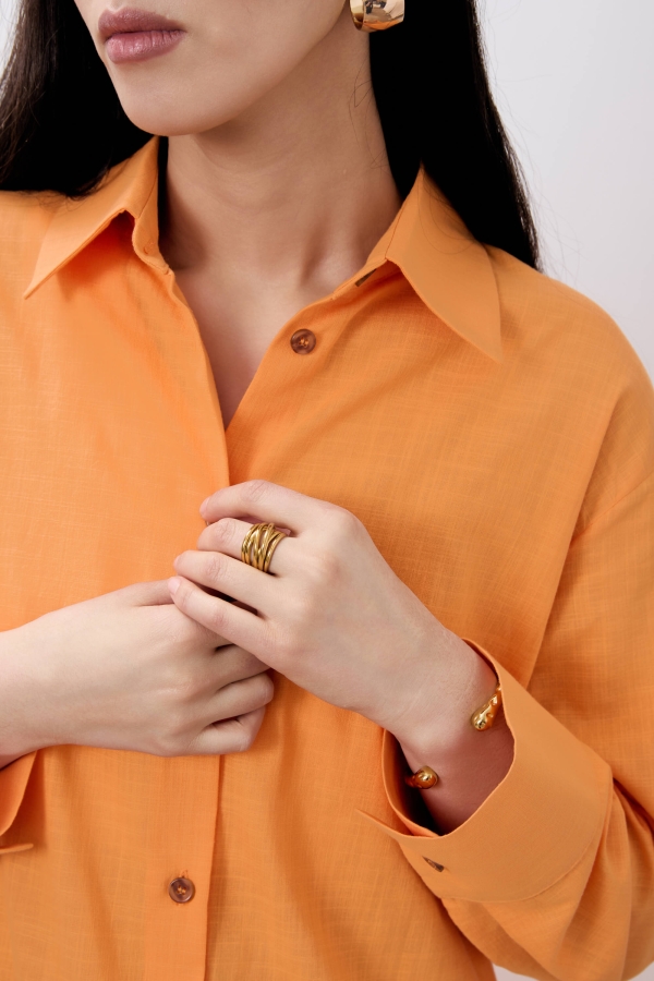 Свободная рубашка из фактурного хлопка со спущенной линией плеча. Воротник рубашечный. Длинный рукав с широкой манжетой. По спинке отрезная кокетка со складкой. Низ изделия фигурный.