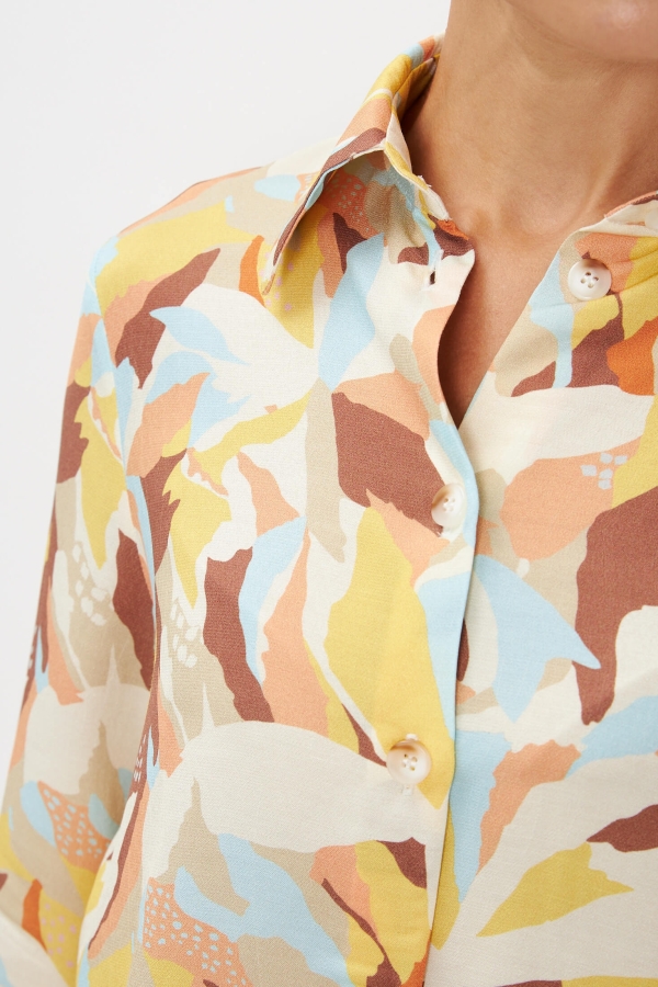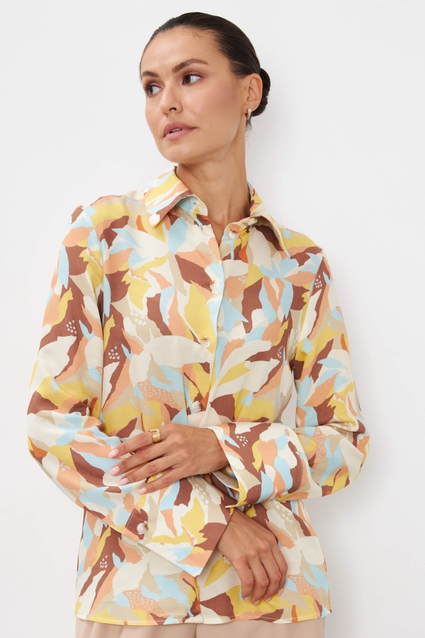 Элегантная блуза-рубашка из принтованной вискозы. Модель прямого силуэта. Воротник рубашечный. Длинный рукав на широкой манжете. Застёжка на петли и пуговицы. В комплекте пояс-галстук.