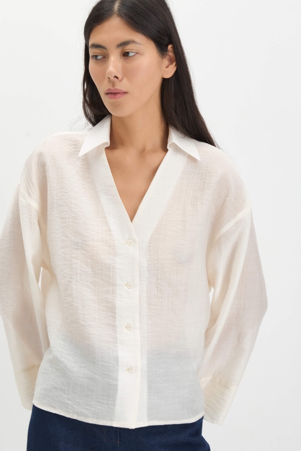 Блуза-рубашка из вискозы-креш в дорогом оттенке. Модель прямого силуэта со спущенной линии плеча. Рукав ⅞ на широкой манжете, которую можно подвернуть. Воротник отложной переходящий в стойку и V-образный вырез. Застежка на петли и пуговицы.