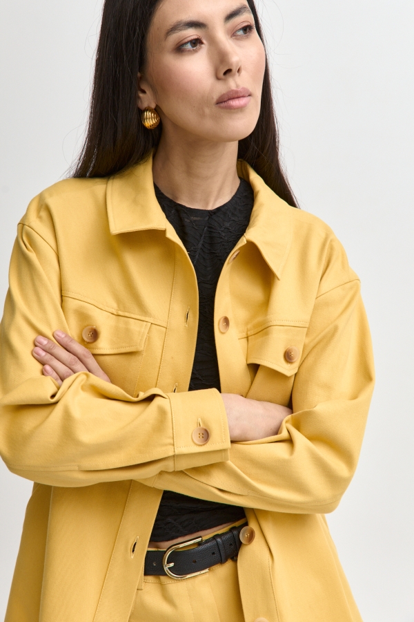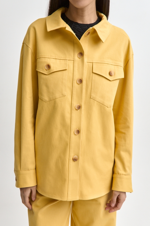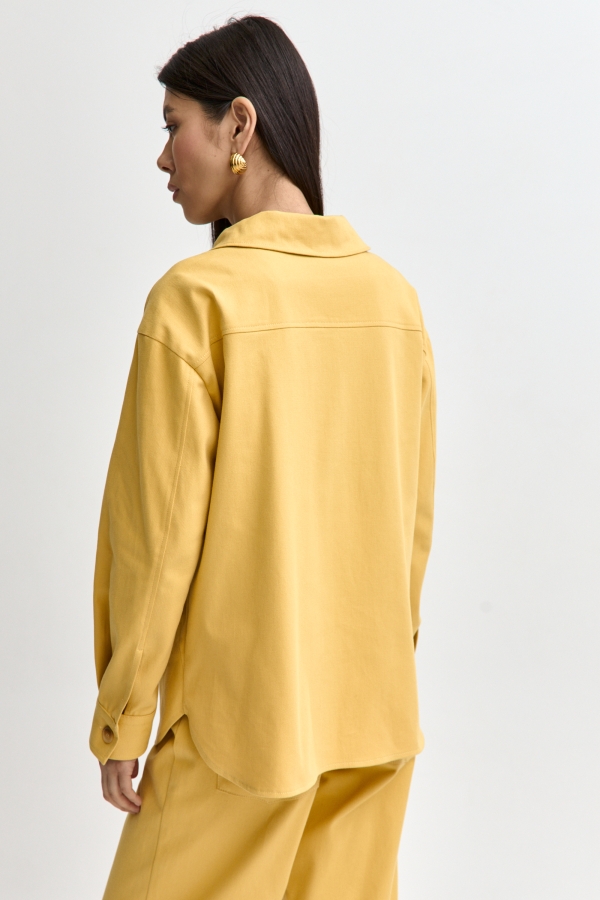 Рубашка свободного силуэта из джинсового полотна. По переду накладные декоративные карманы с клапанами. По спинке кокетка со складкой. Рукав спущенный на манжете.