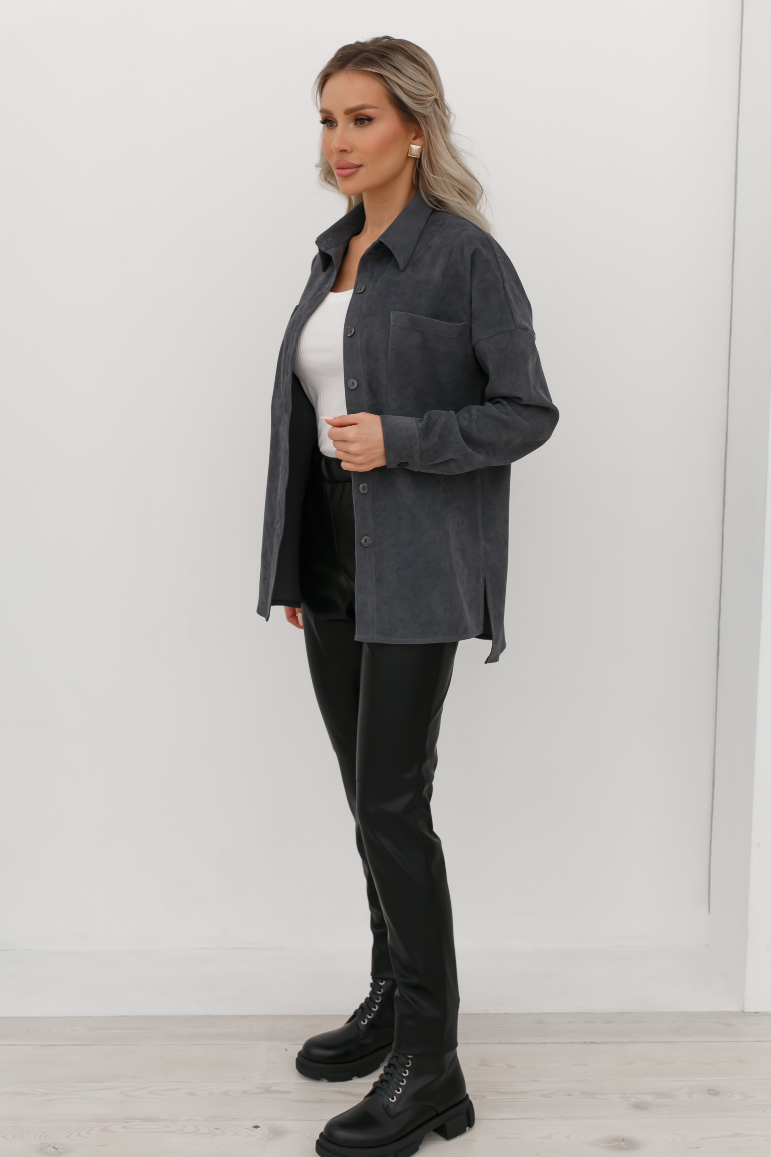 Стильная рубашка прямого силуэта. Длинный рукав со спущенным плечом, оканчивается притачной манжетой. Горловина оформлена классическим воротником на стойке, переходящим в планку с застежкой на петли и пуговицы. Спинка дополнена кокеткой со складкой. Низ ассиметричный с разрезами по бокам. Перед дополнен накладными карманами. Рубашка добавит вашему образу стиля и шарма.