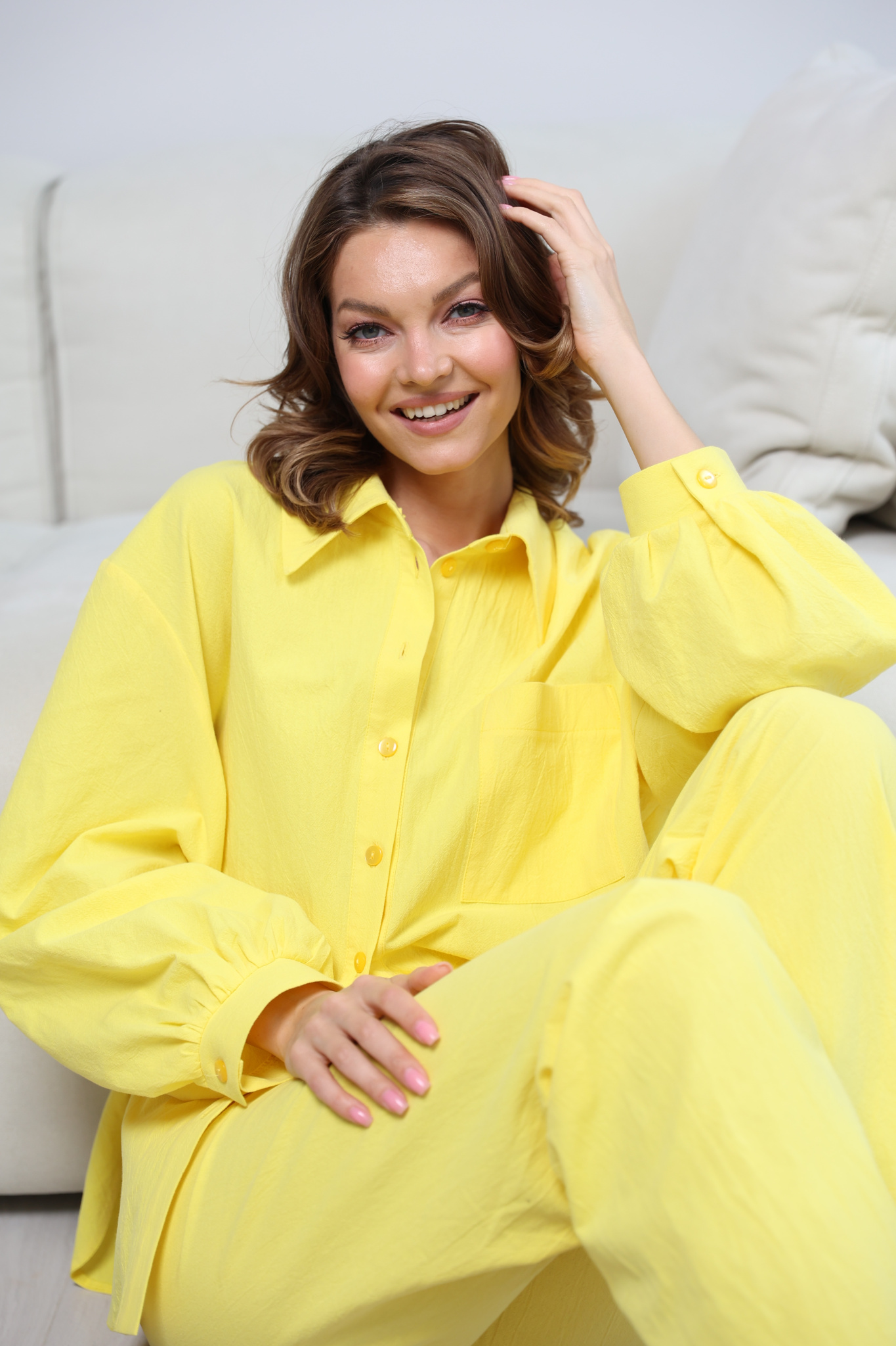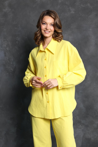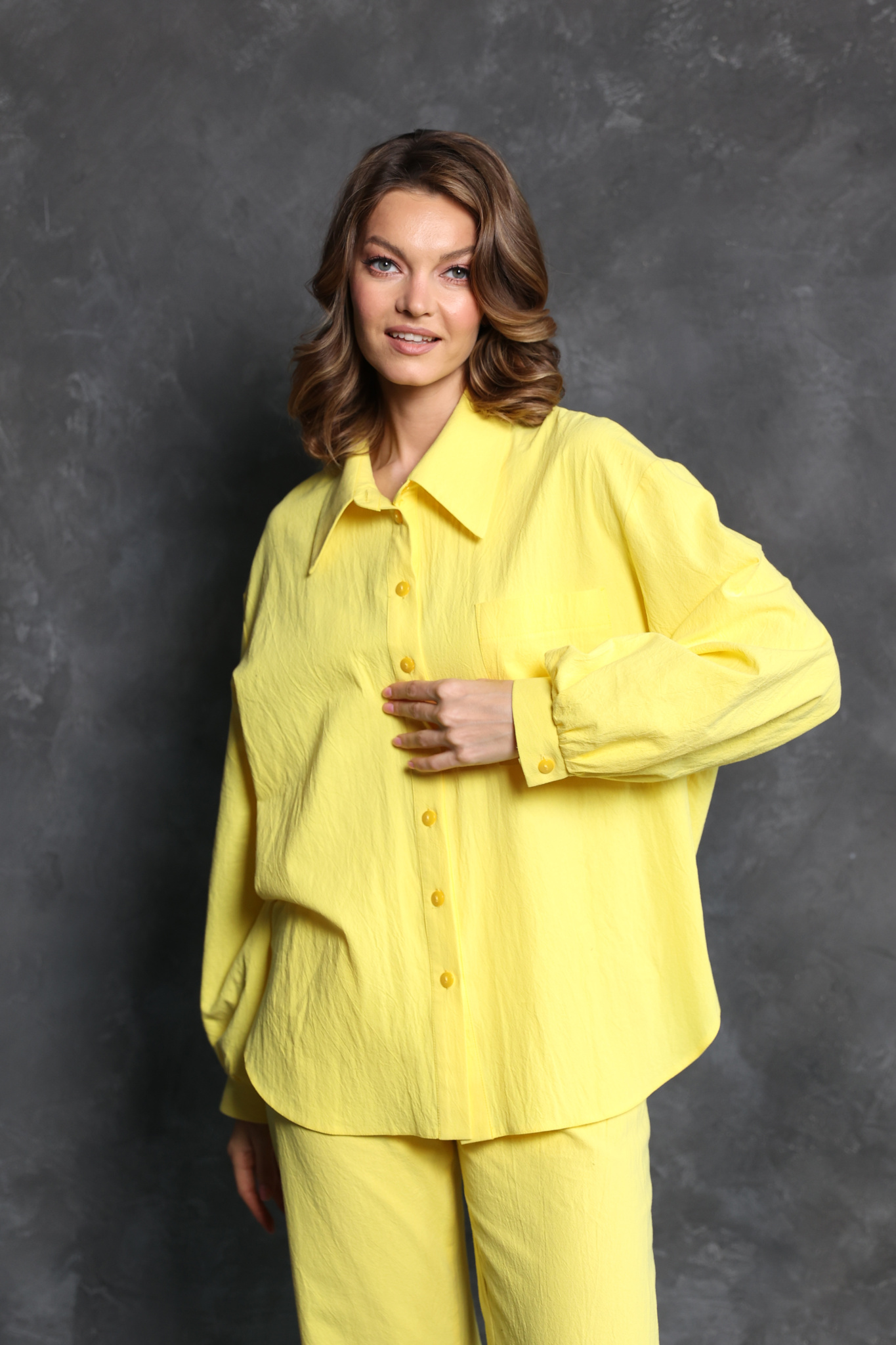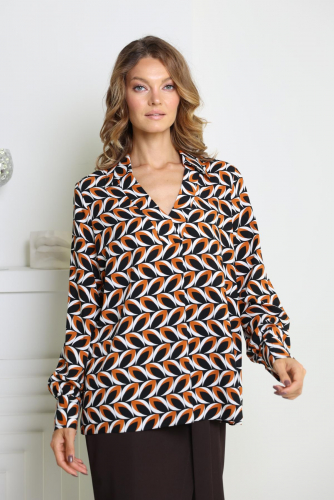 Рубашка свободного кроя с полукруглым низом. Отложной ворот. Накладной карман. Втачной, широкий рукав на сборке по манжете.