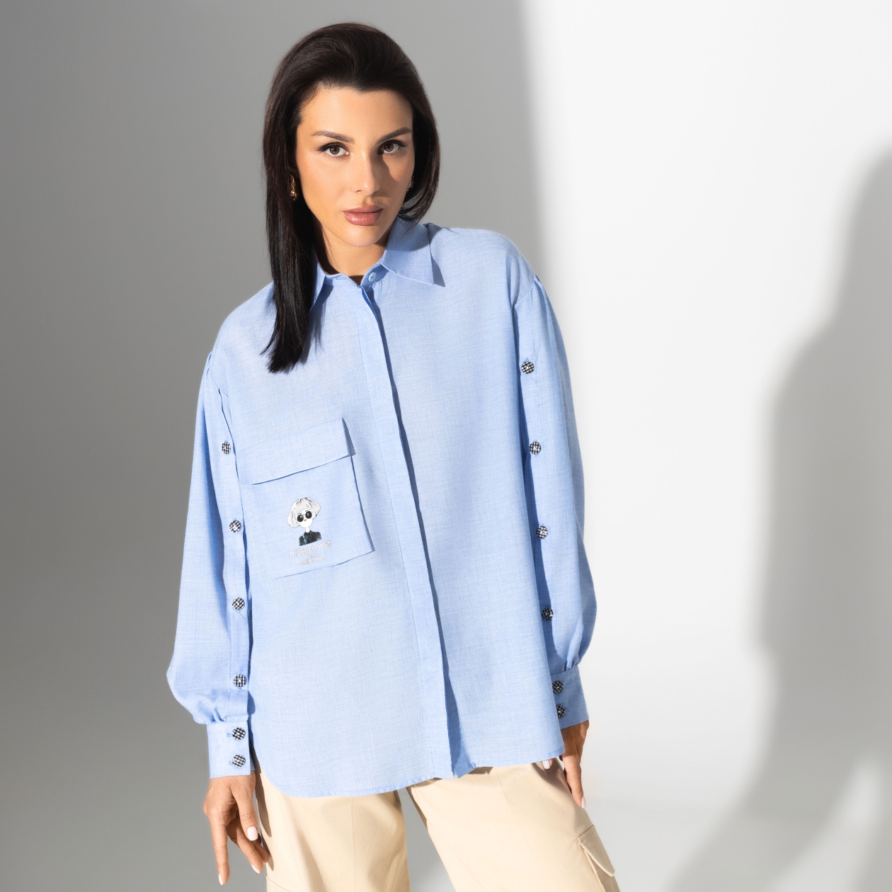 Пуговицы по всей длине рукава добавляют этой рубашке уникальности и функциональности. Этот элемент не только выделяет модель среди других, но и обеспечивает дополнительное удобство, позволяя легко изменять стиль рубашки под настроение и ситуацию. Покупая рубашку «Сюжет для роскоши» оптом, вы инвестируете в товар, который непременно привлечёт внимание покупателей и станет хитом продаж.