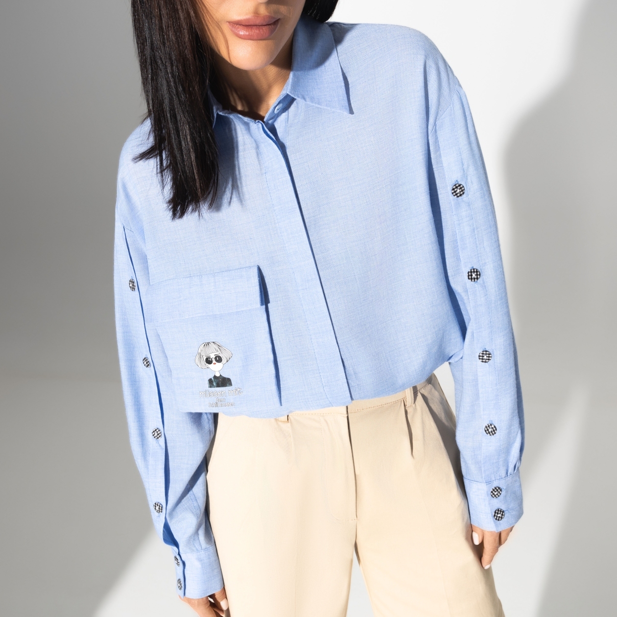 Быть на уровень выше – это о рубашке коллекции PREMIUM. Нежнейшая блузочная ткань и выверенный крой дополнены ярким и функциональным акцентом – пуговицами по всей длине рукава. Level up!