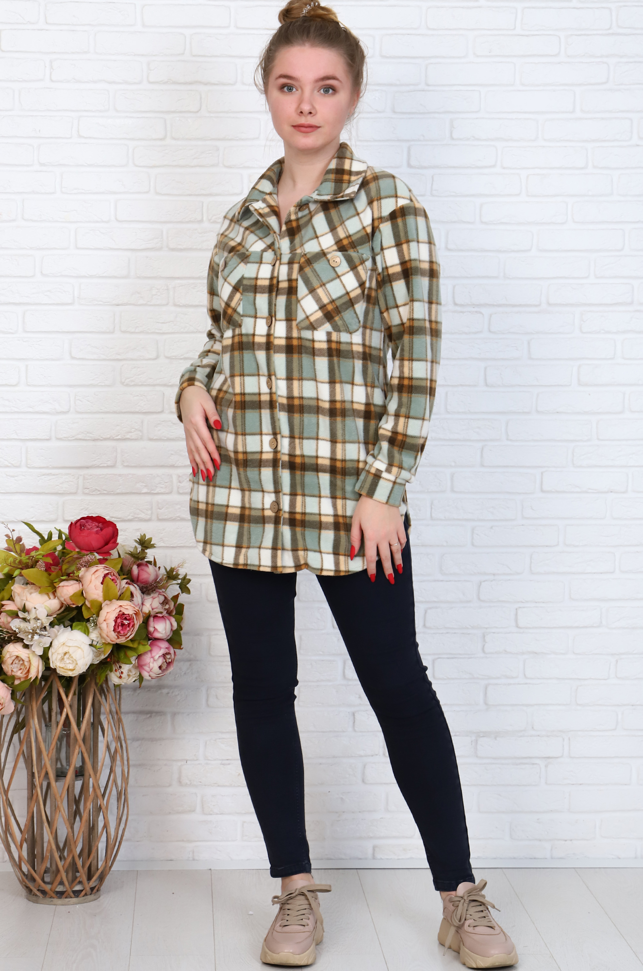 Уютная и стильная женская флисовая рубашка на пуговицах. На груди накладные карманы, красивый асимметричный низ. Такую рубашку можно носить как самостоятельно, так и в сочетании с майкой или футболкой.