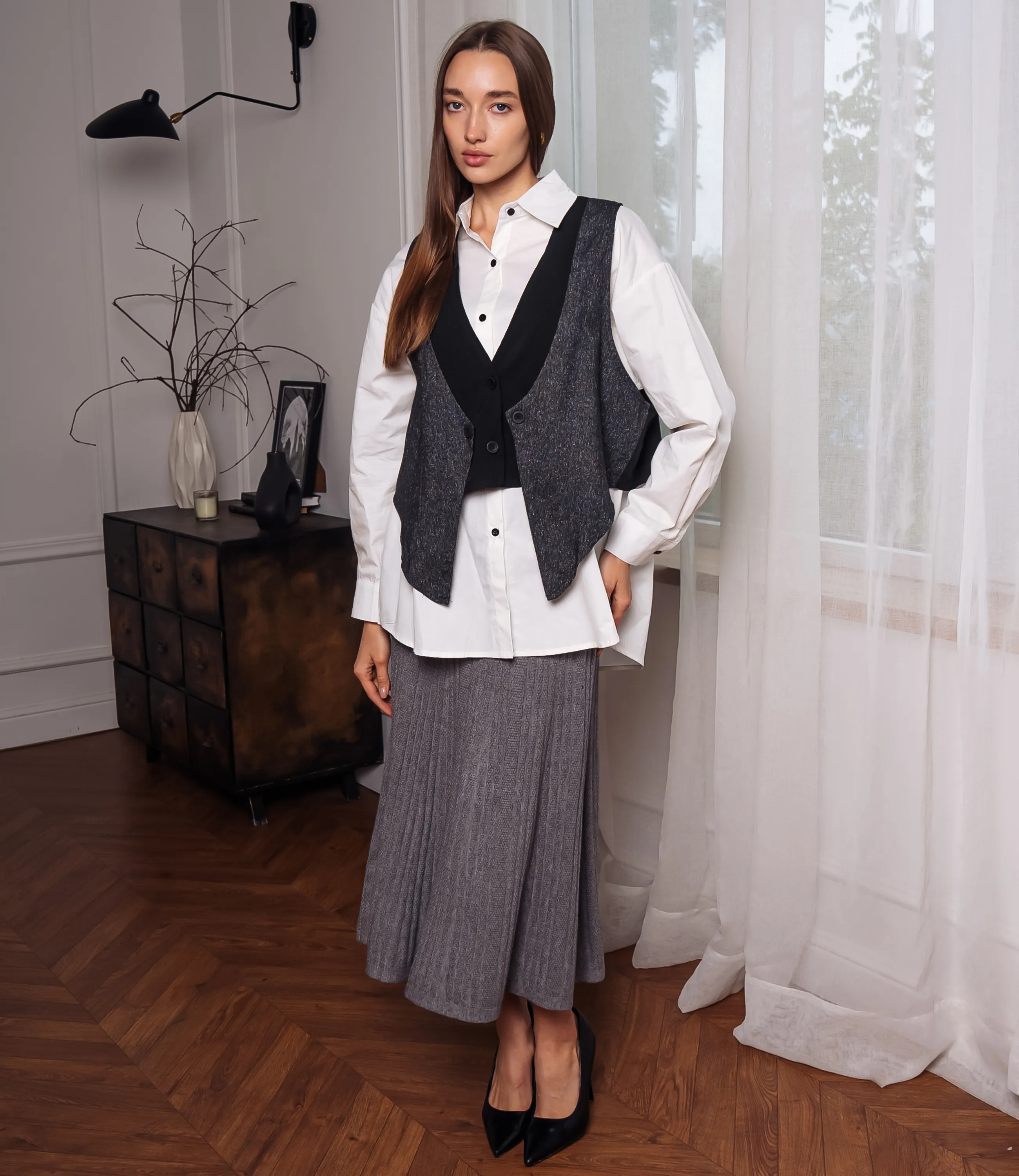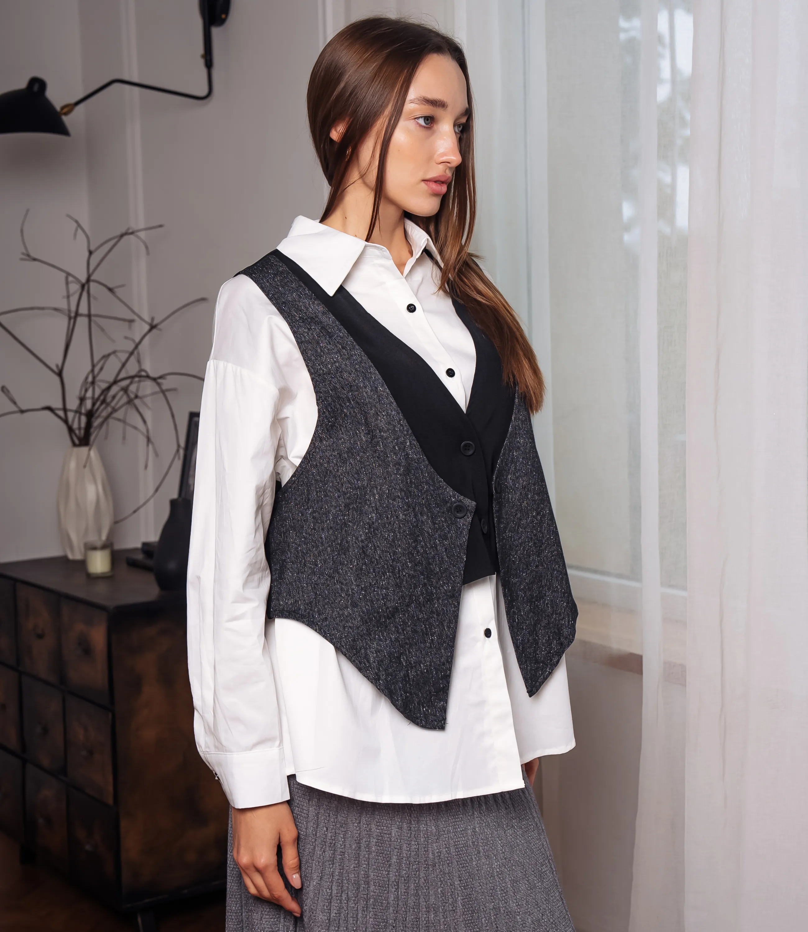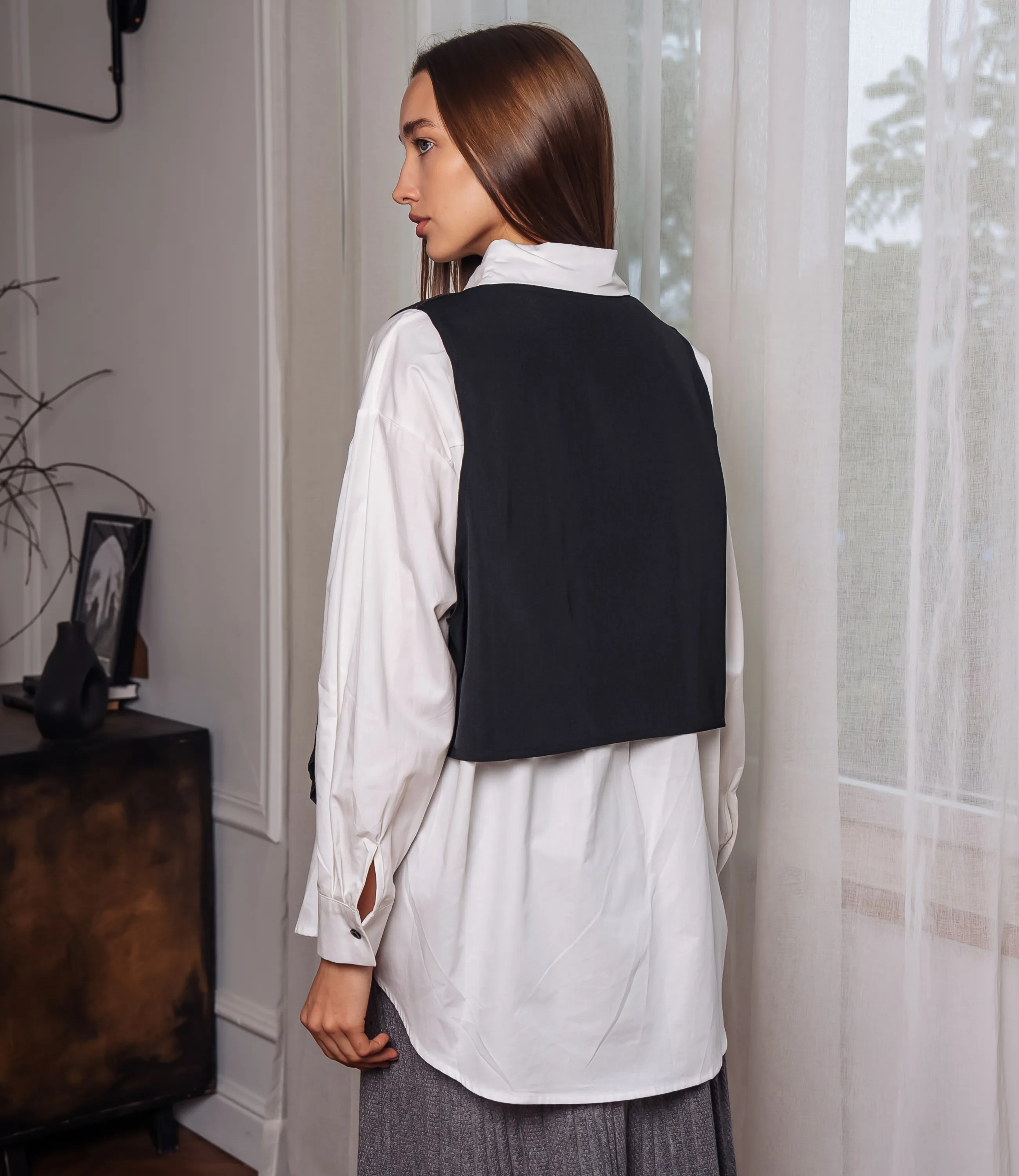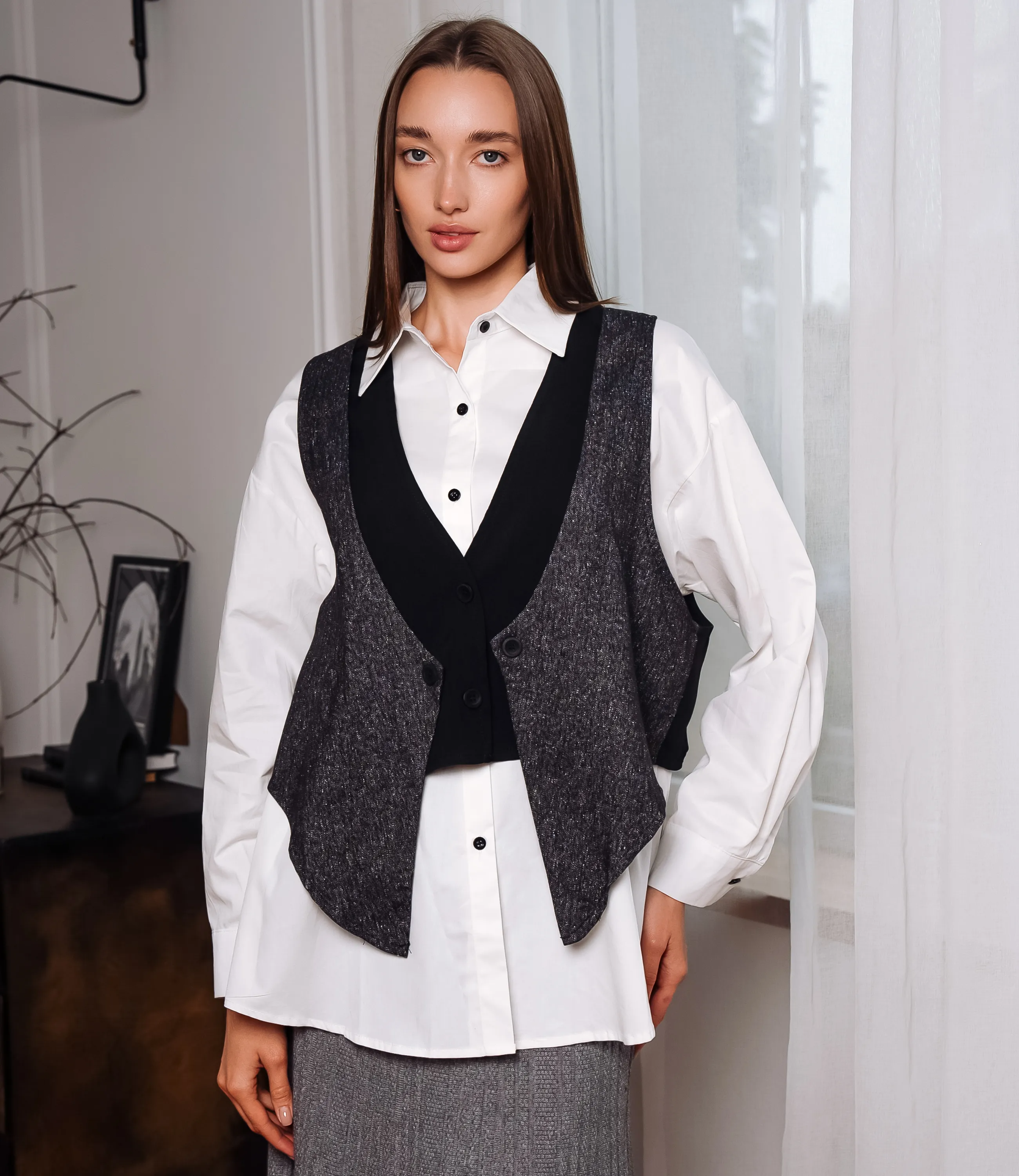 Рубашка + жилет - это часть гардероба, которая подчеркивает уникальность каждой женщины. Рубашка классического кроя, выполнена из гладкой лёгкой ткани с ровной плотностью, воротник остро-угловой, стойка средней высоты, планка с пуговицами спереди, видны аккуратные отделочные строчки вдоль воротника и по линии застёжки. Жилет многослойной конструкции, без рукавов, фигурный по линии низа с заострёнными передними концами; передняя часть выполнена из более плотного, структурированного материала с выраженной текстурой, спинка — более гладкая и тонкая, воротниковая вставка образует V‑образный вырез, переходящий в узкую лацканную форму, центральная застёжка на один крупный функциональный пуговичный ряд, плечевые линии узкие, сидит по фигуре свободнее на груди, формируя лёгкую драпировку по бокам. Для пошива выбрана ткань из 65% хлопка и 35% полиэстера, которая выделяется безупречным качеством. Даже после многократных стирок рубашка не утратит первоначальной привлекательности. Вы обязательно будете носить ее с радостью. Обратите внимание на глубокий цвет. Он соответствует фотографии на сайте. Чтобы вы не сомневались в размере, мы предоставили на странице таблицу. Воспользовавшись ею, вы сможете самостоятельно сделать мерки и удостовериться. Установленная нами цена является невысокой. Не откажите себе в удовольствии быть элегантной! Рост модели 168, 85-63-92. Вы можете заказать онлайн презентацию на интересующие Вас модели. Наши менеджеры свяжутся с Вами и проведут индивидуальную видеотрансляцию, помогут составить заказ и ответят на Ваши вопросы.