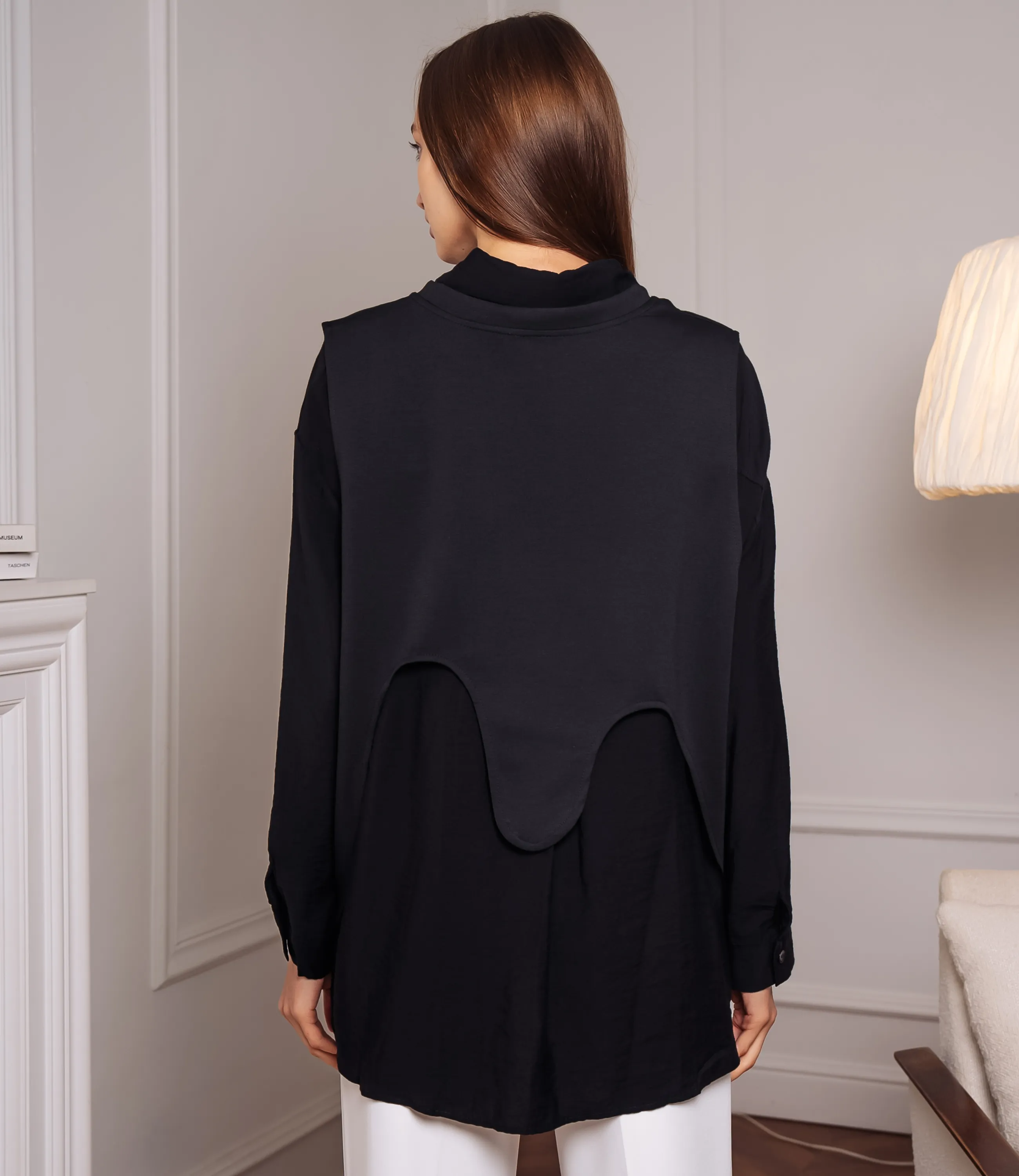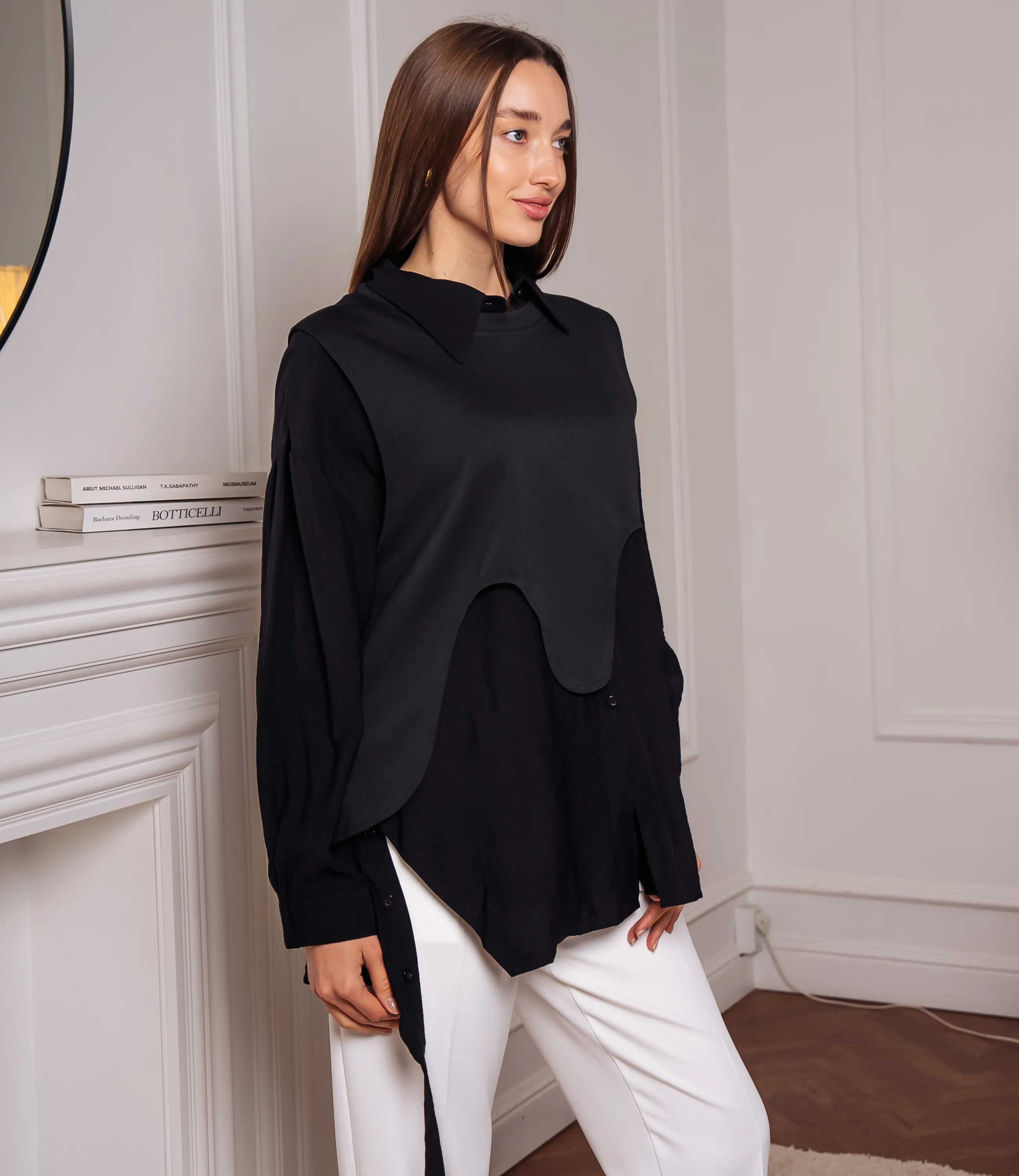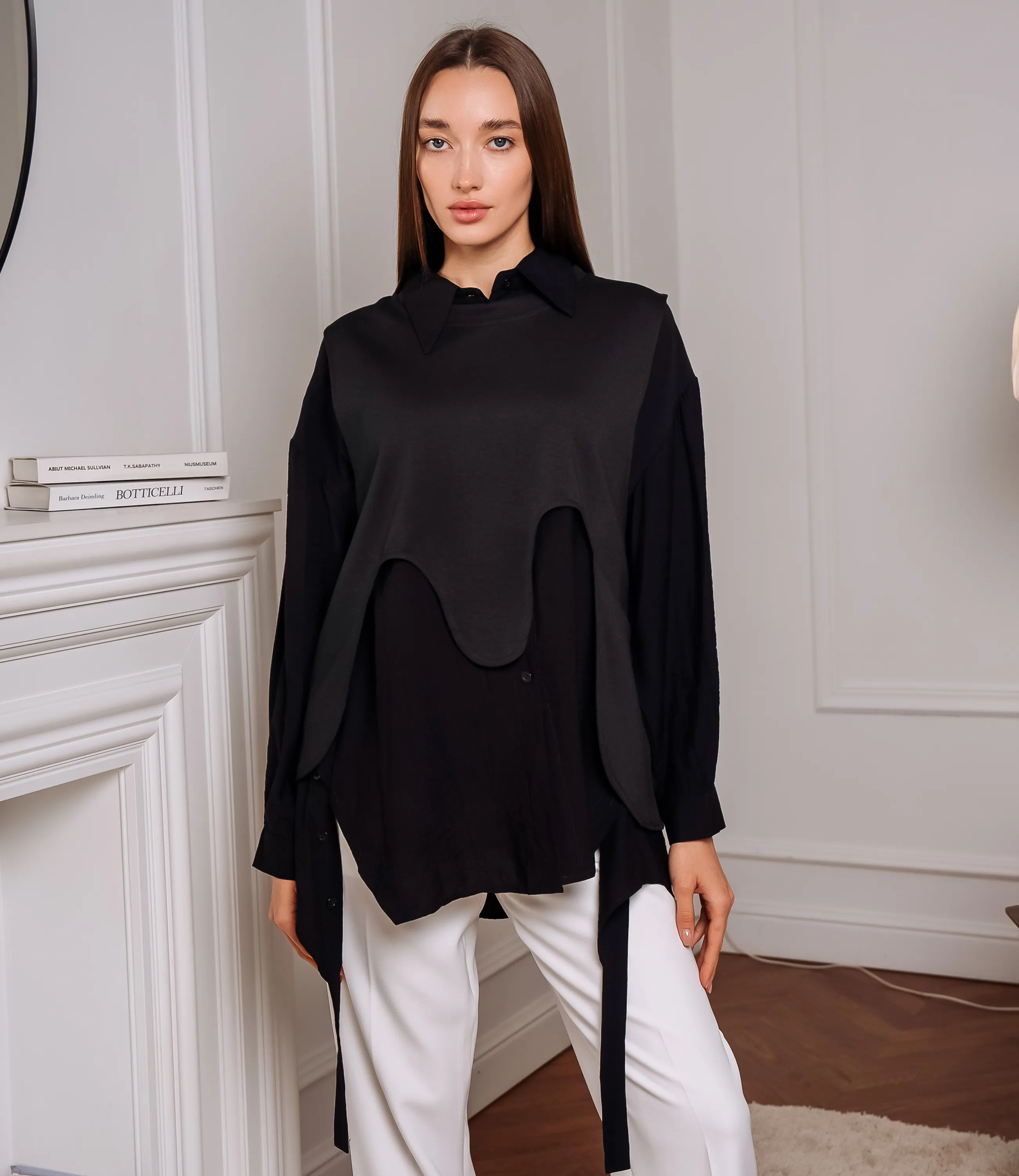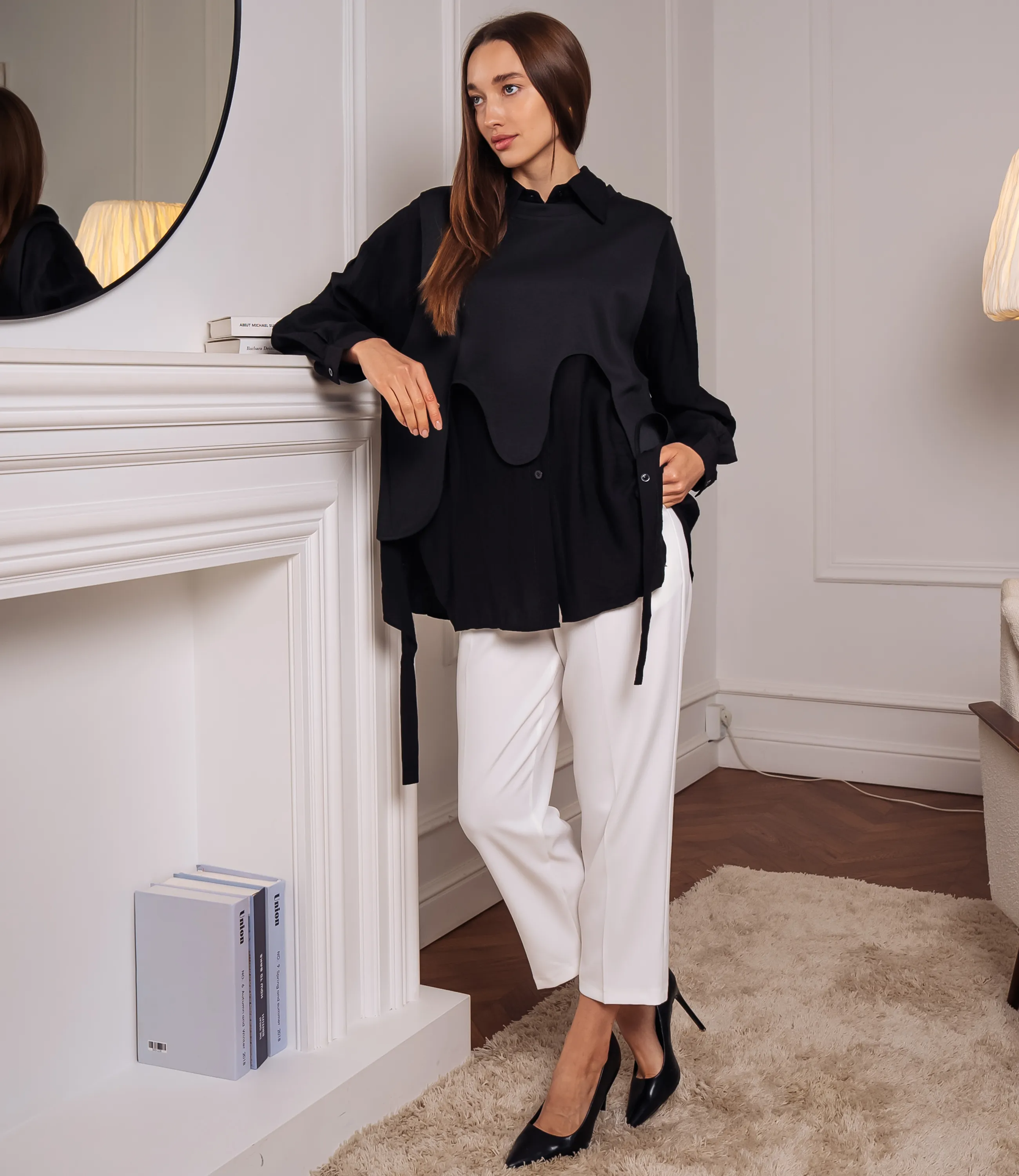Рубашка + жилет - это часть гардероба, которая подчеркивает уникальность каждой женщины. Рубашка имеет удлинённый свободный силуэт до середины бёдер с мягко спадающими вертикальными линиями и асимметричным низом: край неровный, с закруглениями и удлинёнными боковыми лентами. Воротник классический отложной с заострёнными концами, центральная застёжка на пуговицы, частично скрытая под накладным слоем жилета. Рукава длинные, с умеренным объёмом и стандартными манжетами на пуговицы. Жилет представляет собой укороченный накладной слой, закрывающий плечи и верхнюю часть туловища, с прямым ненасыщенным силуэтом и закрытой горловиной. Нижний край жилета выполнен в волнообразной форме с плавными арками, обнажающими часть рубашки. Для пошива выбрана ткань из 98% полиэстера и 20% хлопка, которая выделяется безупречным качеством. Даже после многократных стирок рубашка не утратит первоначальной привлекательности. Вы обязательно будете носить ее с радостью. Обратите внимание на глубокий цвет. Он соответствует фотографии на сайте. Чтобы вы не сомневались в размере, мы предоставили на странице таблицу. Воспользовавшись ею, вы сможете самостоятельно сделать мерки и удостовериться. Установленная нами цена является невысокой. Не откажите себе в удовольствии быть элегантной! Рост модели 168, 85-63-92. Вы можете заказать онлайн презентацию на интересующие Вас модели. Наши менеджеры свяжутся с Вами и проведут индивидуальную видеотрансляцию, помогут составить заказ и ответят на Ваши вопросы.