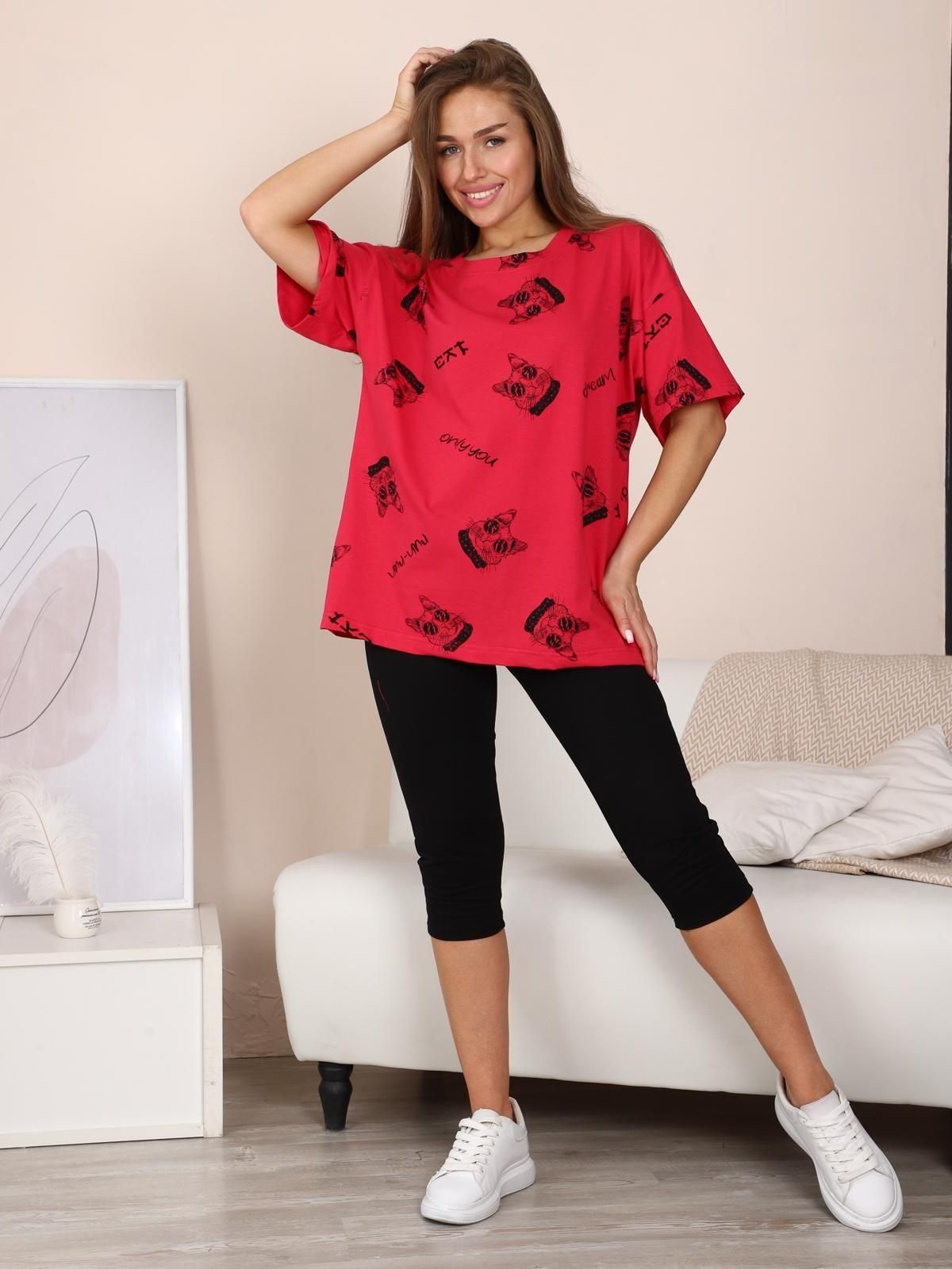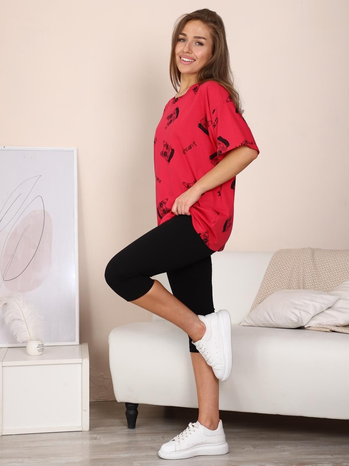 Костюм состоит из футболки и леггинсов. Футболка женская оверсайз, удлиненная. Леггинсы длиной до колен с удобным эластичным поясом.