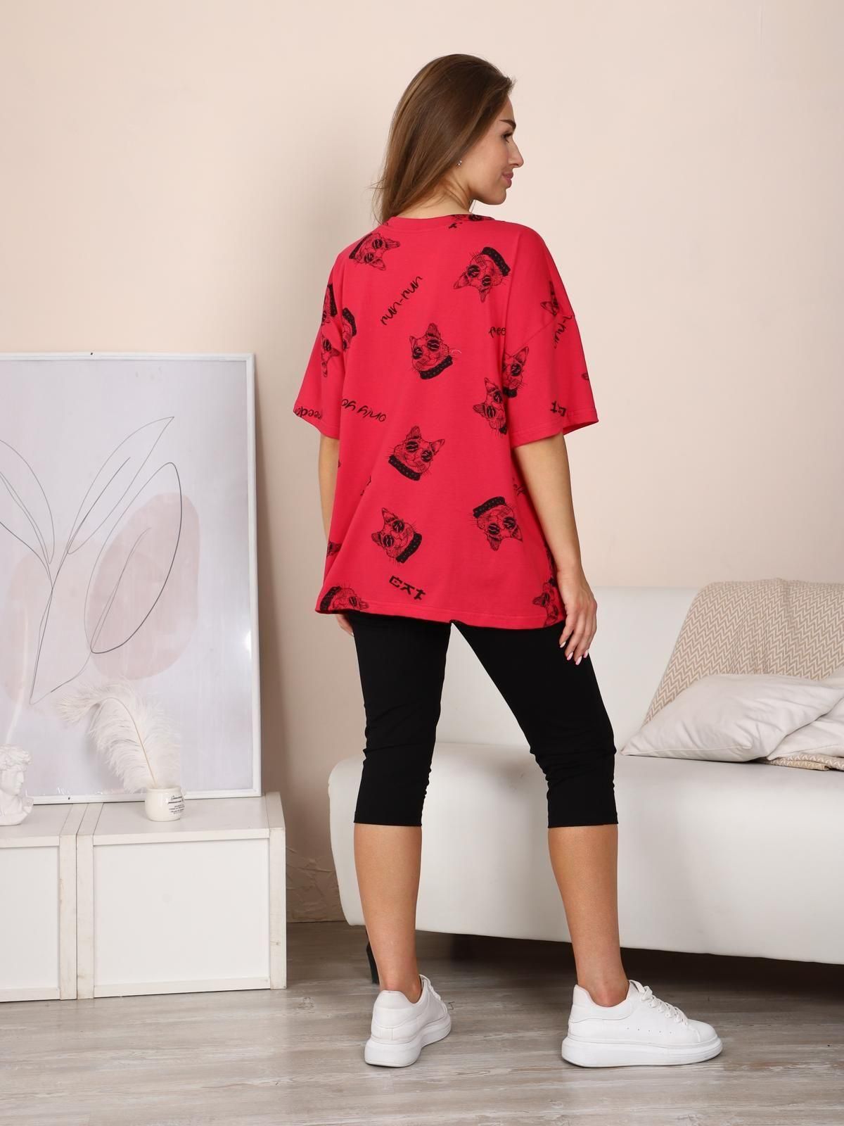 Костюм состоит из футболки и леггинсов. Футболка женская оверсайз, удлиненная. Леггинсы длиной до колен с удобным эластичным поясом.