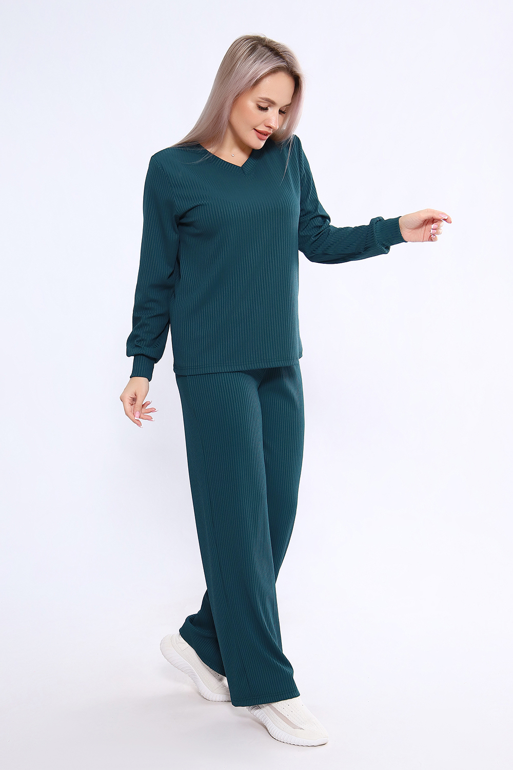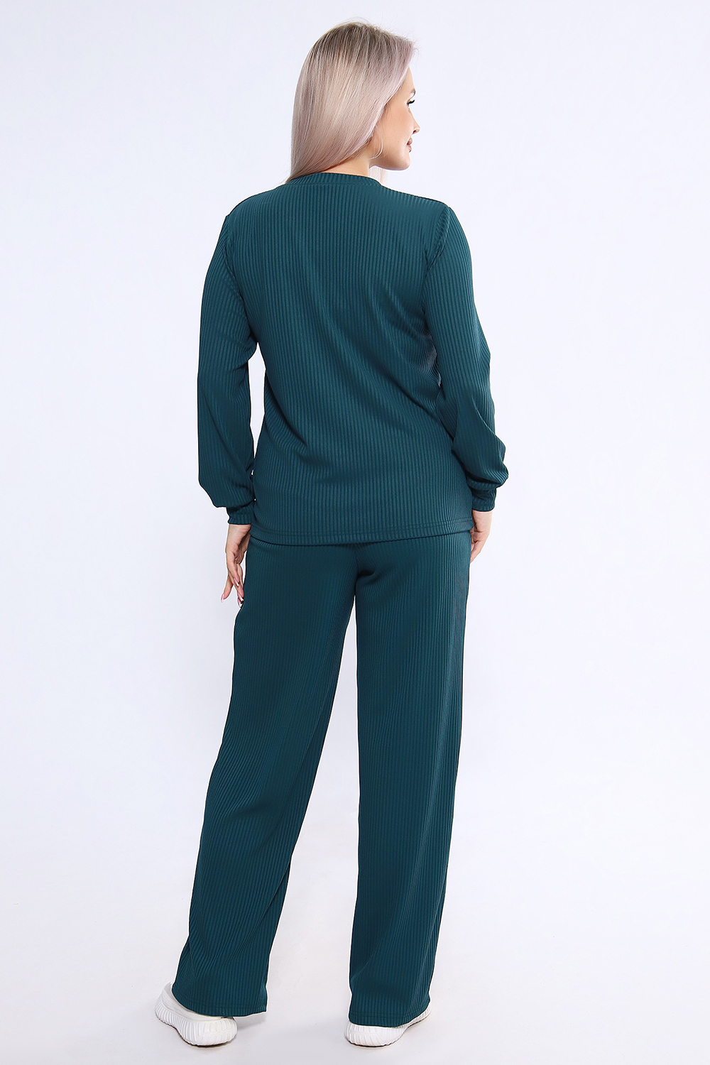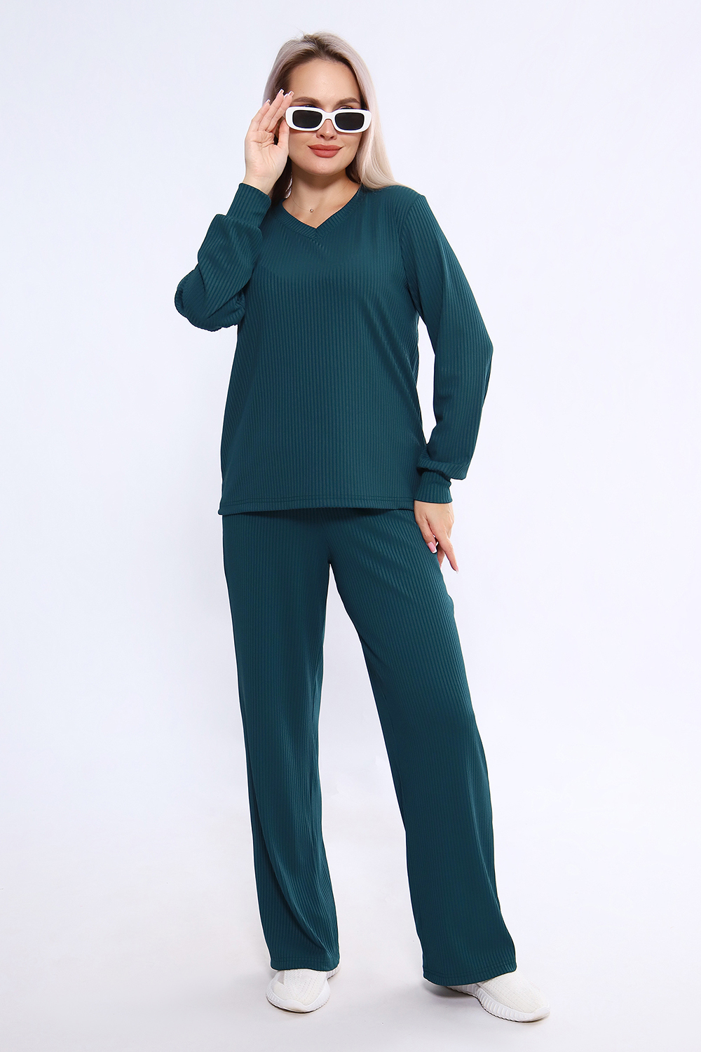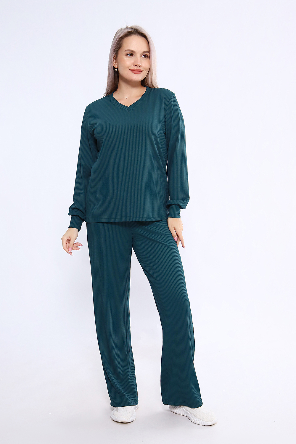 Женский костюм из трикотажа лапша (рубчик) состоит из лонгслива с длинными рукавами и манжетами и свободных брюк, выполнен из материала с преобладанием полиэстера (95%) и добавлением спандекса (5%), что обеспечивает комфорт и практичность. Костюм подходит как для повседневного ношения, так и в качестве домашней одежды, и представлен в широком размерном диапазоне от 46 до 60 Цвет: изумрудный;черный; Материал: лапша;лапша; Состав: п/э 95%, спандекс 5%.