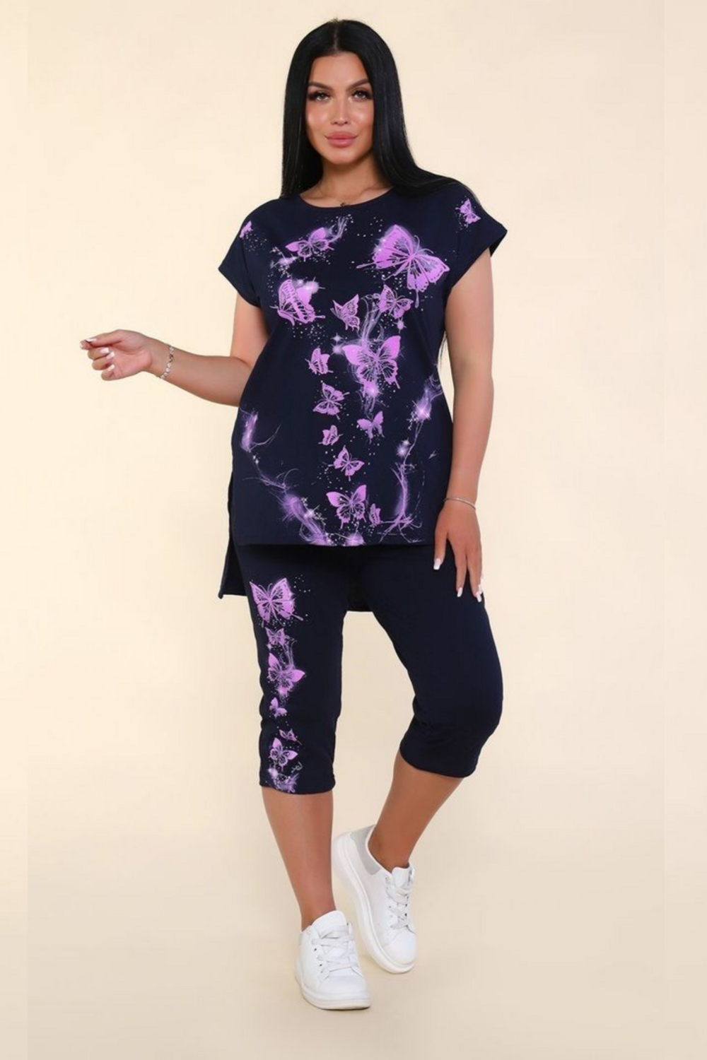 Элегантный анималистический принт в стиле Neo butterflies придаёт комплекту уникальность и делает его ярким акцентом в гардеробе. Темно-синий цвет изделия является универсальным и легко комбинируется с разнообразными аксессуарами и обувью, что позволяет создавать различные образы на каждый день.