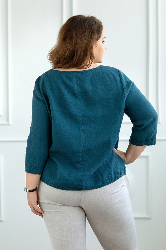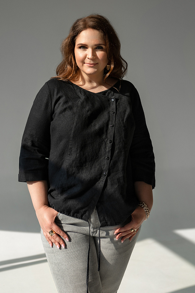 Блузам в женском гардеробе отводится значимая роль. Они выполняют много самых разнообразных задач, потому что это очень универсальный предмет гардероба. По средствам одной модели можно создать много различных дуэтов и образов. Поэтому их должно быть в достаточном количестве в вашем гардеробе. Но уверены, у женщин весомых достоинств возникают проблемы с этим. Производители не всегда могут порадовать эту категорию покупательниц разнообразием выбора. Не переживайте милые дамы, обратите внимание на представленную модель блузы из натурального льна! Оригинальный и лаконичный образ порадует вас, а натуральная ткань подарит массу приятных тактильных ощущений. Прямой крой не обтягивает фигуру, маскируя проблемные участки. Кулиса по низу позволяет придать силуэтным формам шарм и обаяния. Смещённая ассиметричная застёжка на пуговицы не только выполняет свой функционал, но и является яркой декоративной частью блузы. Лёгкости внешнему виду придаёт отсутствие каких-либо воротников. Округлый вырез горловины, обработанный кантом логичен в духе всей стилистической задумки.