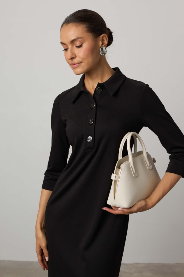 Платье полуприлегающего силуэта из плотного трикотажа. Рукав втачной прямой и укороченный на манжете. Спереди декоративная функциональная планка, застежка на петлю и пуговицы на ножках. Отложной воротник. На спинке кокетка и средний шов с разрезом по низу изделия.