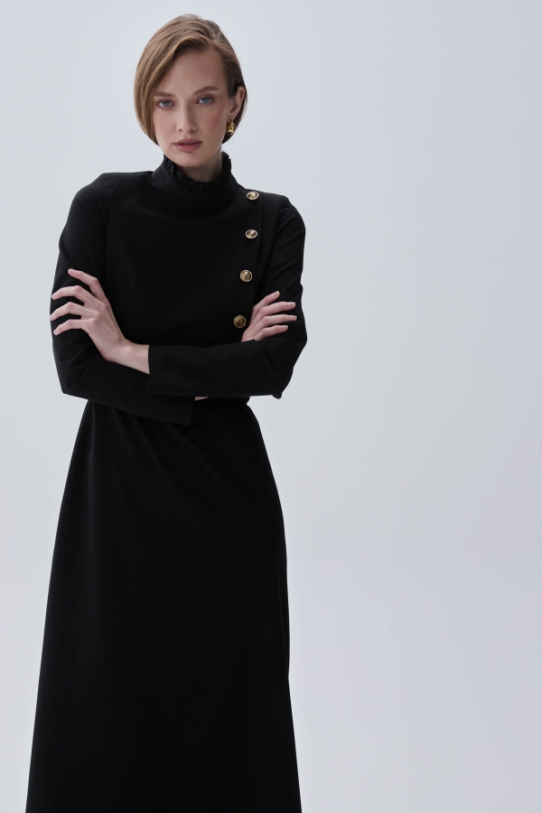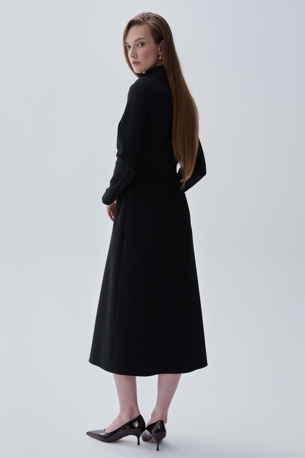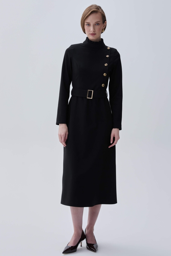 Женственное платье из костюмного полотна на подкладке. Приталенное платье А-силуэта, отрезное по талии и с втачным прямым рукавом. По горловине стойка с рюшей. Застежка на потайную молнию. Декоративные пуговицы на полочке. Пояс с пряжкой из основной ткани в комплекте.