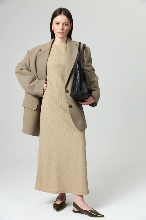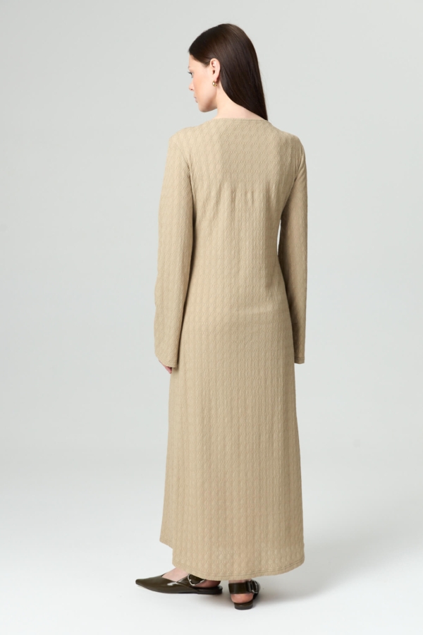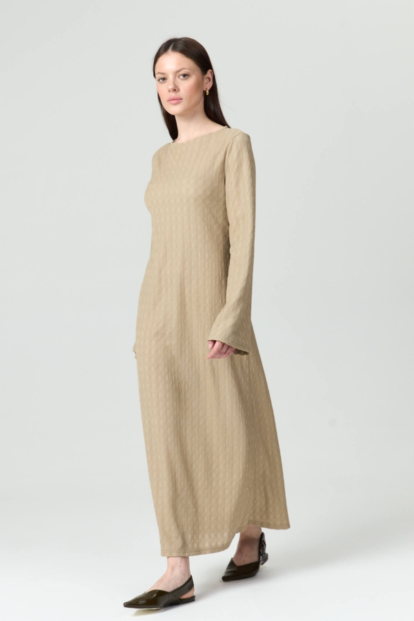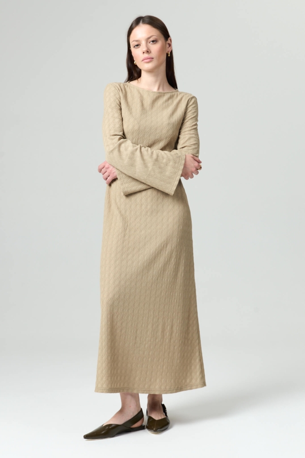 Платье из фактурного трикотажного полотна. Модель полуприлегающего силуэта, расширенная к низу. Рукав втачной, расклешенный.